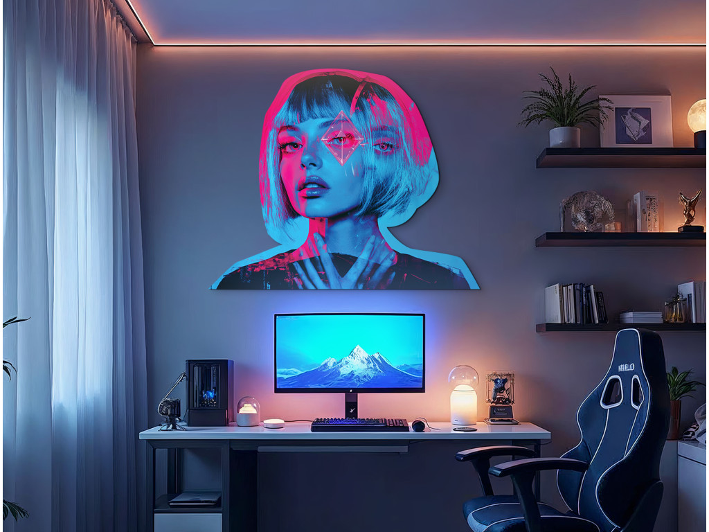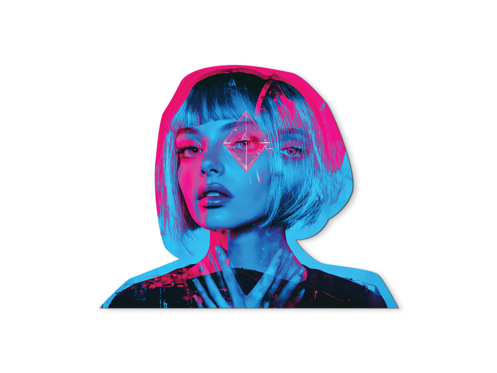 Dieses Porträt einer Frau mit kurzen Haaren vereint Schönheit und kühle Präzision einer futuristischen Welt. Neonlicht in Rosa- und Blautönen wirft dramatische Schatten auf ihr Gesicht, während das Symbol auf ihrer Stirn – das an einen Diamanten mit Visier erinnert – auf digitale Identität, erweiterte Realität oder kybernetische Kontrolle hindeutet. Das Werk evoziert Cyber-Ästhetik und Fragen der Individualität in einer technologisierten Welt.