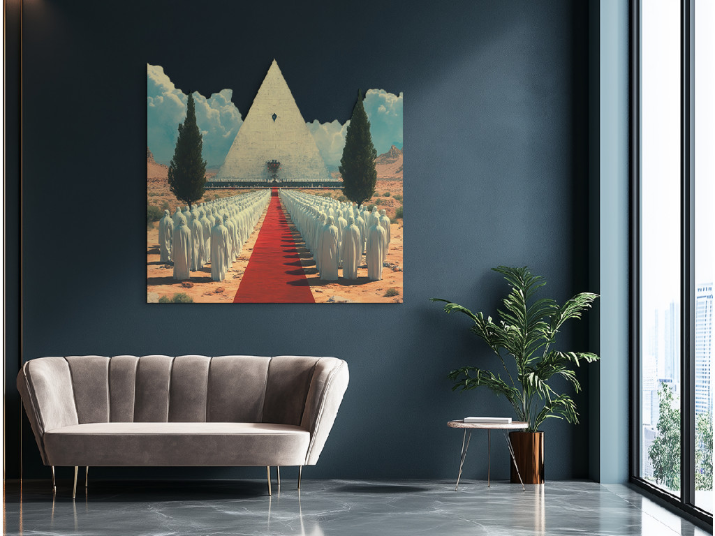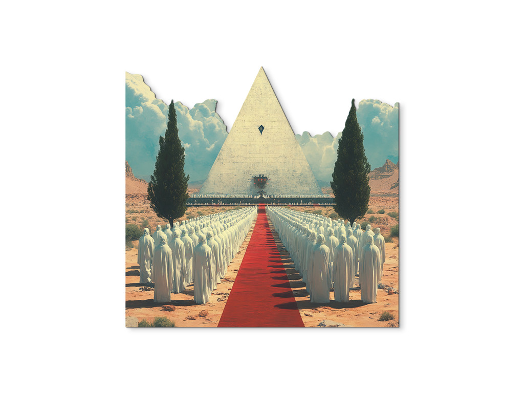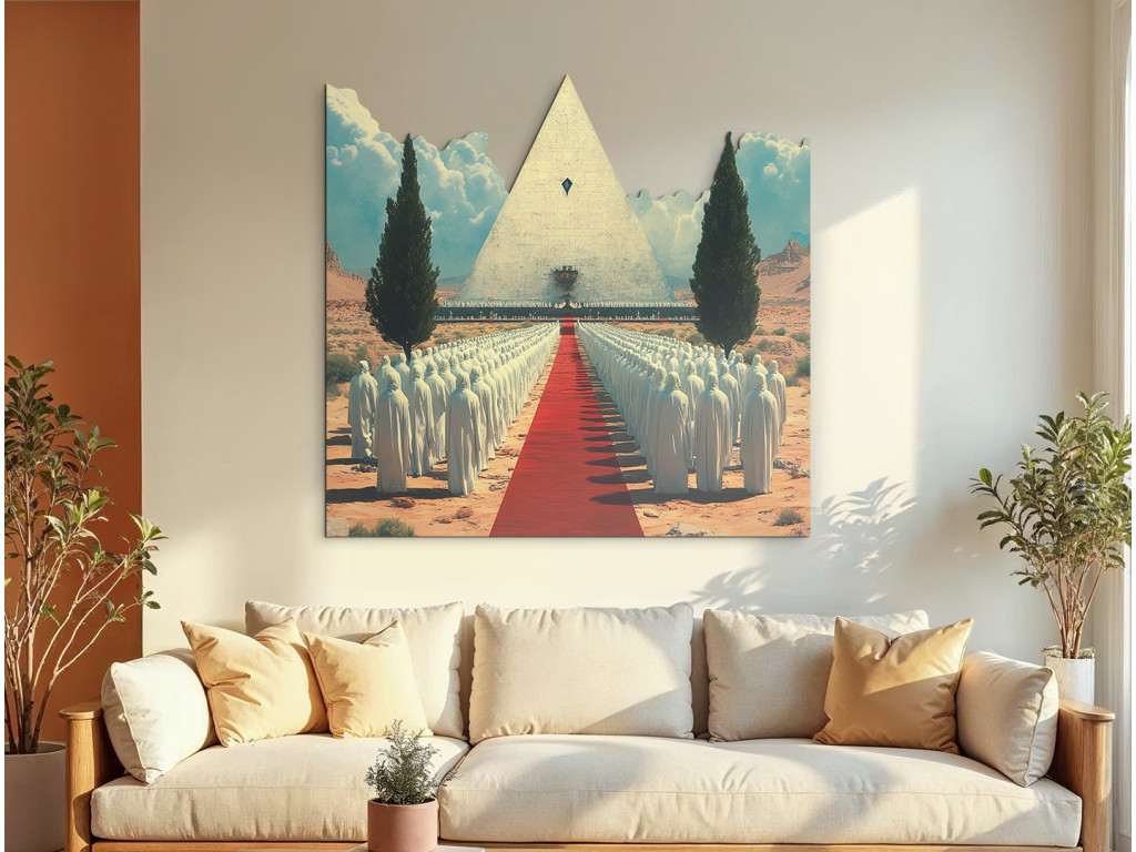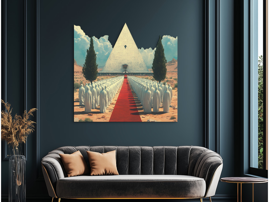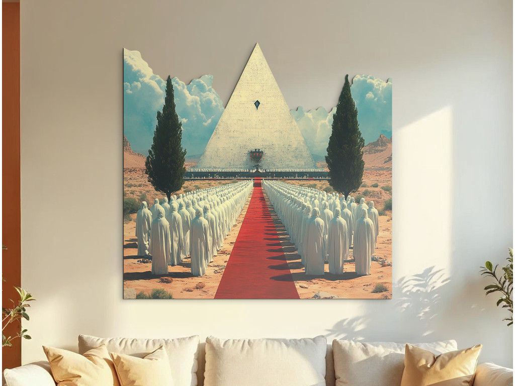 Die geheimnisvolle Wüstenszene zeigt eine Pilgergruppe in weißen Gewändern, die auf einem roten Teppich zu einer Pyramide mit einem allsehenden Auge schreitet. Die Symbolik und Komposition erinnern an antike Rituale, Esoterik und spirituelle Einweihung.