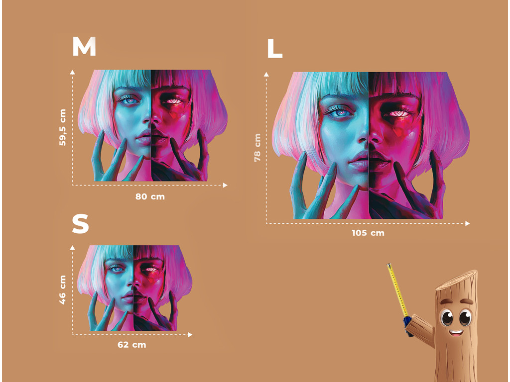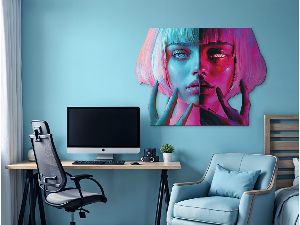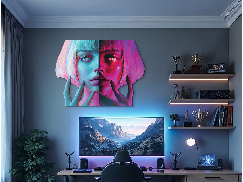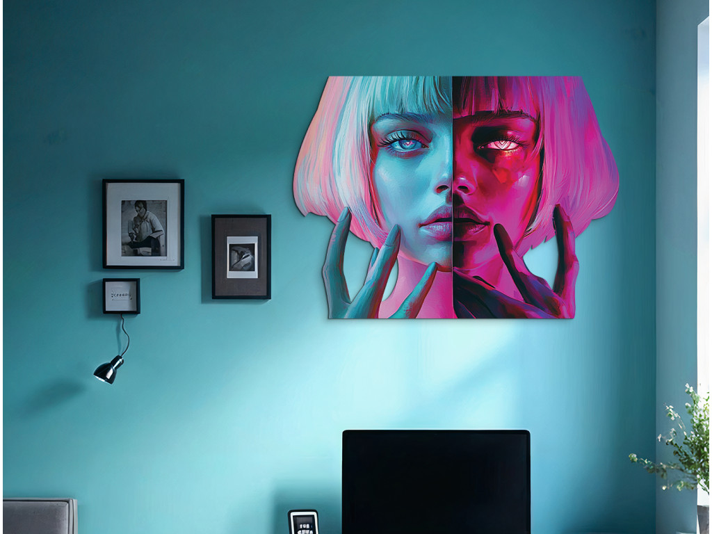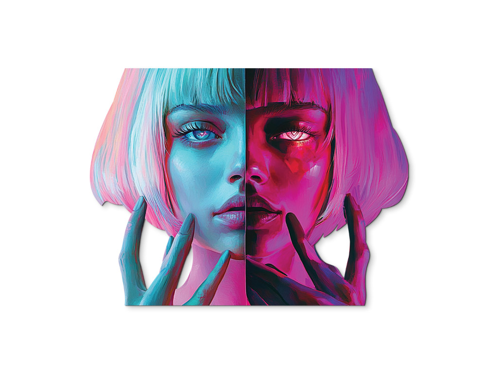 Dieses Fantasy-Gemälde zeigt ein weibliches Gesicht, das in zwei Hälften geteilt ist, von denen jede eine andere Farbgebung, Stimmung und Beleuchtung aufweist. Die eine Seite strahlt in warmen Lichttönen, während die andere in dunklere, kühlere Farbtöne getaucht ist, wodurch ein Kontrast zwischen Licht und Schatten, Bewusstsein und Unterbewusstsein, Ruhe und Unruhe entsteht. Die Komposition vermittelt den Eindruck eines inneren Kampfes, eines Gleichgewichts oder einer Transformation.