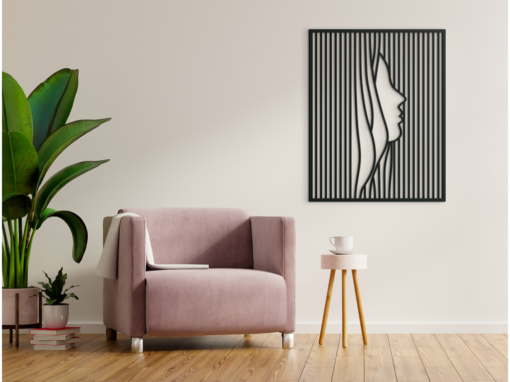 Das Holzbild im minimalistischen Stil zeigt eine Frau mit Haaren. Das Bild verbindet moderne Elemente, sodass es in verschiedene Räume passt. Es wird das ideale Accessoire für Innenräume verschiedener Stilrichtungen sein.
