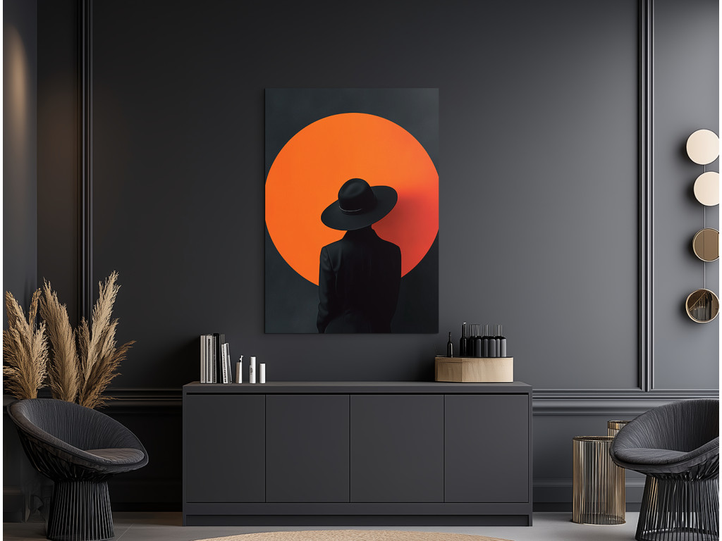 Das minimalistische Bild zeigt die Silhouette einer Frau mit einem Hut, die vor einem auffälligen orangefarbenen Kreis steht, der an die Sonne oder den Mond erinnert. Das Bild verwendet einfache Linien, gedämpfte Farben und den Kontrast zwischen Figur und Hintergrund, wodurch eine elegante und zeitlose Komposition entsteht.