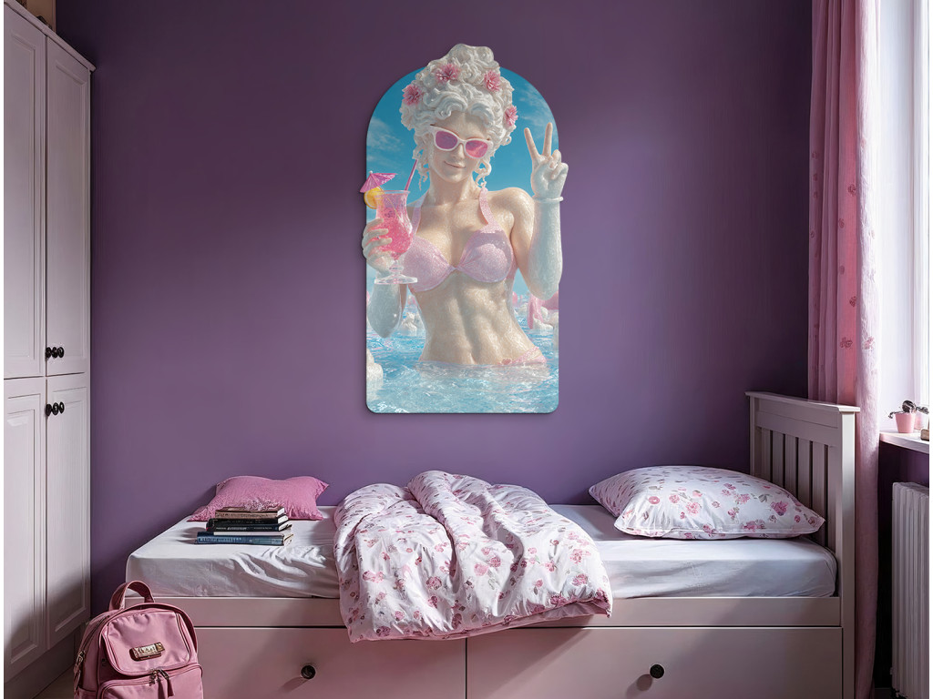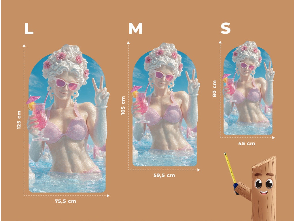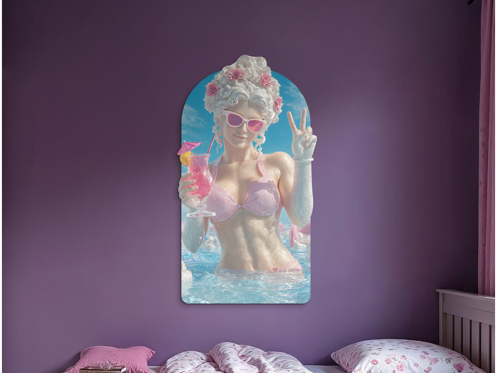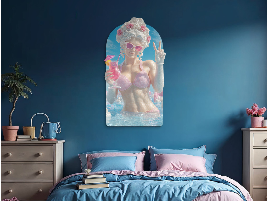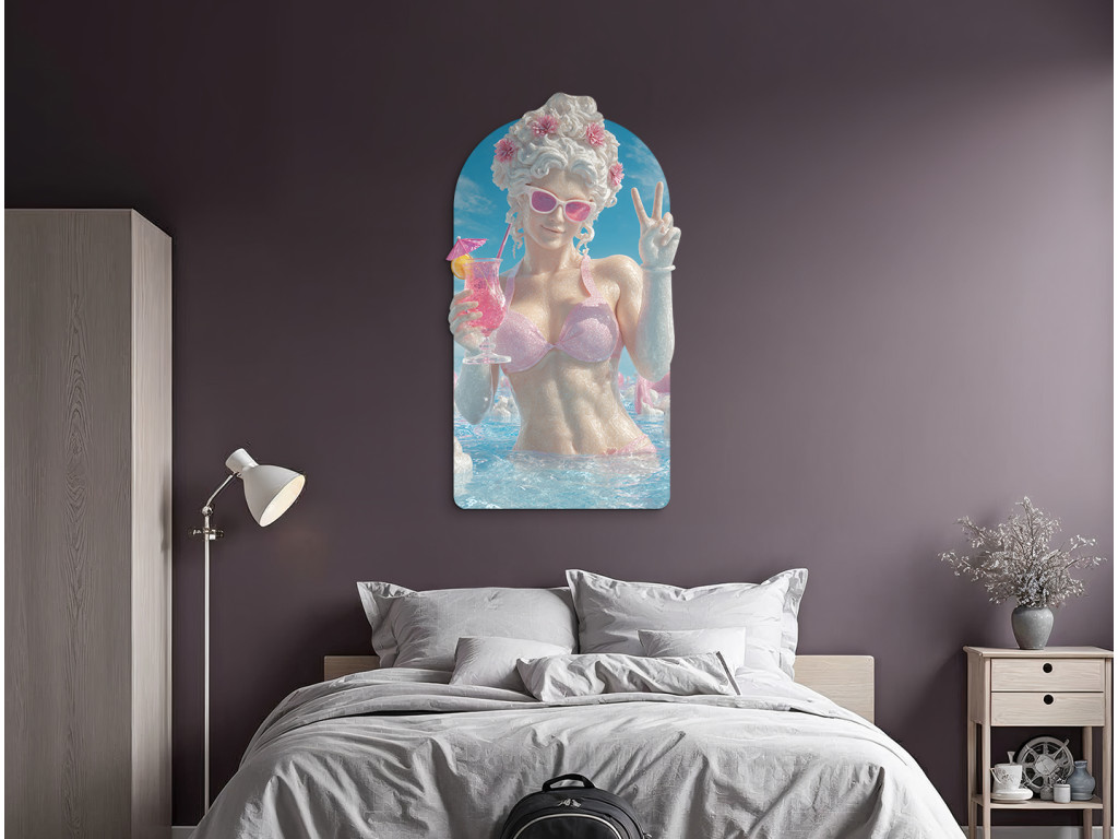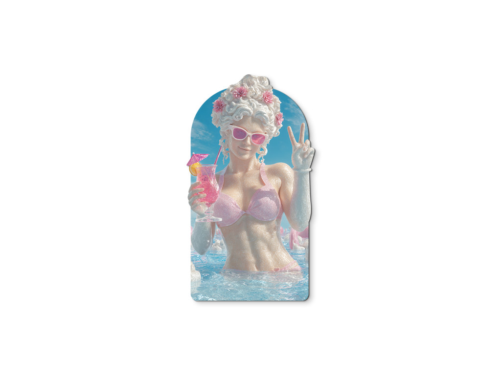 Eine klassische weibliche Skulptur im Bikini genießt einen Sommercocktail im Pool. Rosa Sonnenbrille im modernen Stil, romantische Frisur mit Blumen und Friedensgeste vervollständigen den modernen, ironischen Blick auf antike Schönheit in Urlaubsstimmung.