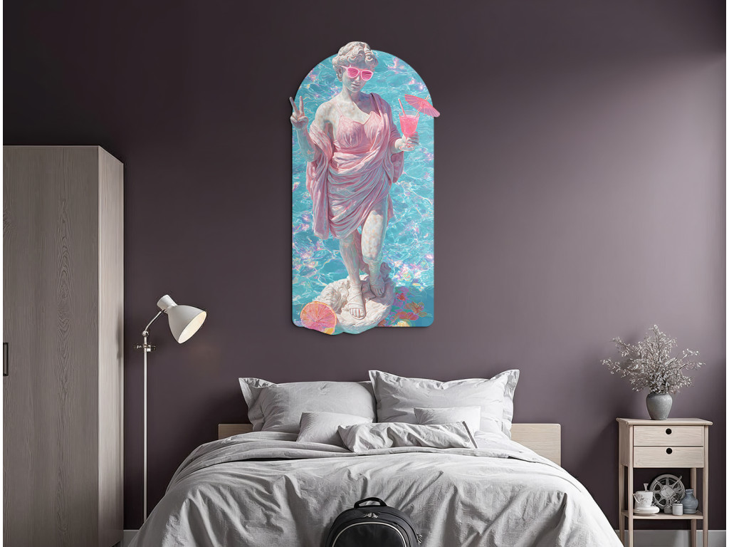 Die Skulptur im griechisch-römischen Stil wird in einem unerwarteten Sommerlook dargestellt – mit einem rosa Gewand, Sonnenbrille und einem Drink in der Hand. Die sommerliche Stimmung und die Retro-Farben schaffen einen Kontrast zwischen Klassik und Popkultur und ergeben ein witziges, stilvolles Bild mit einem Hauch von Urlaub in den 80er Jahren.