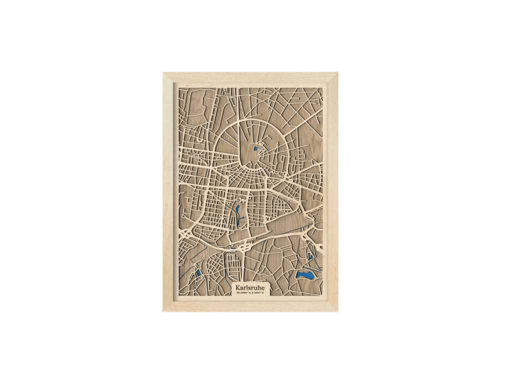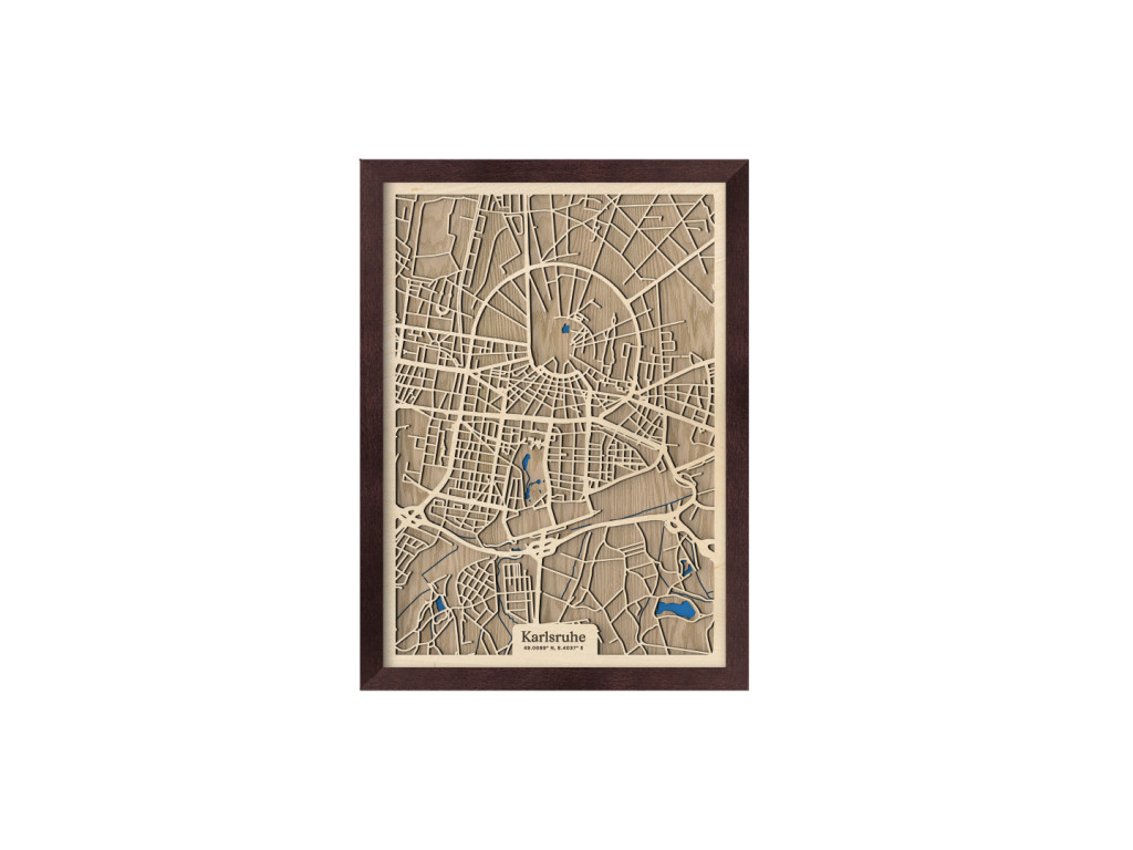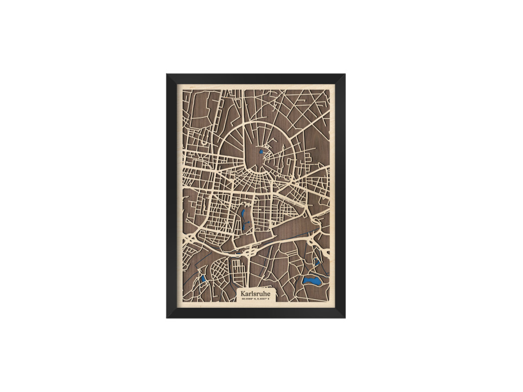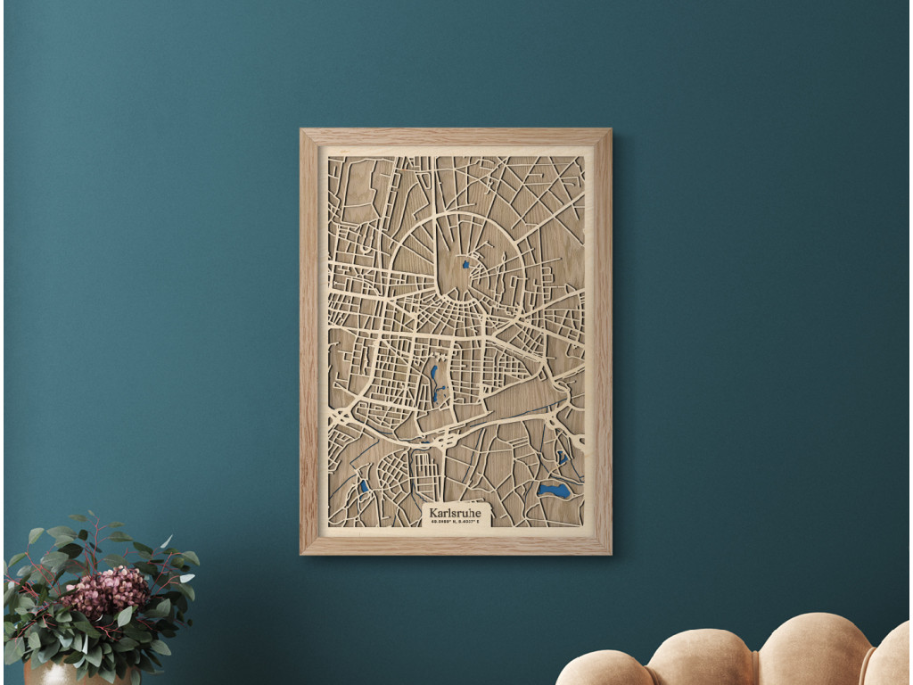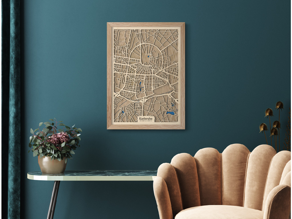 In der Kollektion drevko CITY präsentieren wir Ihnen einen Stadtplan der Karlsruher Innenstadt, die oft auch als „Fächerstadt“ bezeichnet wird. Dank der Anordnung der Straßen dreht sich hier alles um das majestätische Schloss, und so ist der Blick aus der Vogelperspektive auf die Straßen und Wasserflächen der Stadt sehr interessant, den wir in unserem Holzbild festgehalten haben. Sie können die Farben und Größe der Karte aus unserem Sortiment ganz einfach kombinieren, so dass Sie ein Stück dieser kleinen Stadt aus Baden-Württemberg direkt in Ihren eigenen vier Wänden genießen können.