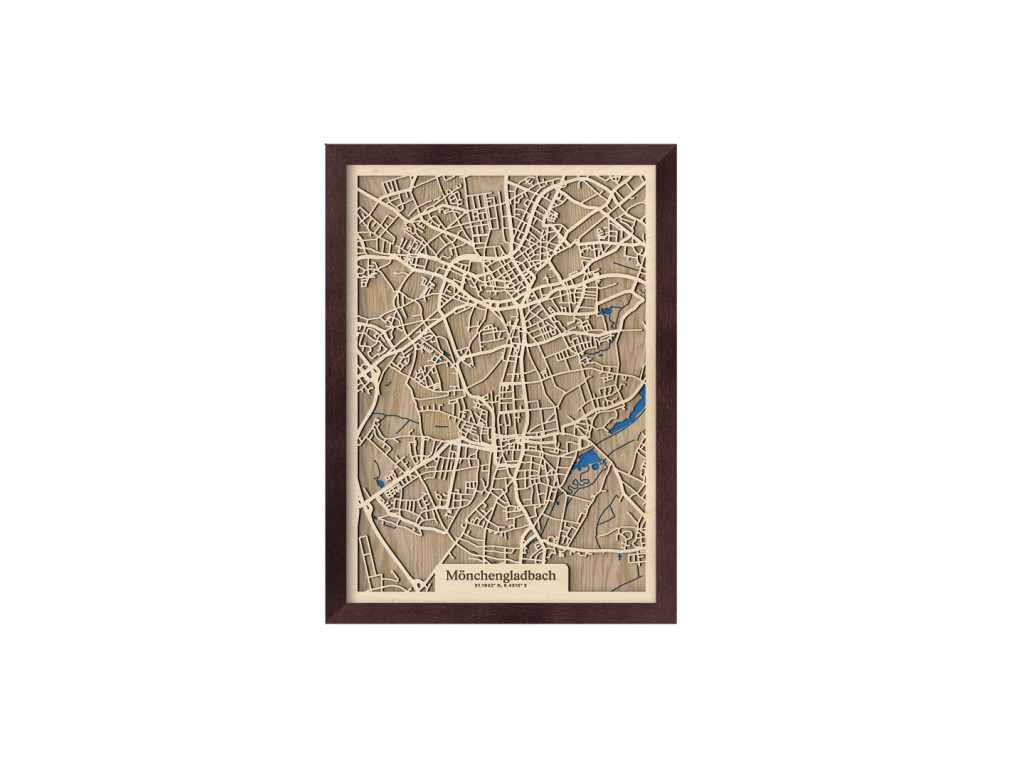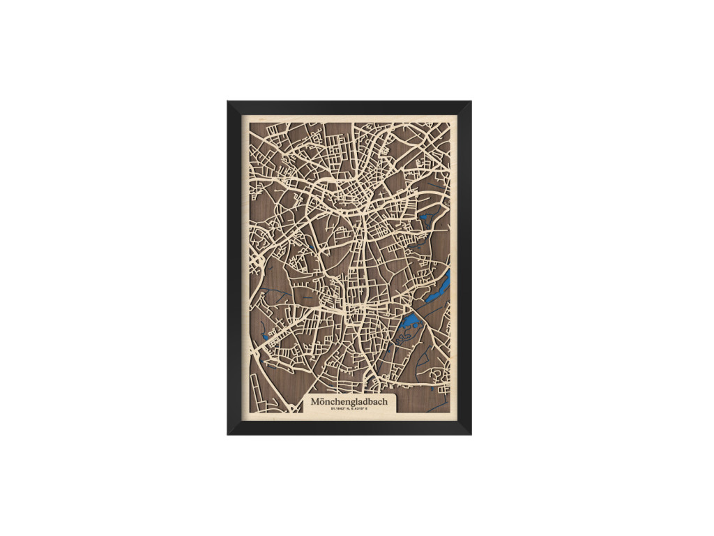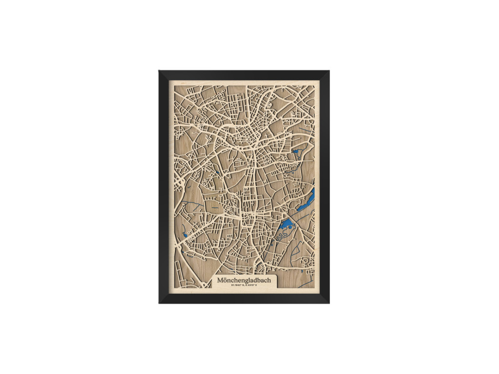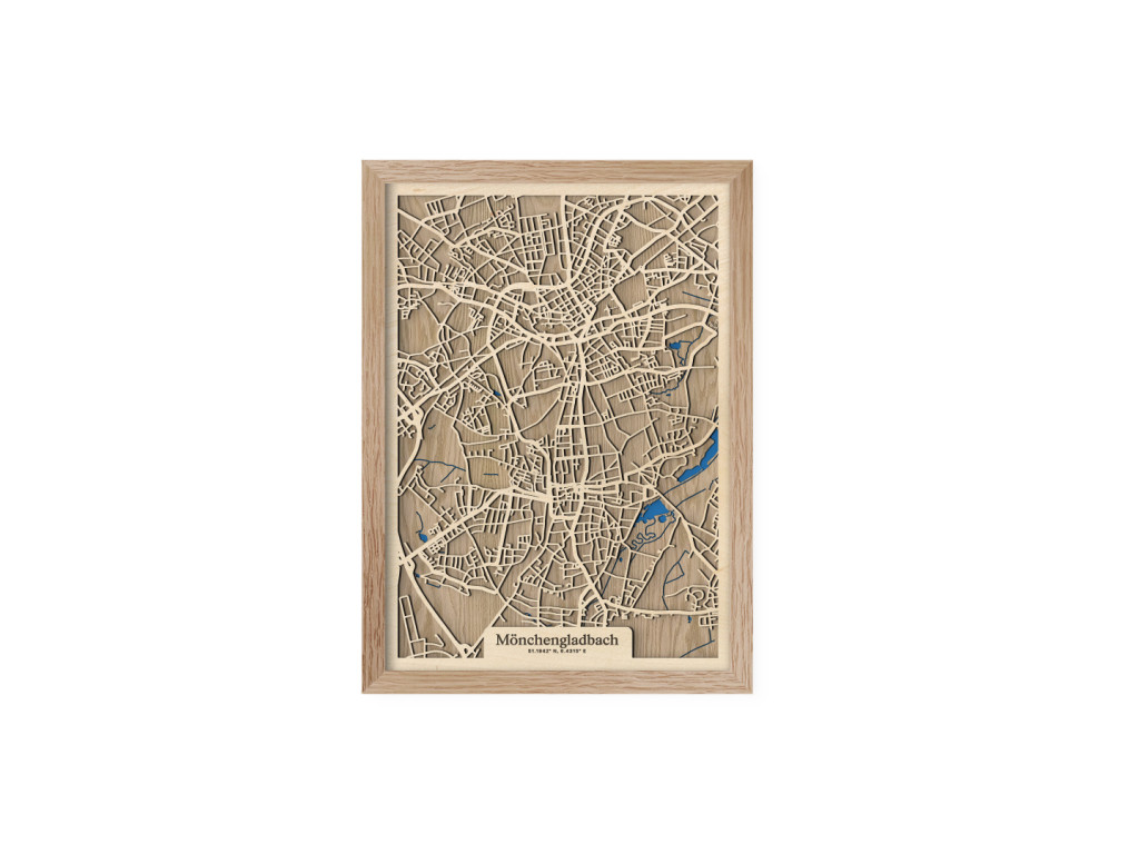 Wir stellen ein weiteres Stück aus der Kollektion drevko CITY vor - eine 3D-Karte von Mönchengladbach, einer lebendigen Stadt im Westen Deutschlands, die nicht nur eine reiche Fußballtradition, sondern auch viel Grün und einladende Parks zu bieten hat. In unserer detaillierten Holzdarstellung haben wir die historischen Straßen und die einzigartige Atmosphäre des Flusses Niers, der durch die Außenbezirke von Mönchengladbach fließt, originalgetreu eingefangen. Gerne passen wir sowohl die Farbgestaltung als auch die Größe an, damit Sie dieses urbane Kleinod ganz nach Ihrem Geschmack gestalten können.