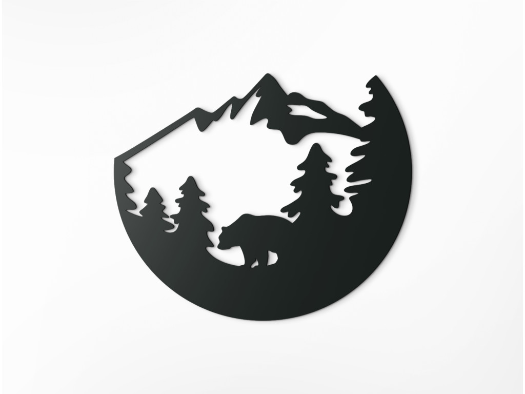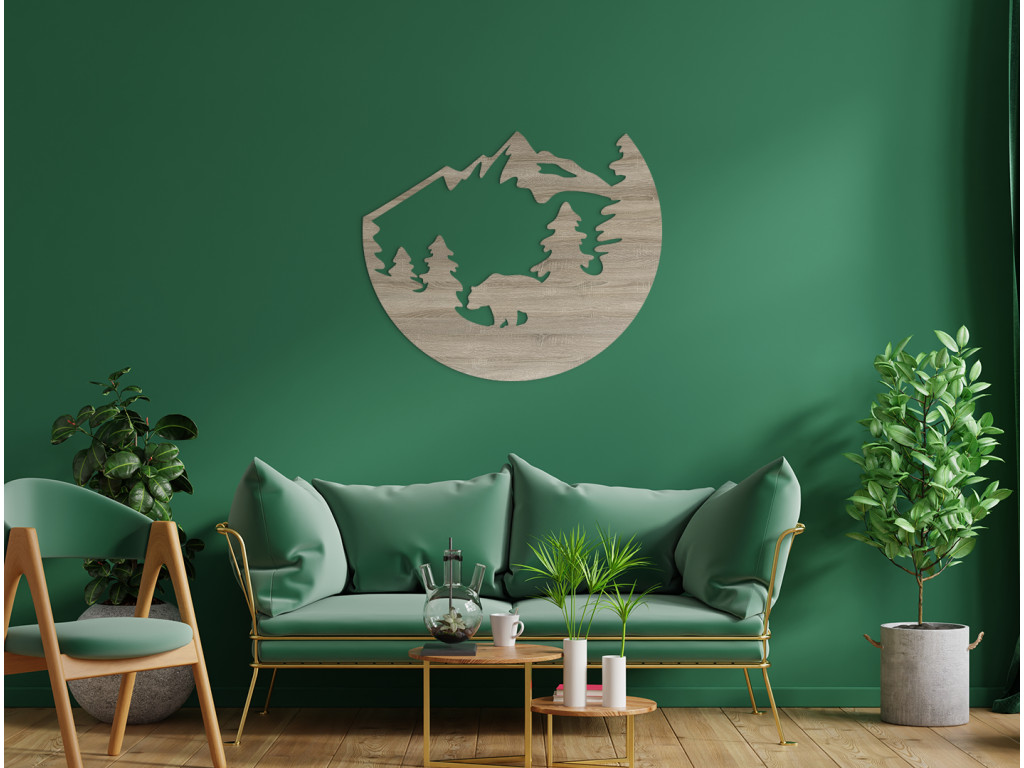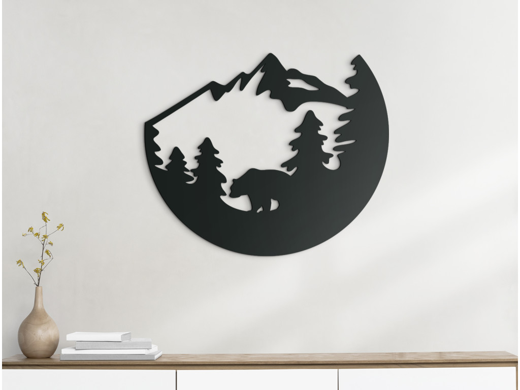 Sie lieben die Natur? Holen Sie sich Natur ins Haus. Das ausgeschnittene Bild BÄR IM WALD wird an jeder Wand eine gute Figur machen. Es zeigt einen Bären, der durch den Wald läuft. Über ihm erstreckt sich ein Berg. Das Bild ist in einem modernen Stil gehalten, sodass es zu jeder Inneneinrichtung passt.