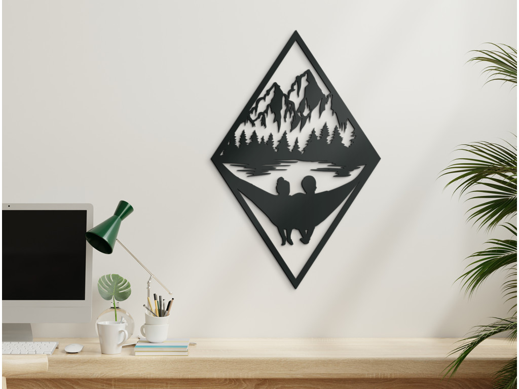 Dieses originelle Holzbild kann auch Ihre Wohnzimmerwand verschönern. Das verliebte Paar, das darauf abgebildet ist, genießt vom Schaukelnetz aus einen wunderbaren Ausblick. Das Bild besteht aus einer hochwertigen HDF-Platte mit 3 mm Stärke. Sie können unter mehreren Farbdekors und Größen wählen.