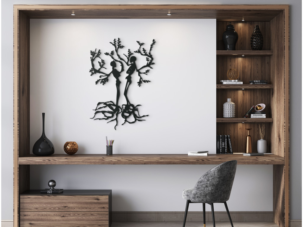 Das dekorative Holzbild mit Bäumen für die Wand mit den Figuren von Menschen ist ein hervorragendes Geschenk. Es zeigt einen Mann und eine Frau, aus denen die Äste von Bäumen wachsen. Die Dekoration eignet sich für kleine und auch für große Räume.