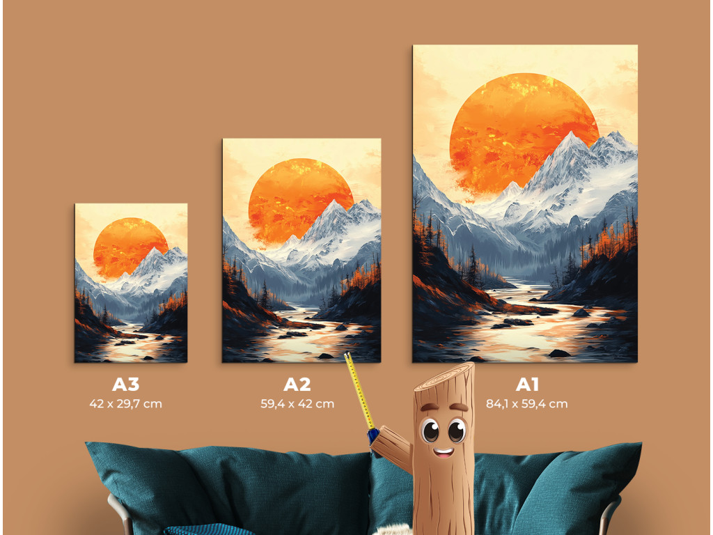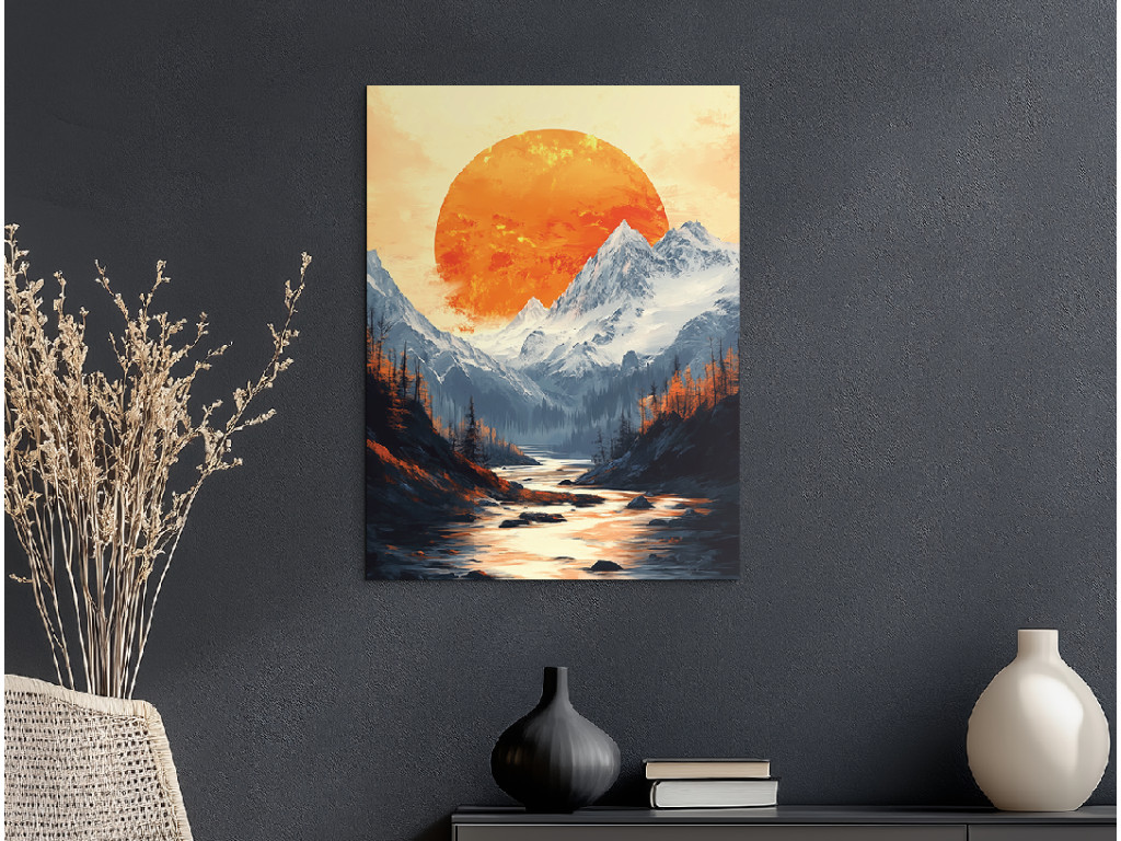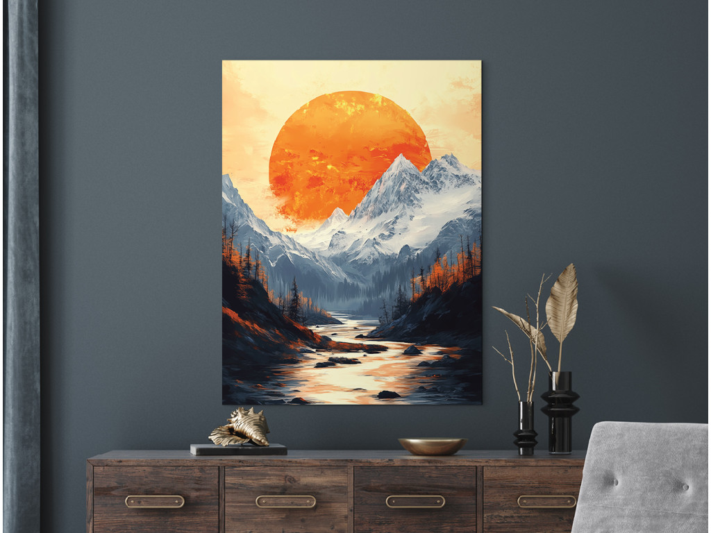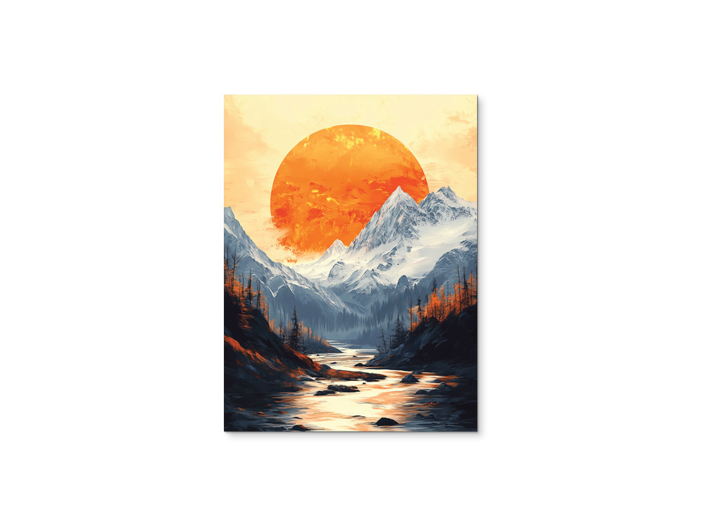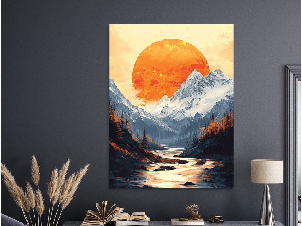 Das Bild zeigt eine dramatische Berglandschaft unter dem Abendhimmel. Im Hintergrund dominiert ein großer, satt orangefarbener Mond, der die Silhouetten der felsigen Gipfel und des dichten Waldes im Vordergrund beleuchtet. Die warmen Farbtöne des Himmels kontrastieren mit den dunklen Umrissen der Bäume und Berge und schaffen so eine starke visuelle Atmosphäre voller Ruhe und Geheimnis.