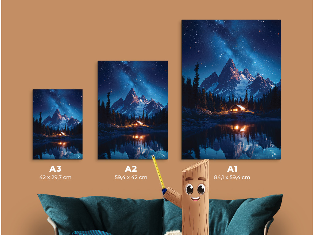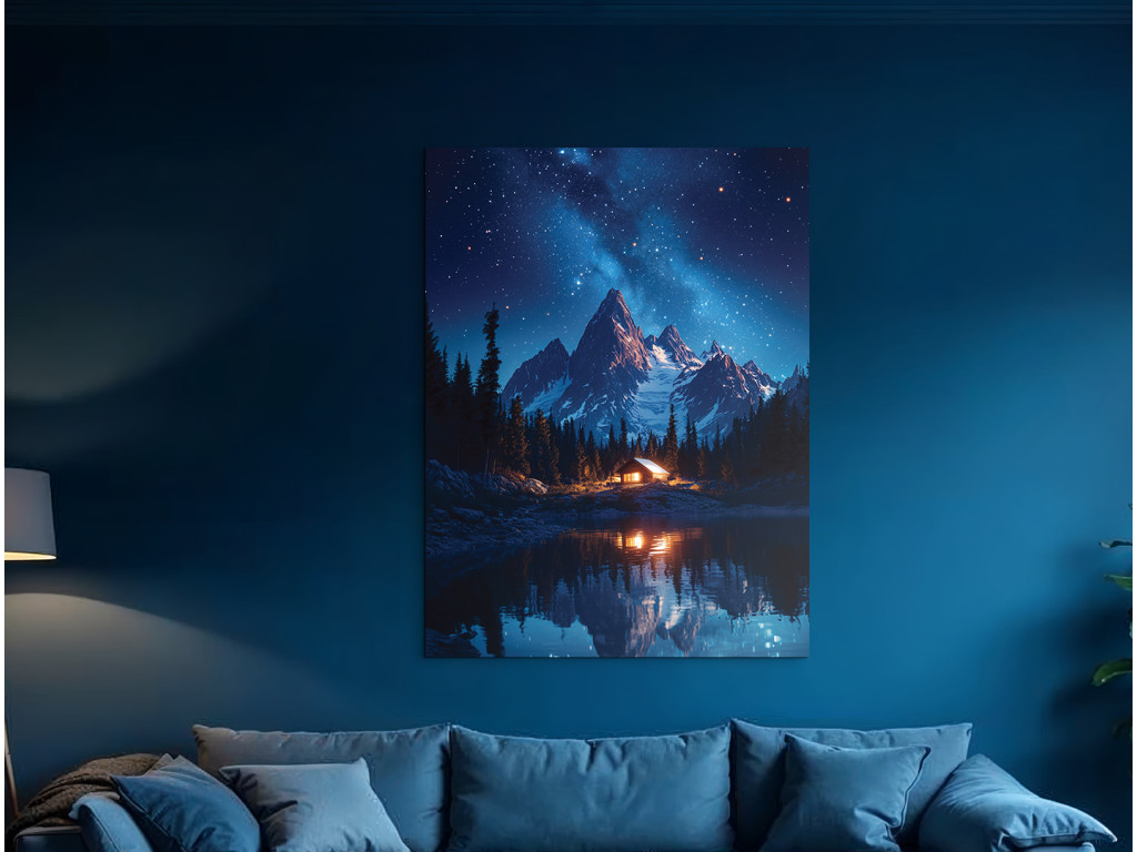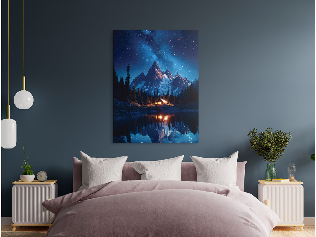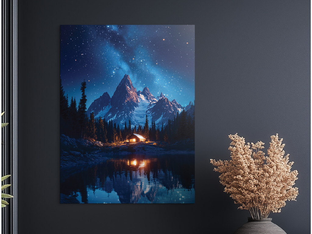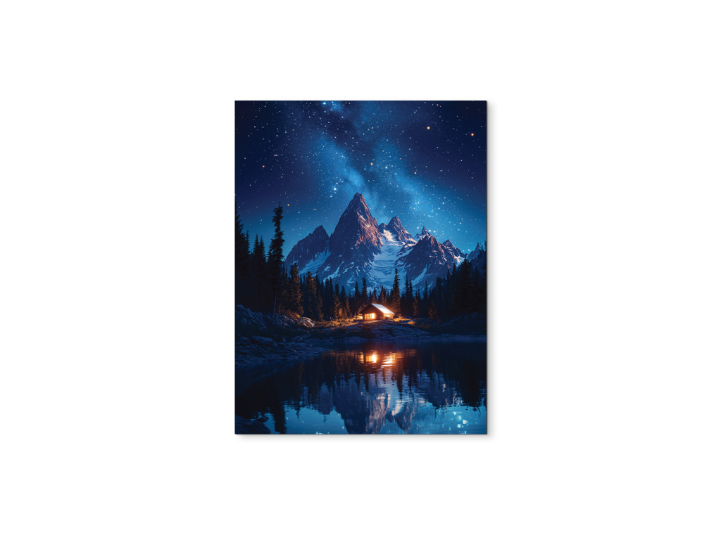 Das Bild Hütte unter den Bergen zeigt eine nächtliche Berglandschaft mit einem See und einer kleinen Hütte, deren warmes Licht einen Kontrast zur dunklen Umgebung bildet. Die ruhige Atmosphäre wird durch die Spiegelung der Berge und des Himmels auf der Oberfläche des Sees ergänzt, während der sternenübersäte Himmel der gesamten Szene eine magische Ruhe verleiht.