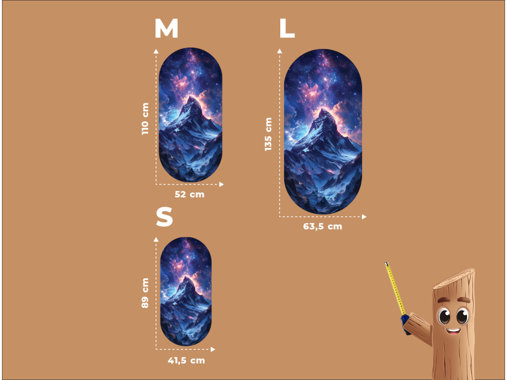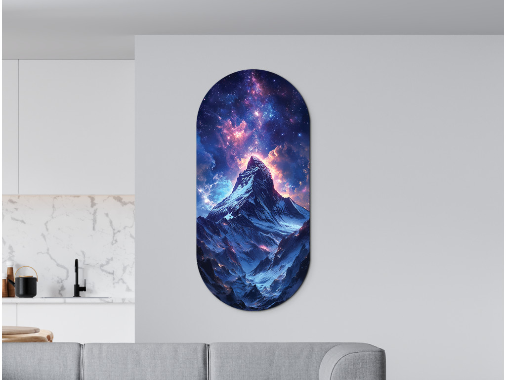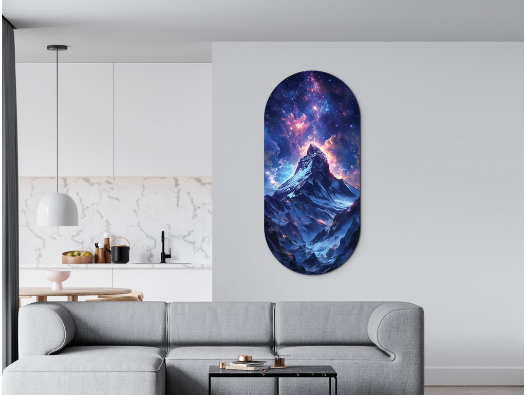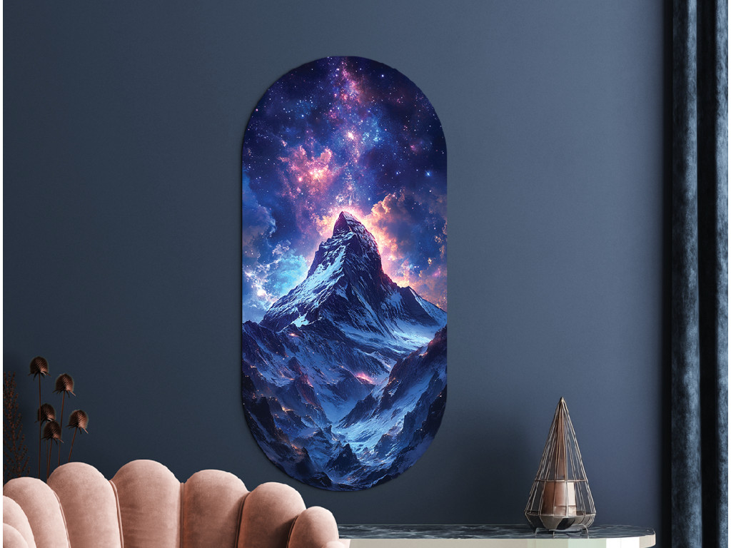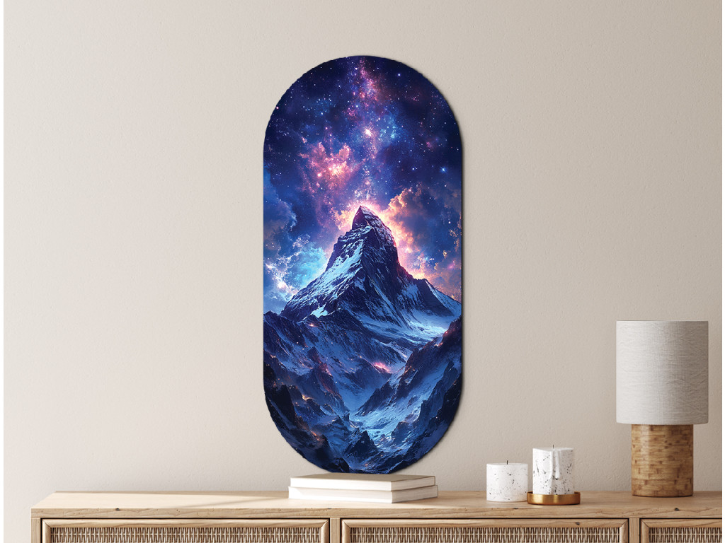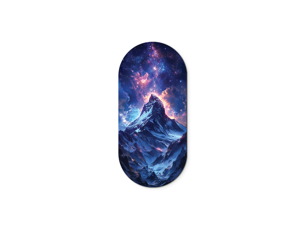 Die Illustration zeigt einen einsamen Berg unter dem Sternenhimmel, über dessen Gipfel sich eine Galaxie voller leuchtender Details und farbiger Übergänge erstreckt. Dank des vertikalen ovalen Formats wirkt das Werk klar und elegant. Es verbindet die Schönheit der Natur mit den Geheimnissen des Universums und strahlt gleichzeitig Ruhe und Unendlichkeit aus.