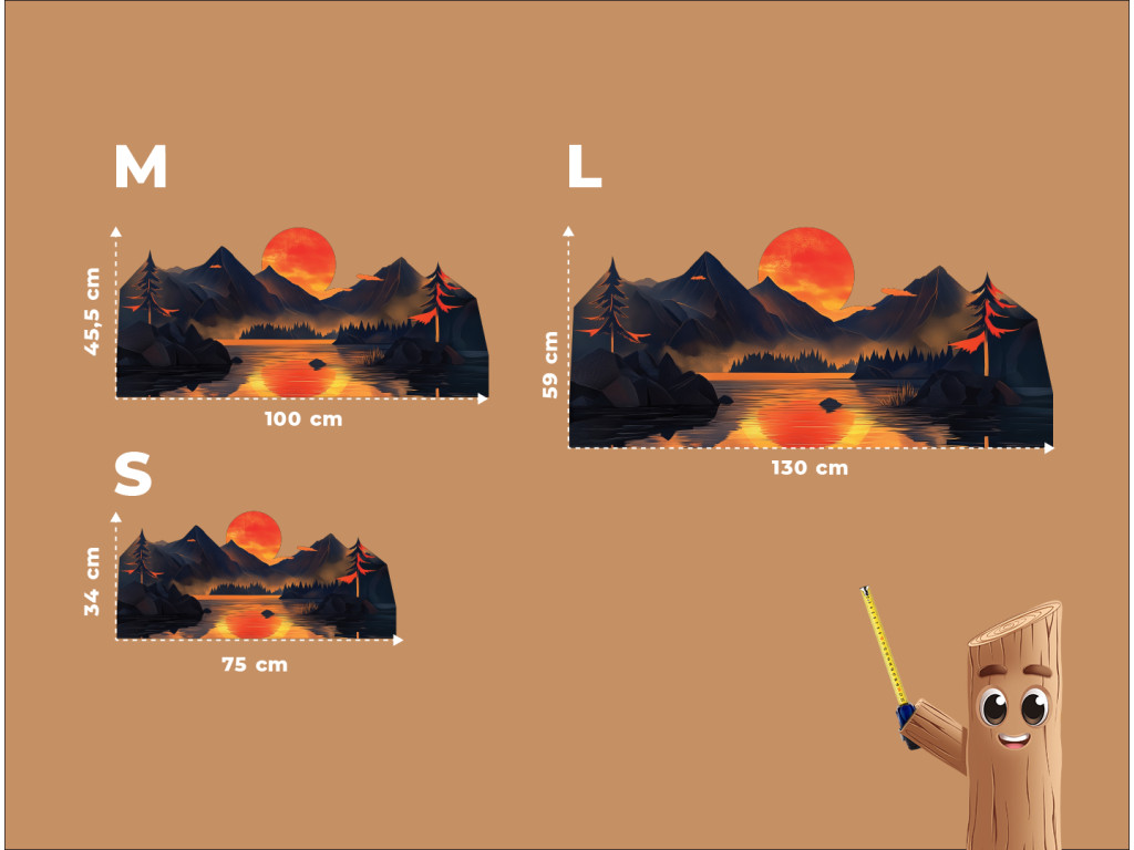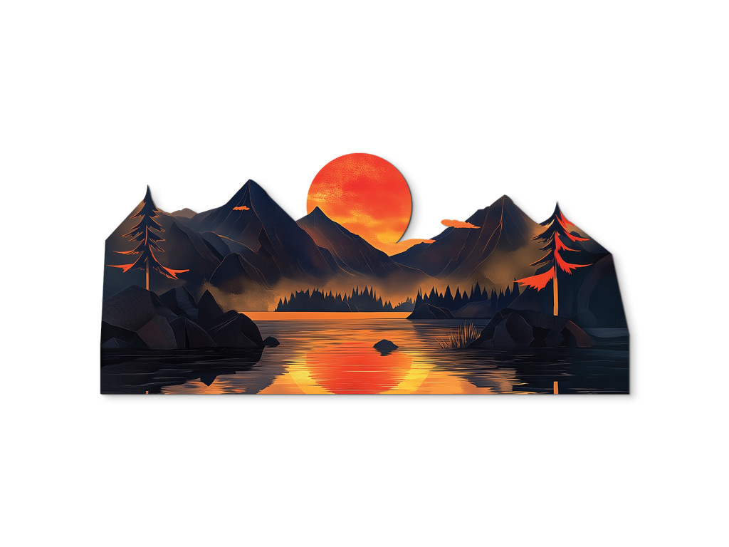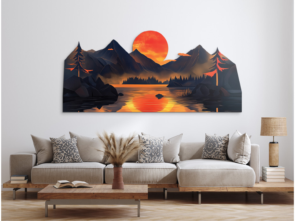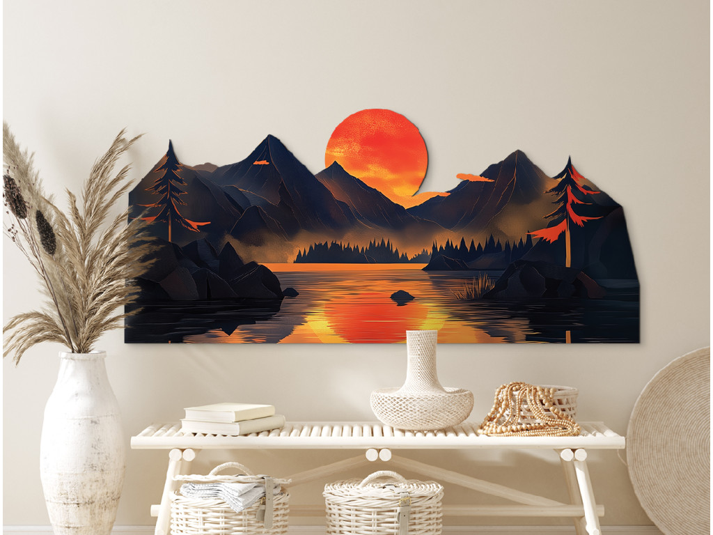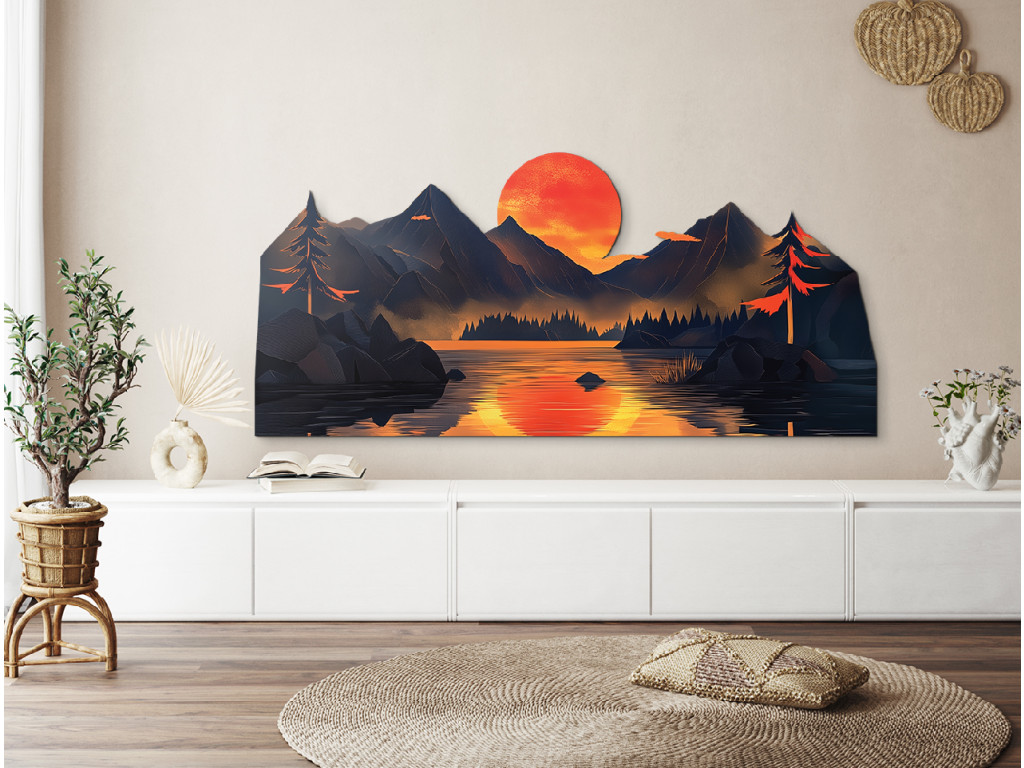 Die Dekoration zeigt die Silhouette einer Berglandschaft an einem See mit einer dominanten orangefarbenen Sonne, die sich auf der Wasseroberfläche spiegelt. Die dunklen blau-grauen Konturen der Berge und Bäume kontrastieren mit den warmen Farben des Himmels und schaffen so eine ruhige, harmonische Szenerie. Das mehrschichtige Design verleiht dem Bild Räumlichkeit und einen künstlerischen Eindruck, ideal für Innenräume mit natürlicher oder moderner Ausrichtung.