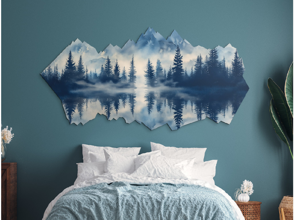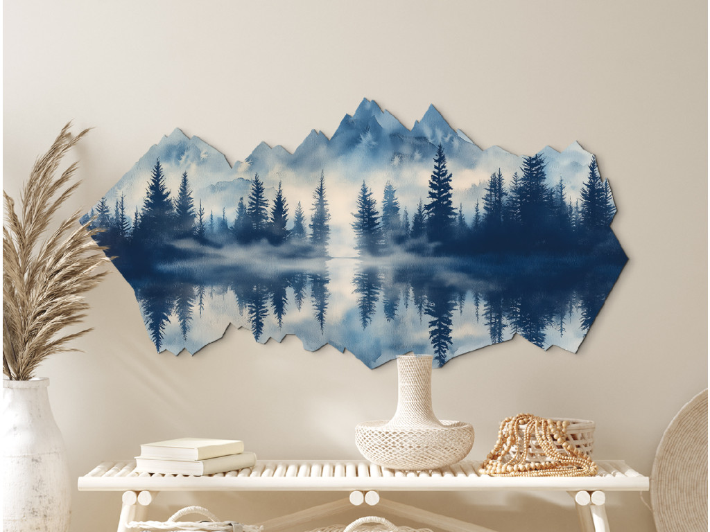 Das Kunstwerk zeigt eine ruhige Berglandschaft mit Spiegelungen des Waldes und der Gipfel im See. Nebel und kühle Blautöne schaffen eine mystische, ruhige Atmosphäre, die beruhigend wirkt. Die ungewöhnliche Form des Bildes, die die Silhouette der Natur nachahmt, macht es zu einem originellen und modernen Einrichtungsaccessoire.