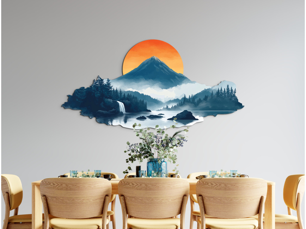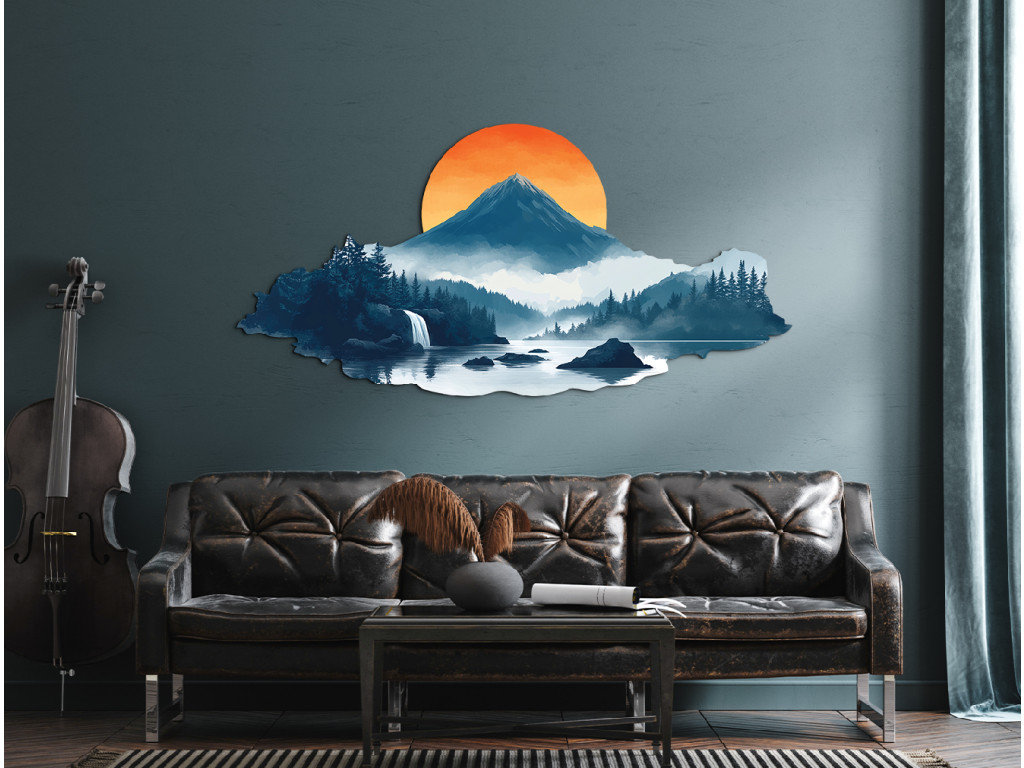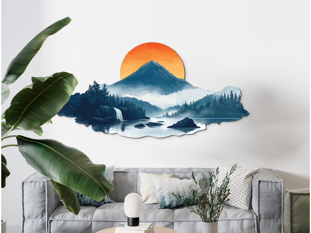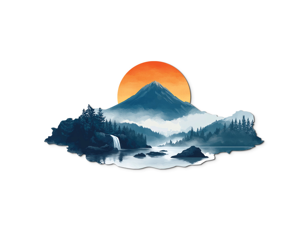 Die künstlerische Landschaft fängt den magischen Moment des Sonnenuntergangs ein. Der dominante, von Wäldern umgebene Berg, der Wasserfall, der in ein ruhiges Gewässer mündet, und der sanfte Nebel vermitteln einen Eindruck von Ruhe, Reinheit und Rückkehr zur Natur. Die Szene wirkt wie ein stiller, einschläfernder Zufluchtsort – ein Ort, der für manche ein reales oder symbolisches Zuhause sein kann.