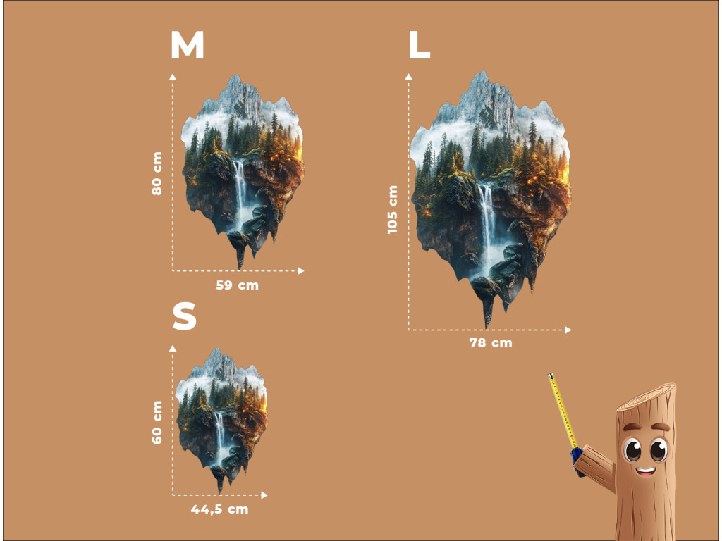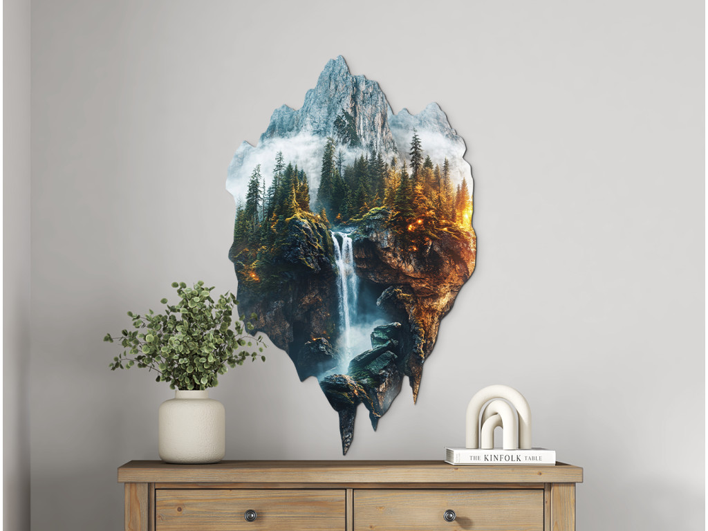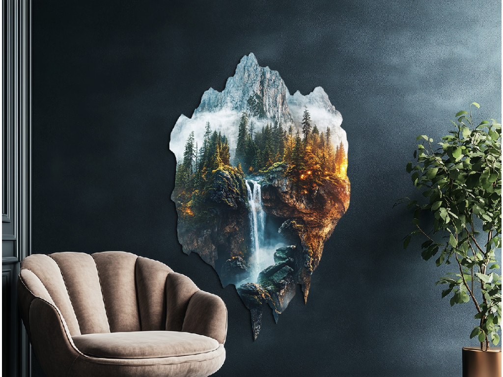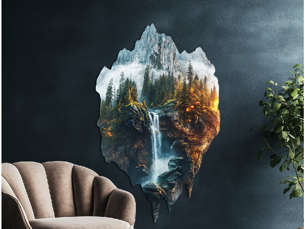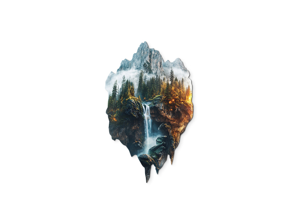 Die Berglandschaft schwebt im Raum wie ein abgetrennter Teil der Welt, aus dem eine strahlende Quelle aus Wasser und Licht entspringt. Der Wasserfall ergießt sich aus der Höhe zwischen Wäldern und Felsen, umgeben von Lichtpunkten, die an magische Funken erinnern. Das Werk verbindet die Kraft der Natur mit ätherischer Ruhe und vermittelt den Eindruck, dass die Berge selbst Quelle des Lebens und des Geheimnisvollen sind.