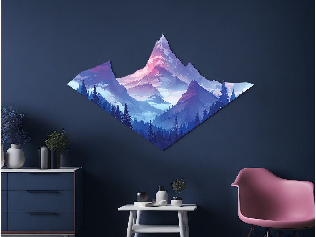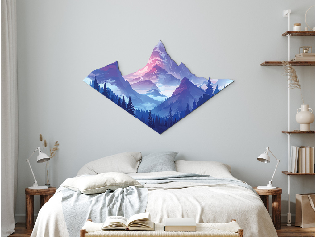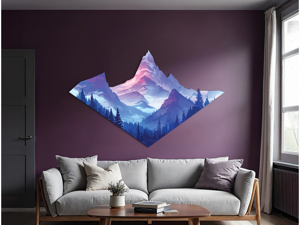 Dieses unregelmäßige Bild zeigt einen markanten Berggipfel, umgeben von Nadelbäumen, eingetaucht in sanften Nebel oder Schnee. Blaue, violette und rosa Farbtöne verschmelzen in fließenden Übergängen und schaffen so Tiefe und Sanftheit. Es wirkt wie eine stille Hommage an die Natur, die Ruhe und Erhabenheit ausstrahlt.