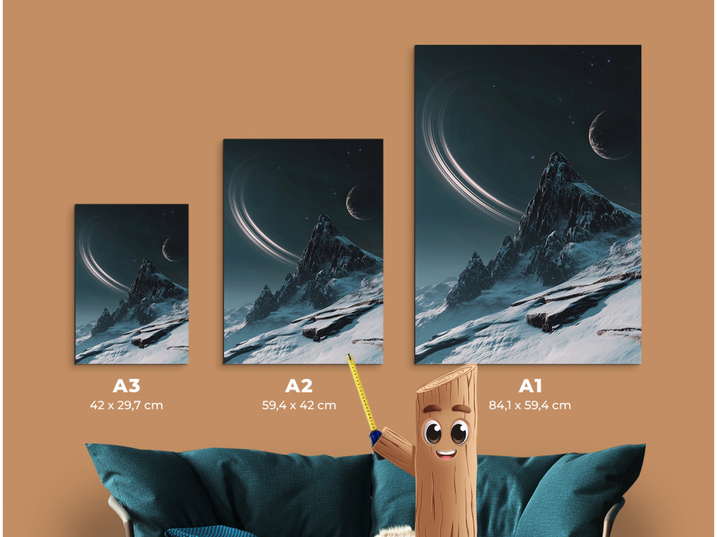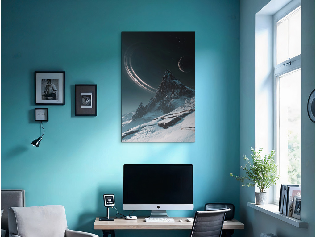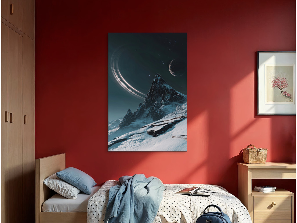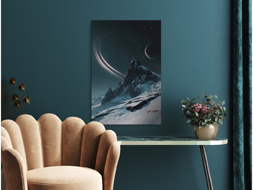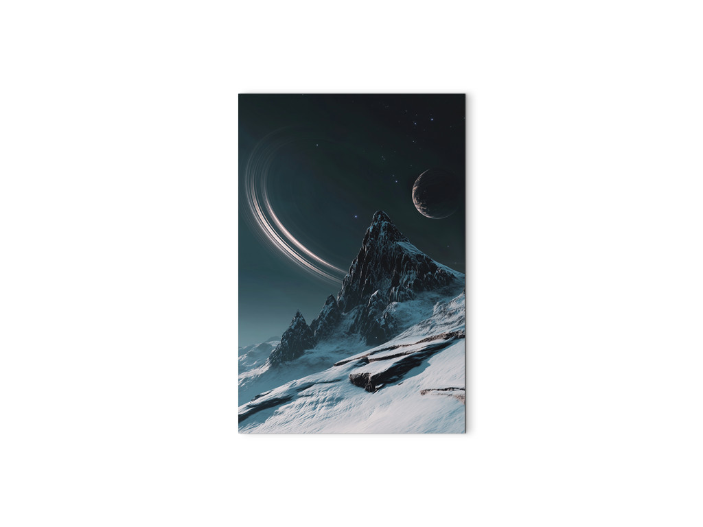 Das moderne Bild zeigt eine stilisierte Nachtlandschaft, in der sich ein majestätischer, schneebedeckter Berg unter einem mystischen Himmel mit Mond und Ringplaneten erhebt. Die Komposition verbindet Elemente des Weltraums und der Natur und schafft so eine traumhafte, Science-Fiction-artige Szene mit einer ruhigen, fast überirdischen Atmosphäre. Sie eignet sich als markantes Designelement für moderne Innenräume.