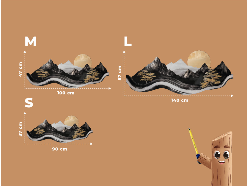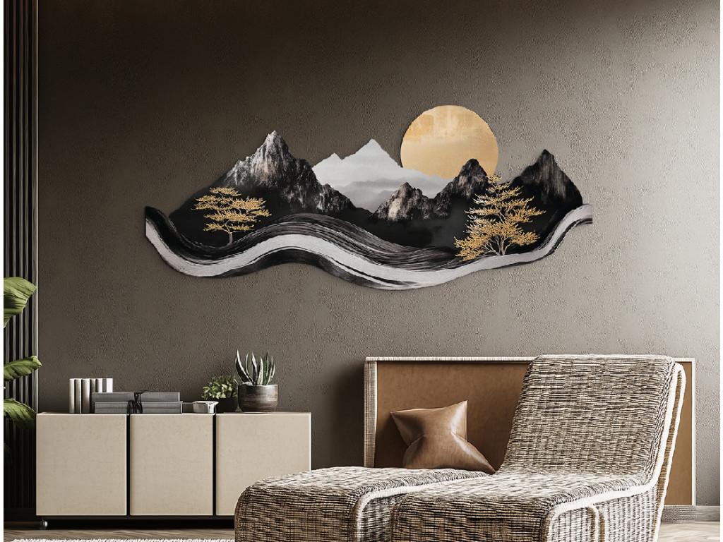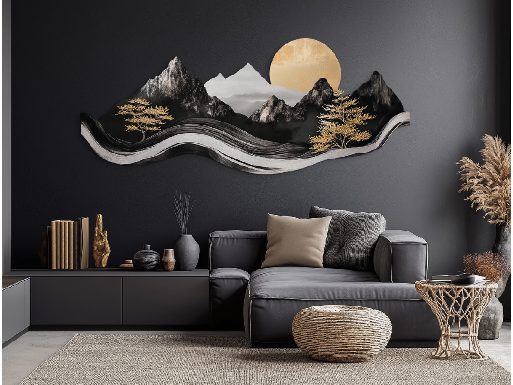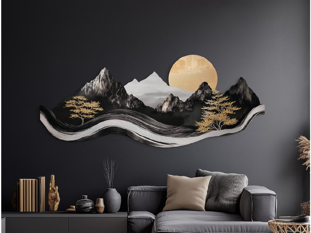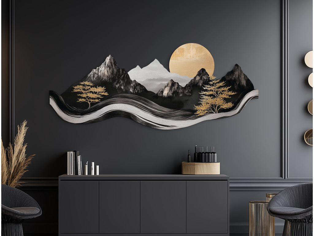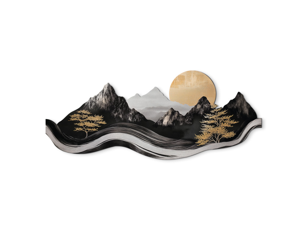 Das elegante Bild im asiatischen Stil verbindet modernes Design mit traditioneller Ästhetik. Die dominanten Berge, Bäume und die Sonne in den Farbtönen Schwarz, Weiß und Grau wirken wie eine Tuschemalerei, während goldene Akzente dem Werk einen luxuriösen und warmen Kontrast verleihen. Dank seiner plastischen Verarbeitung und gewellten Form wirkt dieses Bild lebendig und wird zu einer markanten Dekoration eines modernen Ambientes.