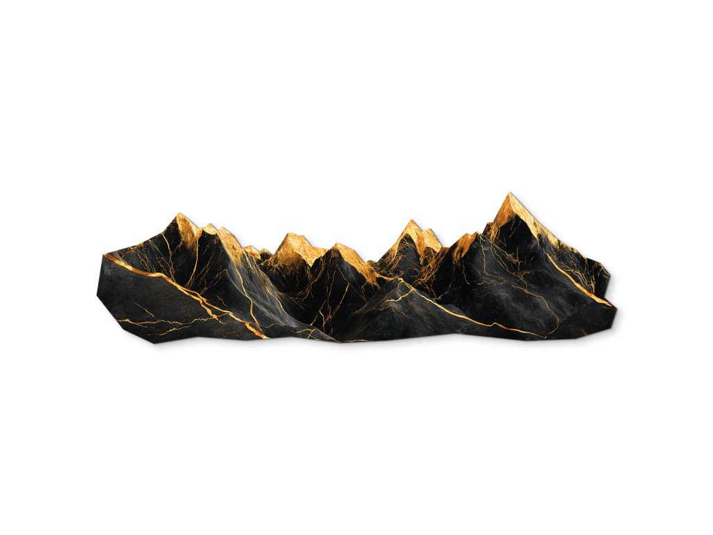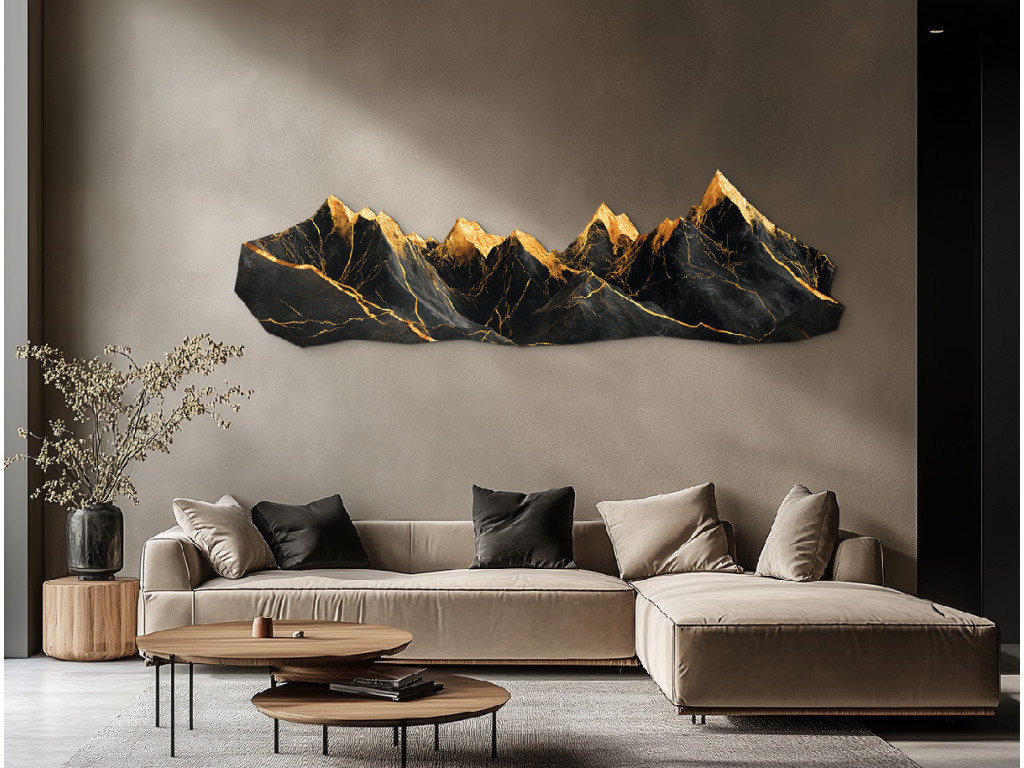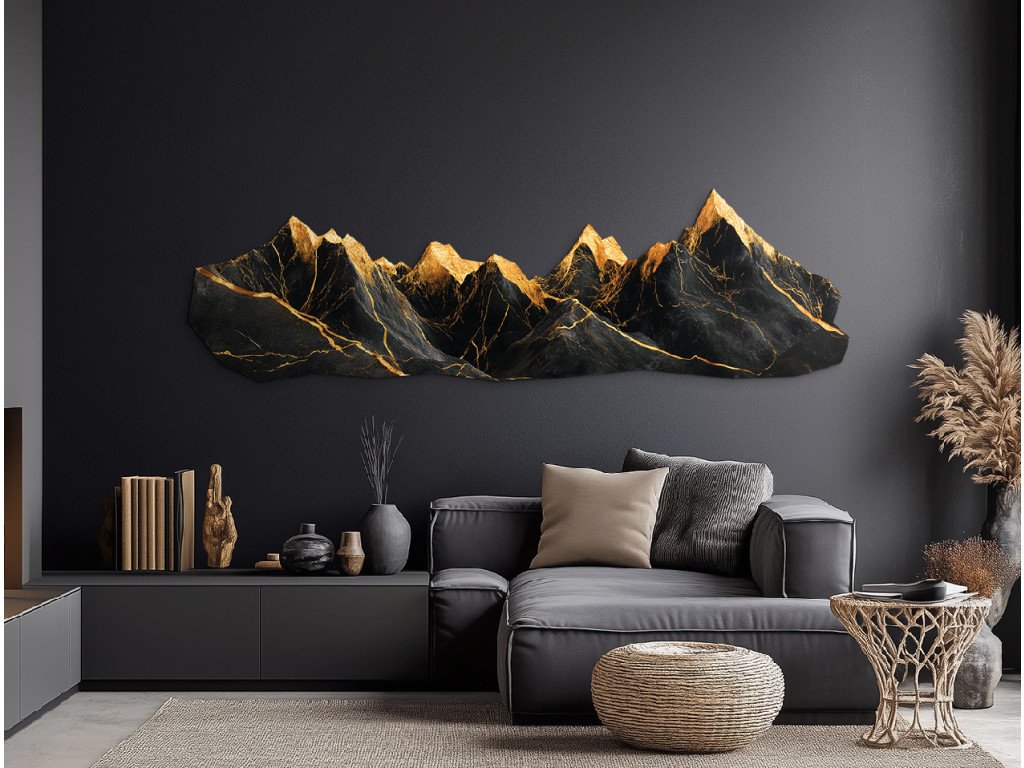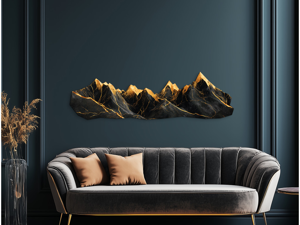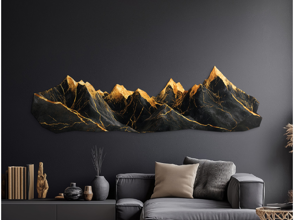 Das moderne Bild in den Schattierungen dunkler Berge mit goldenen Adern schafft einen eindrucksvollen Kontrast zwischen Licht und Schatten. Die goldenen Linien erinnern an Sonnenstrahlen, die auf die Berggipfel fallen, und verleihen dem Werk einen luxuriösen, leuchtenden Effekt. Dieses elegante Bild bringt Tiefe, Wärme und raffinierten Stil in Ihr Ambiente.