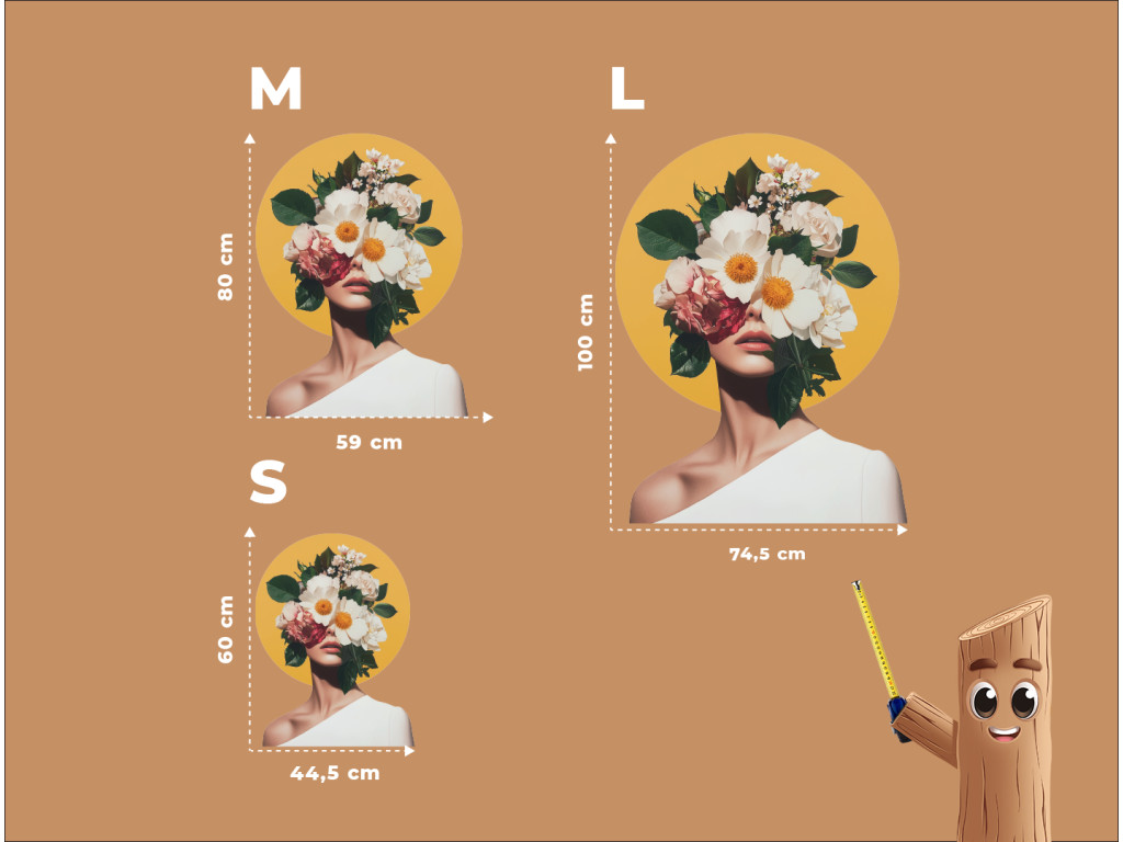 Die weibliche Figur, deren Gesicht hinter einem üppigen Strauß weißer Blumen verborgen ist, wirkt ätherisch und rein, als würde sie mit der Natur verschmelzen. Der gelbe Kreis im Hintergrund vermittelt Wärme, Licht und innere Ruhe, während die neutralen Farbtöne des Kleides und des Hintergrunds die sanfte Kraft der Komposition hervorheben. Die blumige Muse ist eine visuelle Ode an die Stille, die Sensibilität und die Schönheit, die in der Einfachheit verborgen sind.