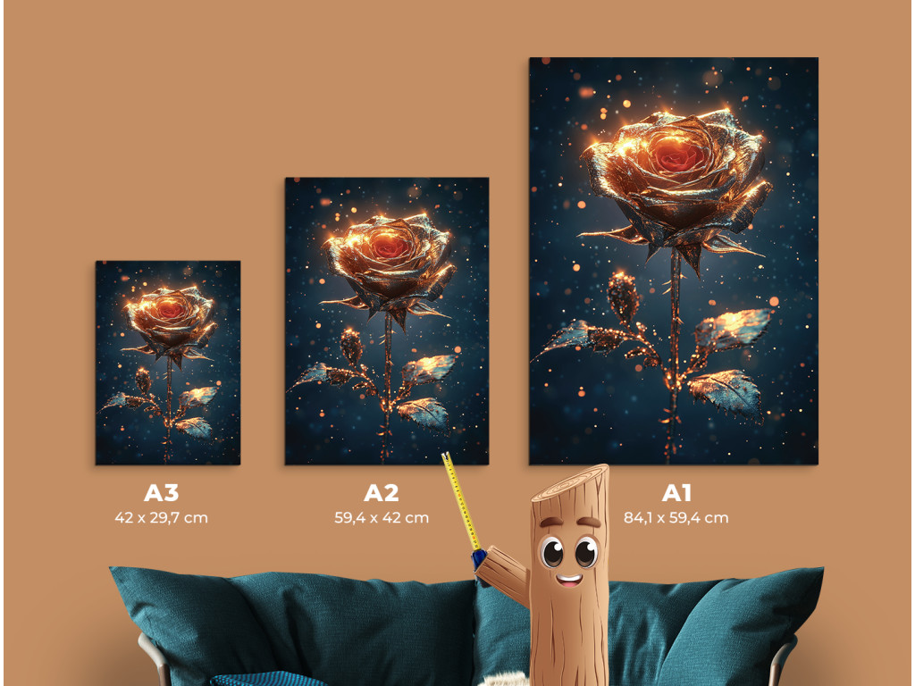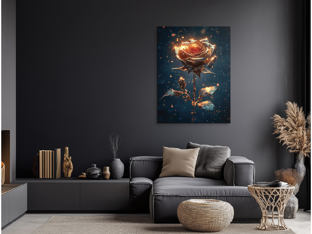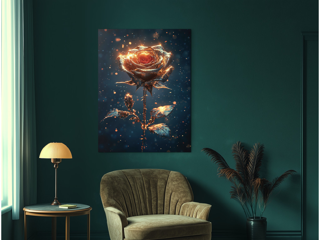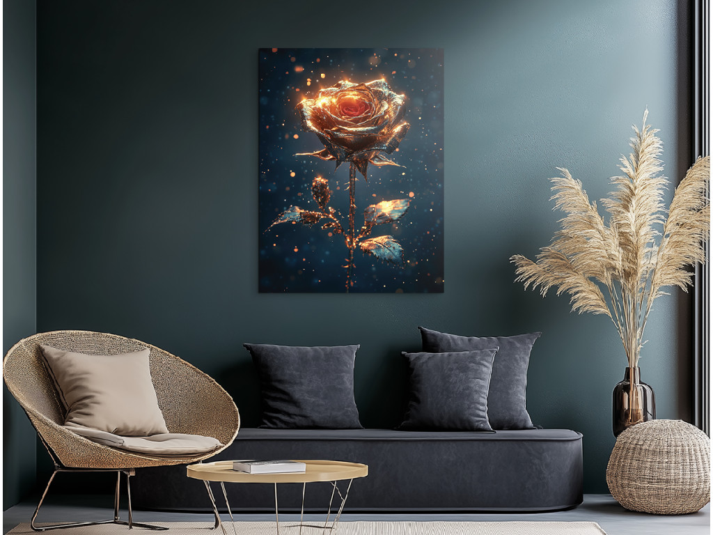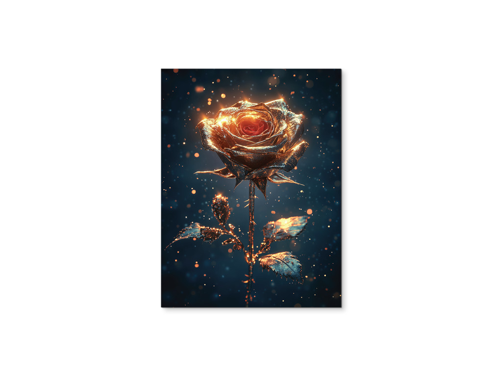 Schimmernde Stille ist ein Bild mit einer sanft verträumten Atmosphäre – eine goldene Rose hebt sich von einem dunklen Hintergrund ab, der mit winzigen Glitzerpartikeln übersät ist, die an Sternenstaub oder Funken in der Luft erinnern. Die Komposition wirkt ruhig und gleichzeitig strahlend, wie ein stiller Moment voller Schönheit. Ideal für Innenräume, in denen das Bild als eleganter und zugleich etwas geheimnisvoller Mittelpunkt des Raumes wirken soll.