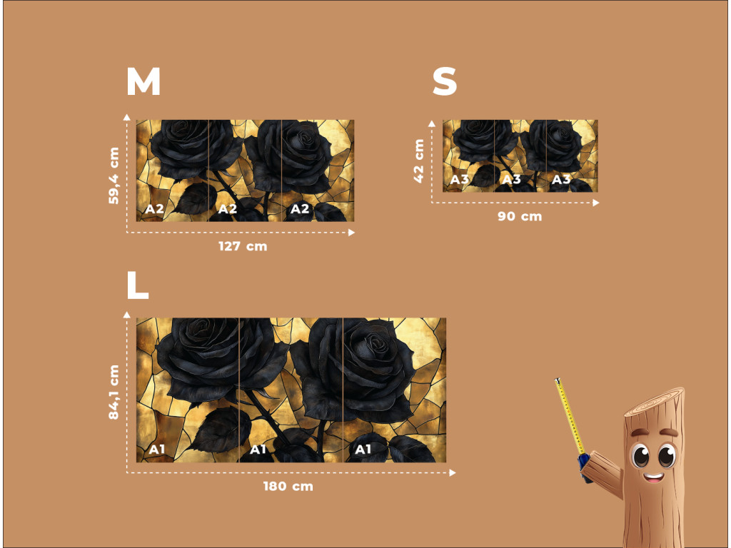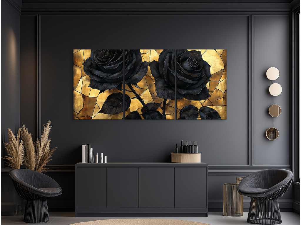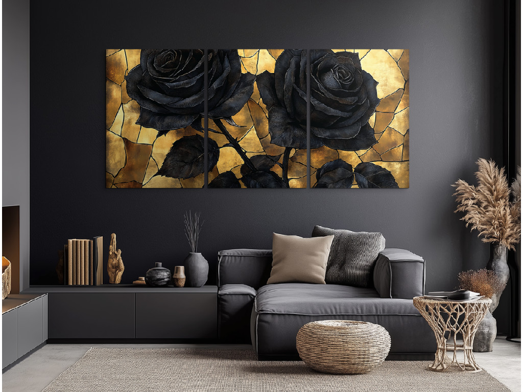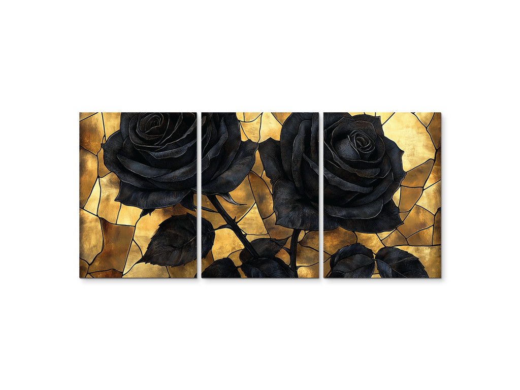 Das Mosaik schwarzer Rosen ist ein dreiteiliges Bild mit einem originellen Kontrast – zwei schwarze Rosen vor einem Hintergrund, der an ein goldenes Mosaik oder glänzende Scherben einer zerbrochenen Vase erinnert. Die Kombination des dunklen Blumenmotivs mit dem unregelmäßigen, goldenen Hintergrund vermittelt einen Eindruck von Luxus, subtiler Dramatik und künstlerischer Detailtreue.