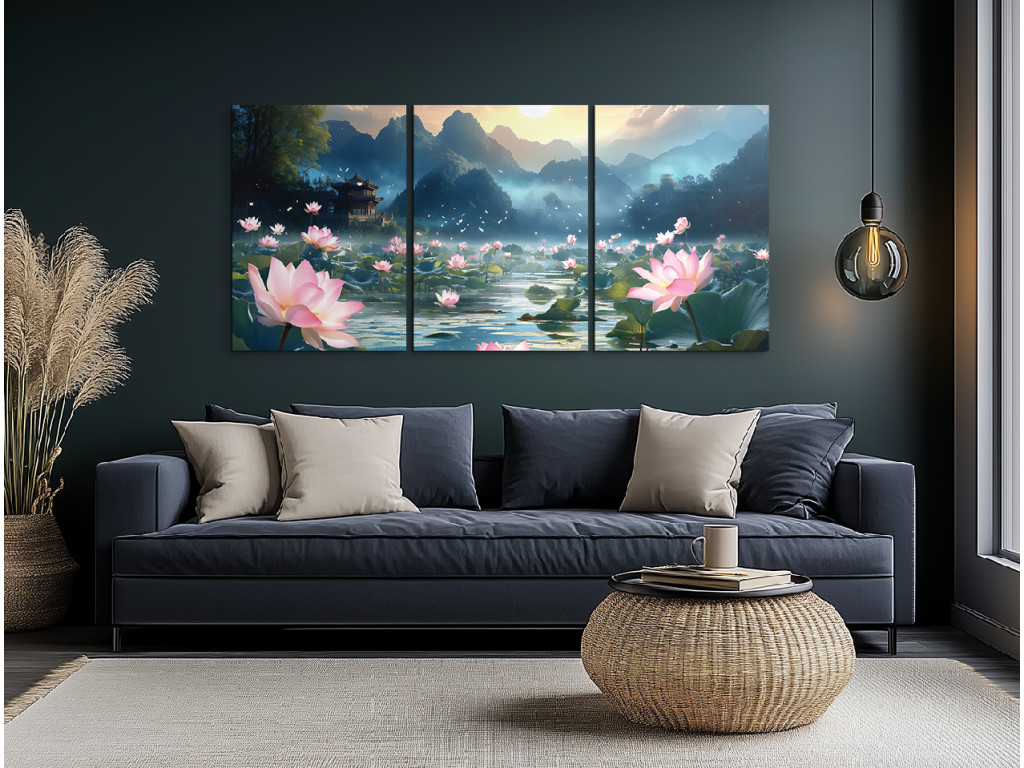 Die Stille des Sees ist ein dreiteiliges Bild, das einen ruhigen Blick auf einen See voller Wasserlilien unter der Silhouette der Berge einfängt, der vom warmen Abendlicht der untergehenden Sonne überflutet wird. Die goldenen Reflexe auf der Oberfläche und die sanfte Farbpalette schaffen eine beruhigende, romantische Atmosphäre.