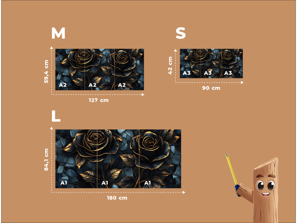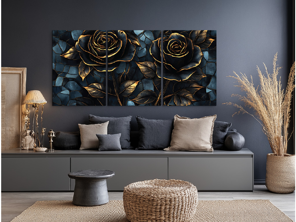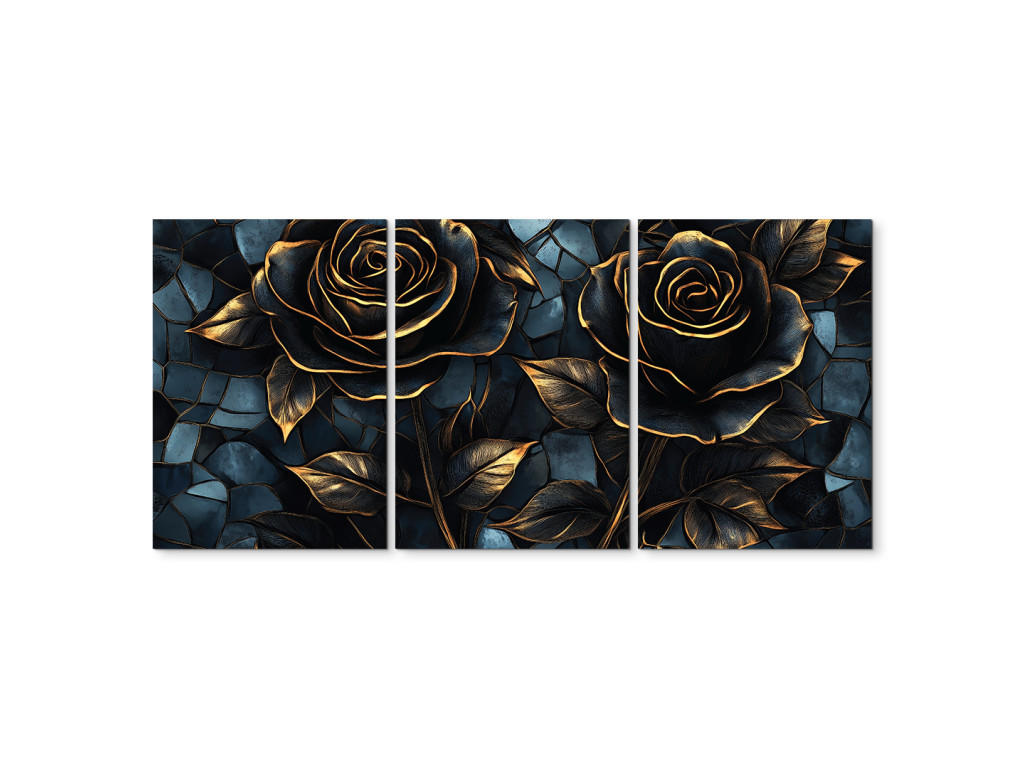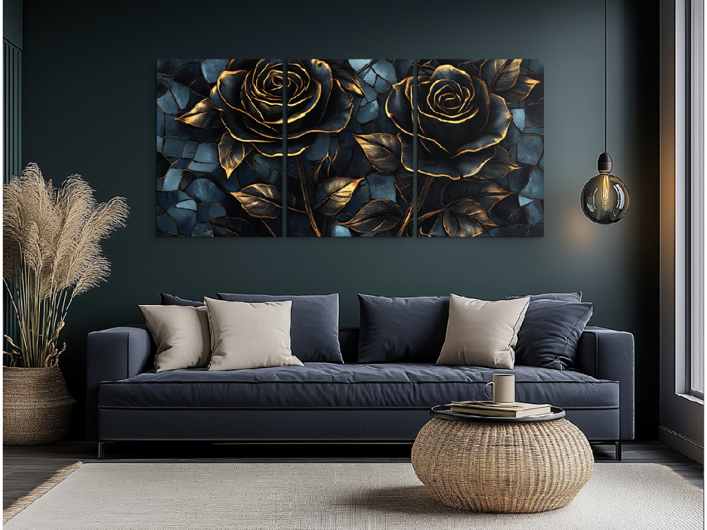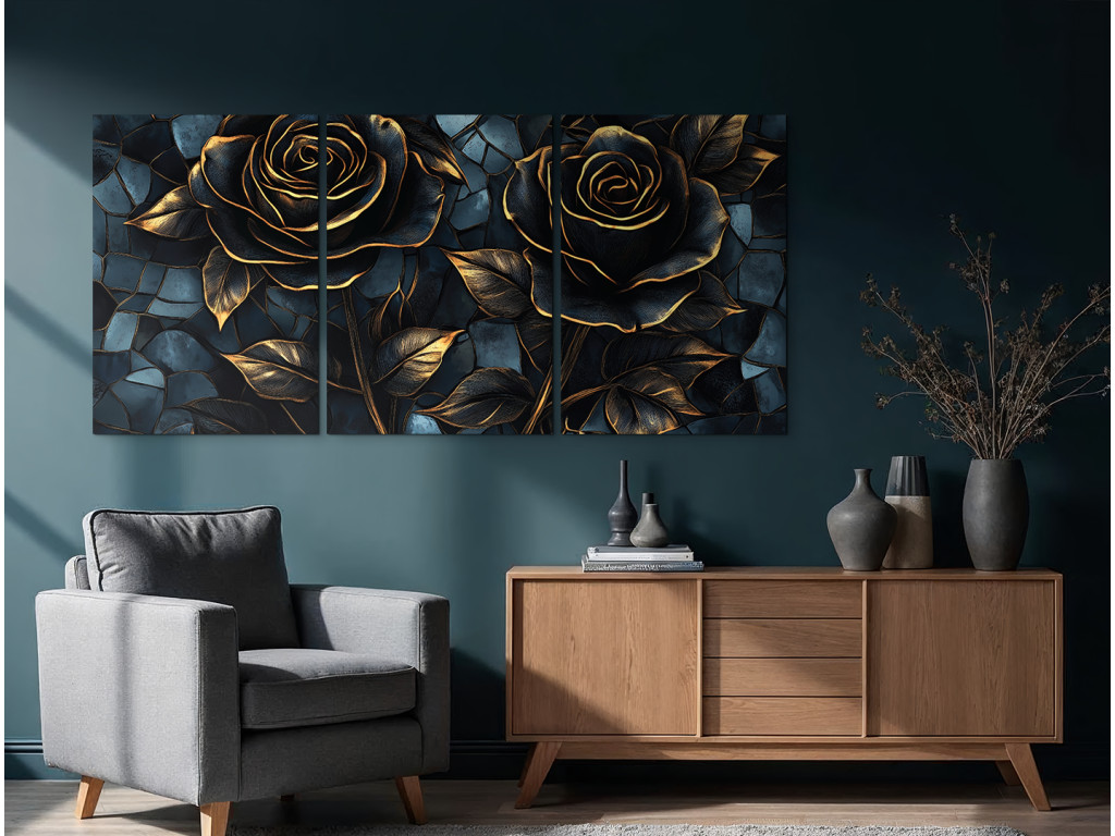 Das goldene Duett ist ein dreiteiliges Bild, das zwei schwarz-goldene Rosen vor einem dunkelblauen Mosaikhintergrund zeigt. Durch den Kontrast zwischen den satten Farben und dem metallischen Glanz wirkt das Bild ausdrucksstark, aber gleichzeitig elegant und ausgewogen. Ideal als stilvolle Ergänzung zu einem modernen Interieur – es kommt über einer Kommode, einem Sofa oder im Schlafzimmer besonders gut zur Geltung.