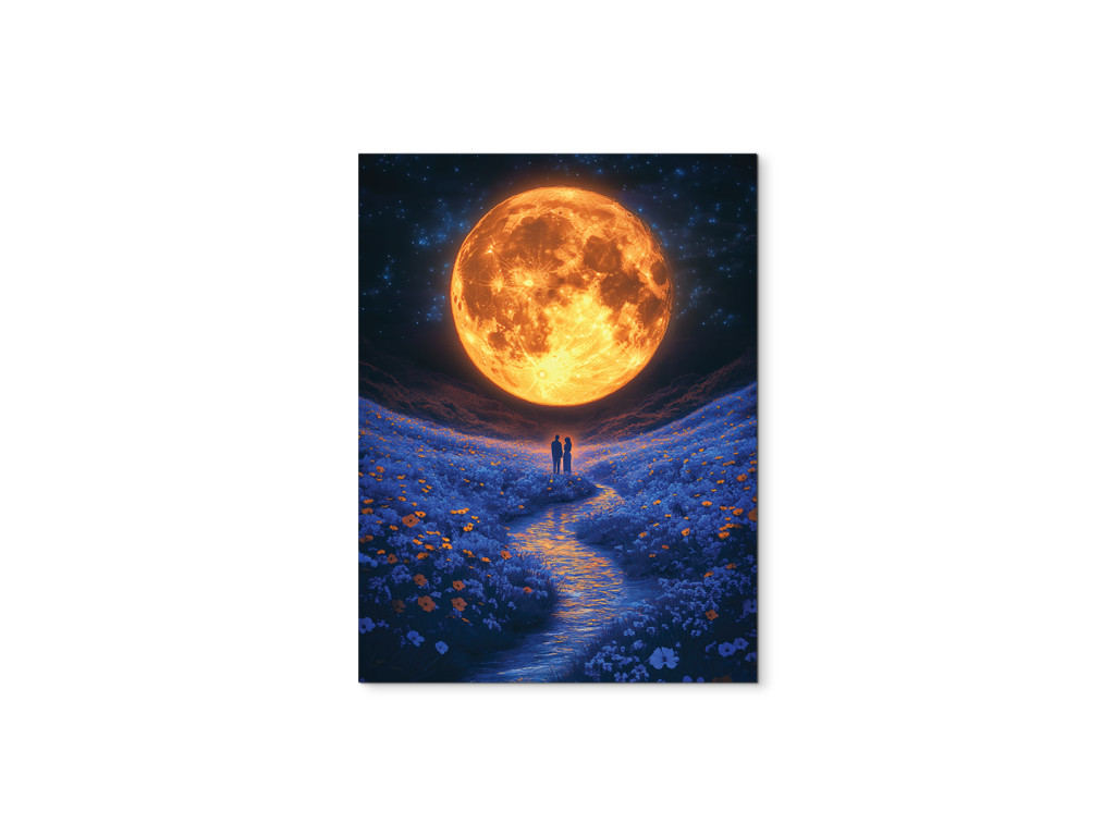 Umarmt vom Mond ist ein modernes Gemälde mit romantischer und verträumter Ausstrahlung – ein riesiger, orange leuchtender Mond beleuchtet eine Blumenwiese, durch die still ein Bach fließt. Im Zentrum der Komposition steht ein Liebespaar, eingetaucht in das Licht und die Ruhe der Nacht. Dieses Bild strahlt Wärme, Zärtlichkeit und Intimität aus – ideal für die Wand im Schlafzimmer oder für Innenräume mit einem sanften, romantischen Geist.