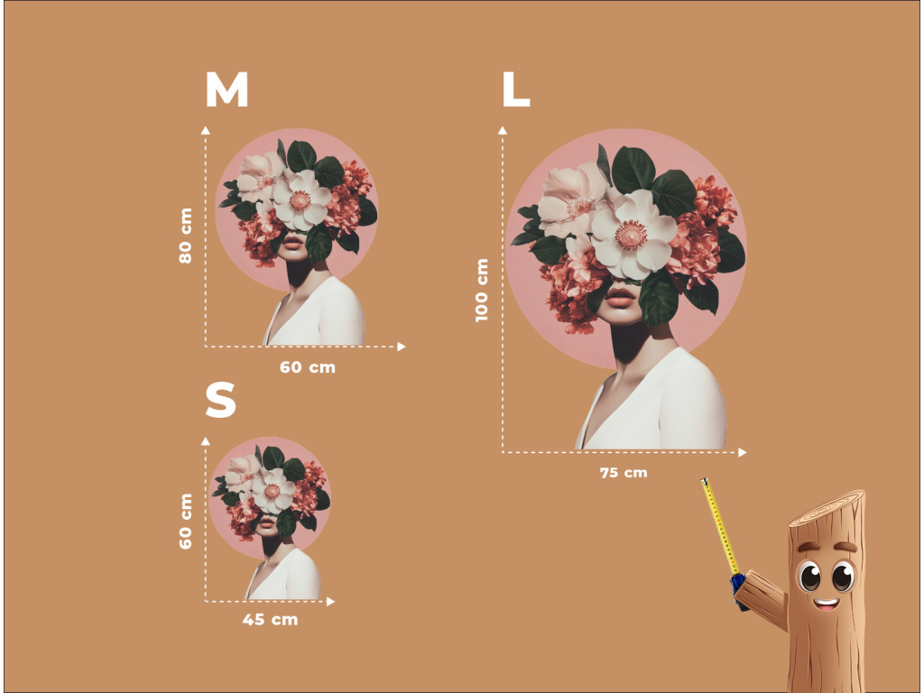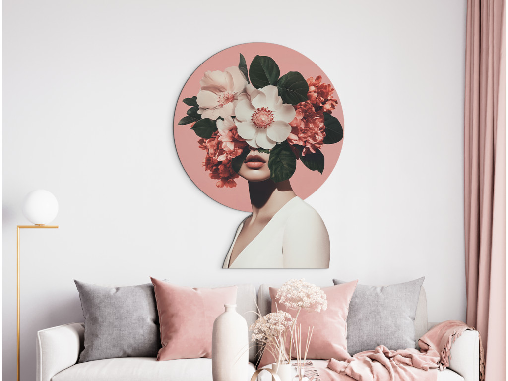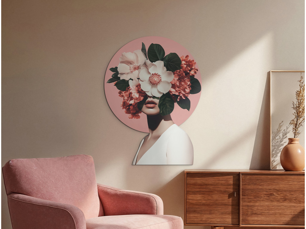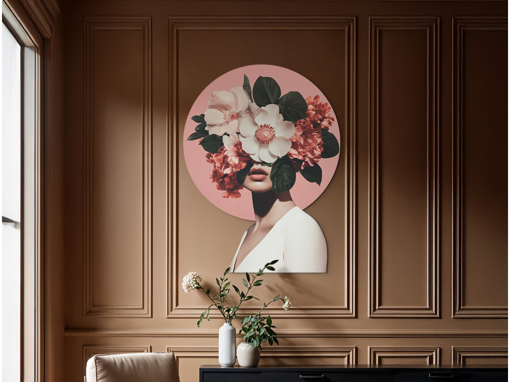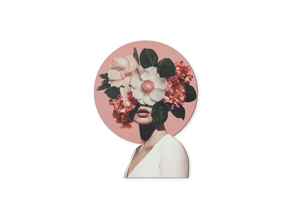 Die weibliche Figur, deren Gesicht hinter einem üppigen Blumenstrauß verborgen ist, verkörpert die Verbindung zwischen Mensch und Natur. Das rosa kreisförmige Motiv hinter ihrem Kopf erinnert an einen Heiligenschein – ein Symbol für Inspiration, Wachstum und Geheimnis. Im Kontrast zu den zarten Kleidern der Figur wirkt das Bild ruhig, ätherisch und zugleich bezaubernd. Botanische Muse ist eine Hommage an die stille Anmut und Kraft der natürlichen Schönheit.