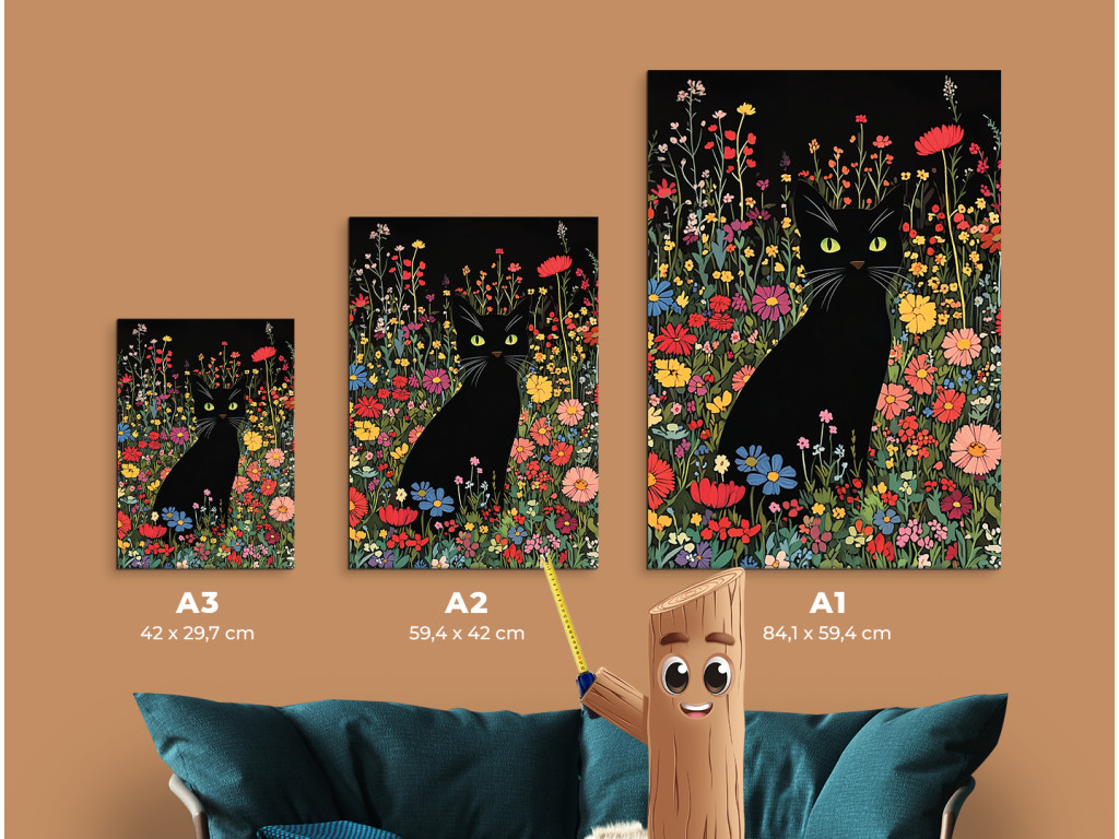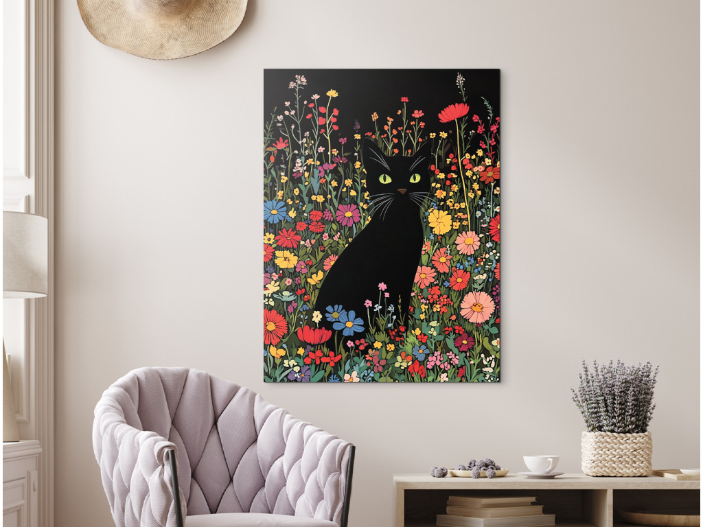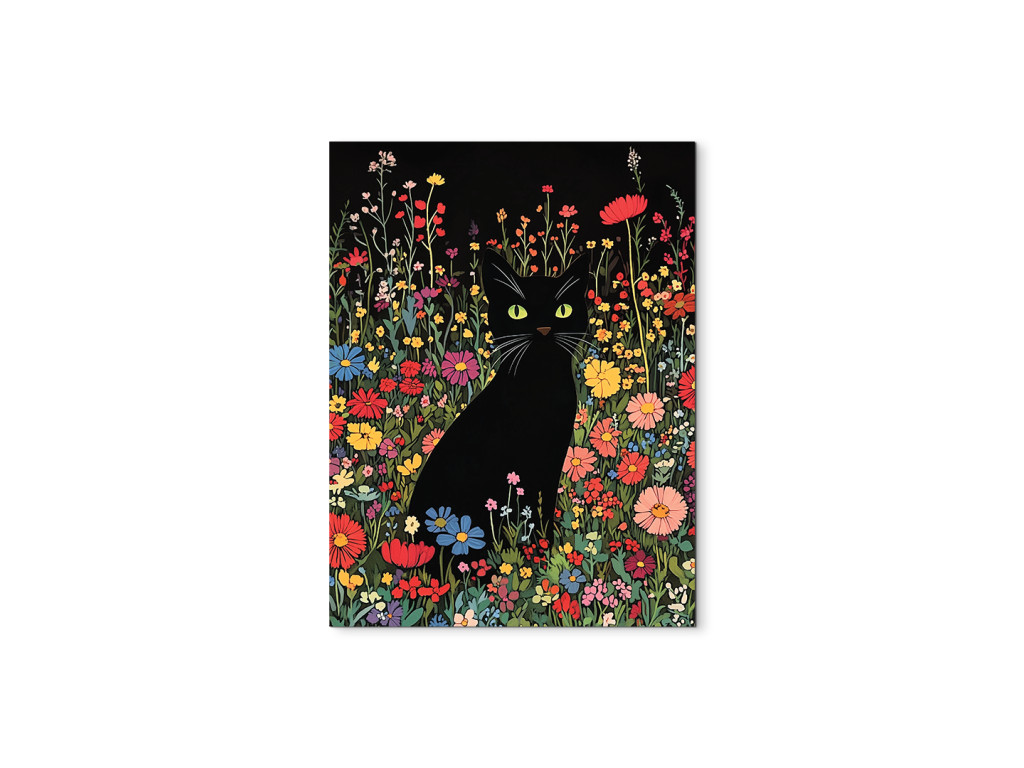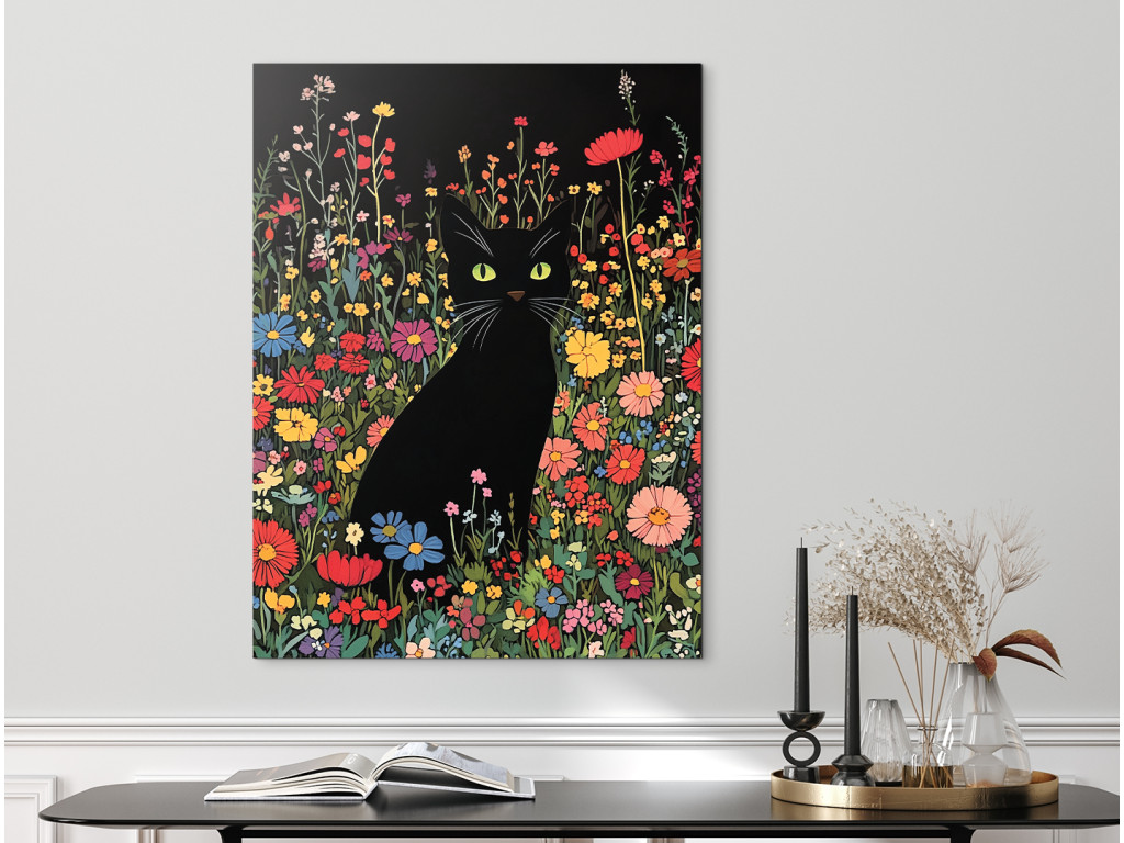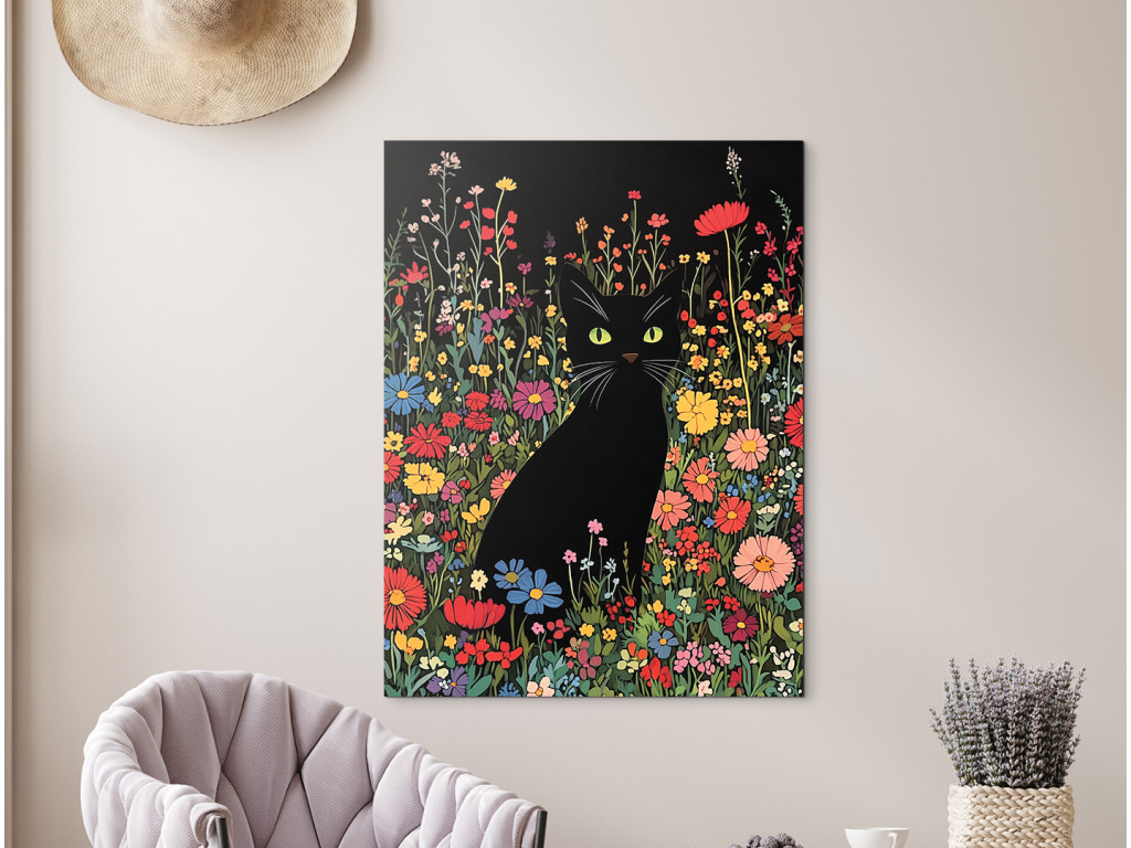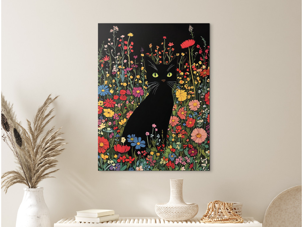 Die schwarze Katze in den Blumen ist ein Wandbild im Stil einer Zeichnung, das verspielt und zugleich geheimnisvoll wirkt. Die elegante Silhouette der Katze kontrastiert mit den bunten Blumen, die sie umgeben, und schafft so eine lebendige und bezaubernde Komposition. Sie eignet sich hervorragend für kreative Räume, Kinderzimmer, Arbeitszimmer oder überall dort, wo Sie ein wenig Kunst mit Charakter und Charme einbringen möchten.