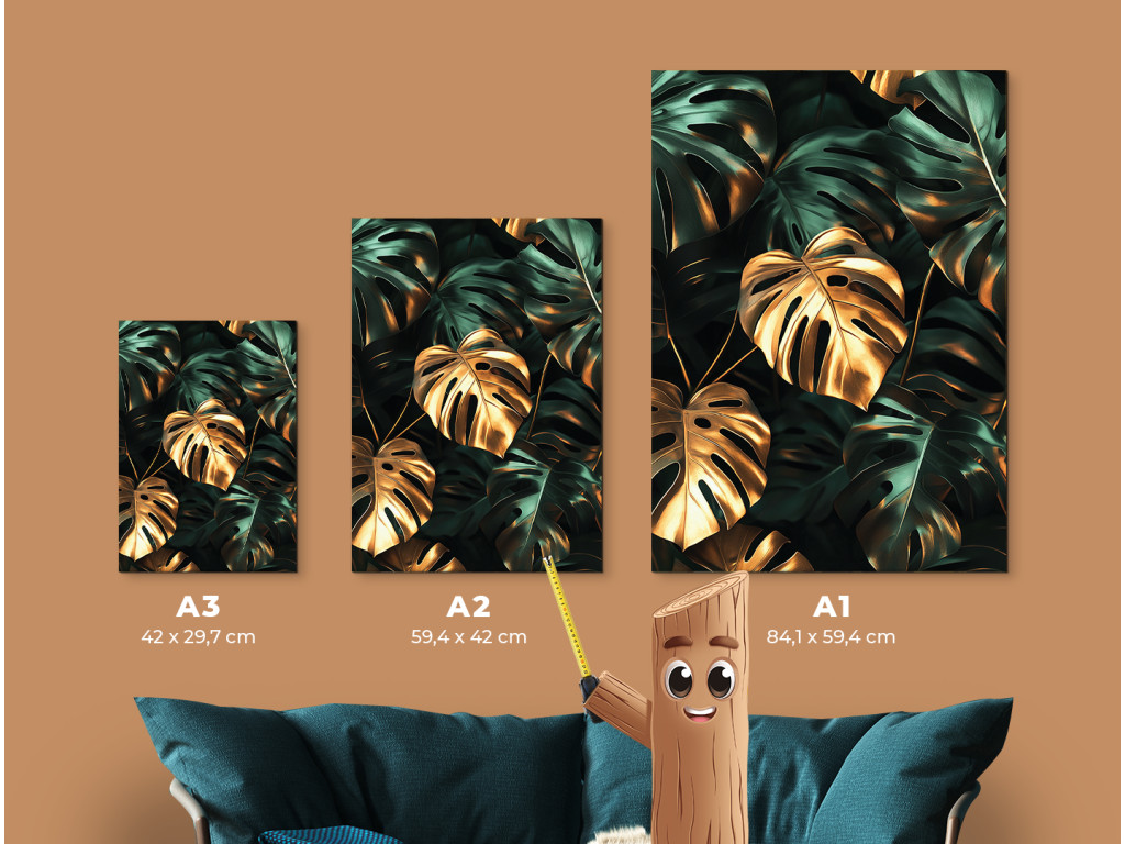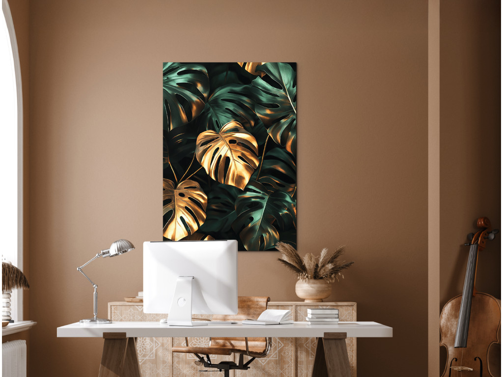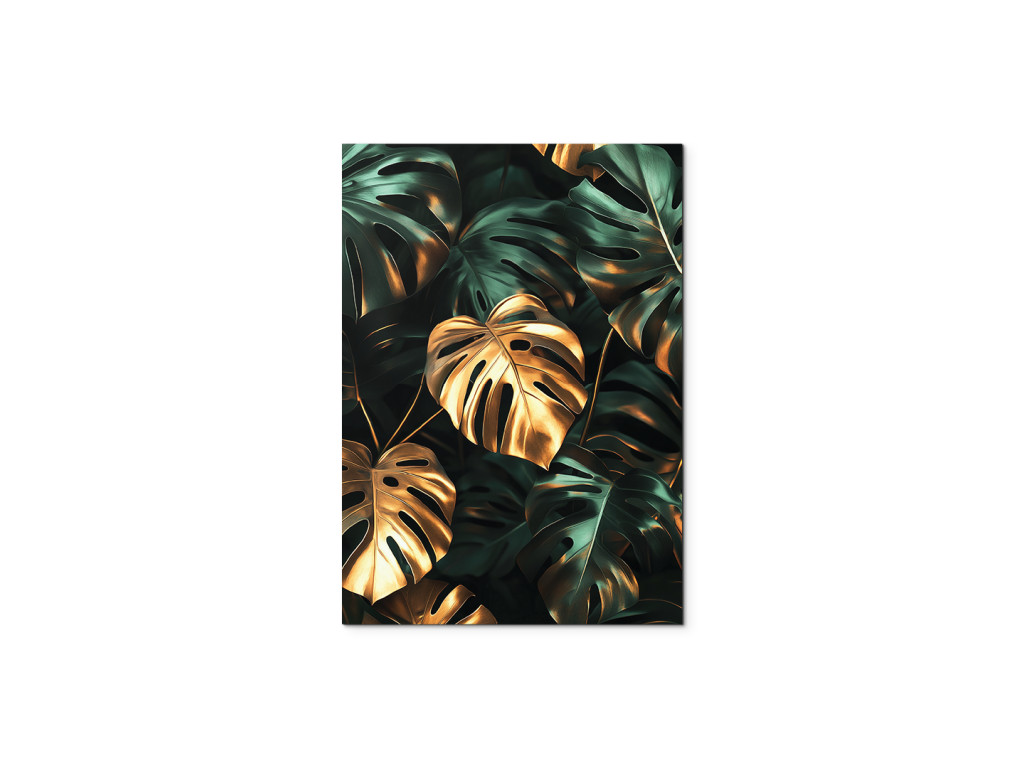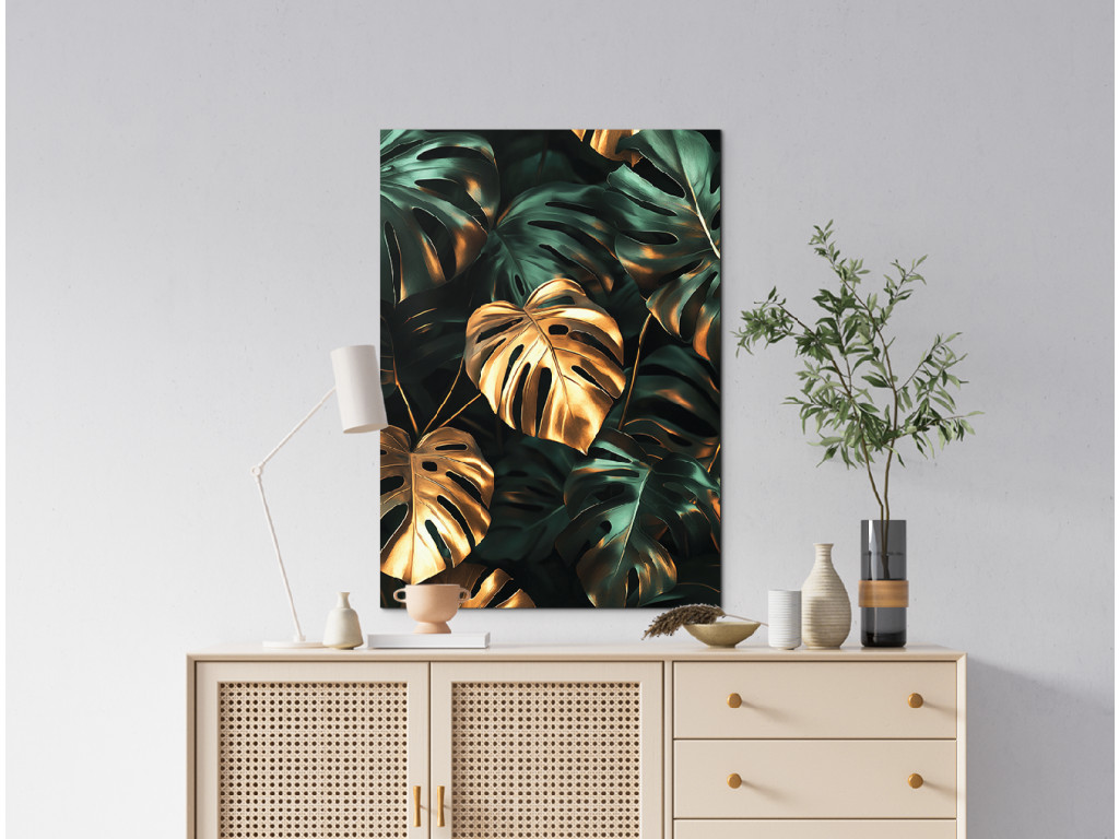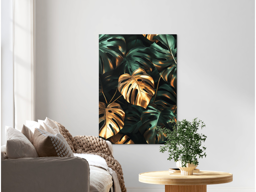 Die sonnenverwöhnte Luxus-Monstera fängt die Schönheit tropischer Blätter in erdigen Grüntönen ein, die sanft von einem goldenen Schimmer überzogen sind. Die goldenen Akzente wirken wie eine Reflexion des Sonnenlichts und verleihen dem Bild einen warmen und luxuriösen Look. Ideal für moderne Innenräume, denen es einen Hauch von Natur und Eleganz verleiht.