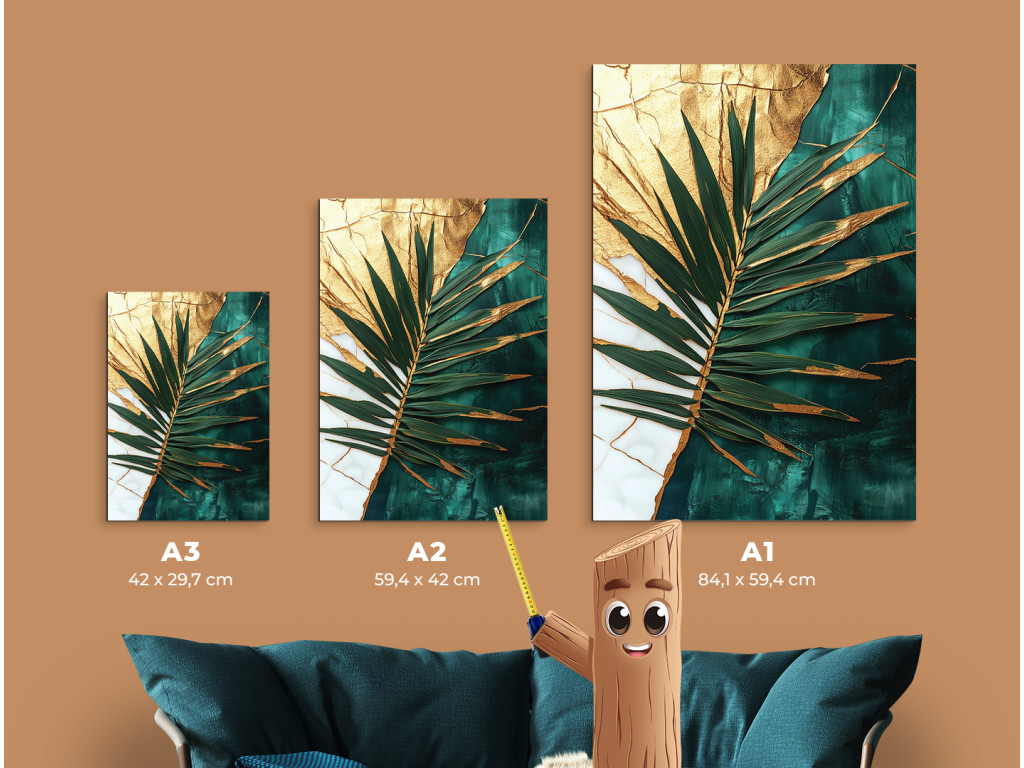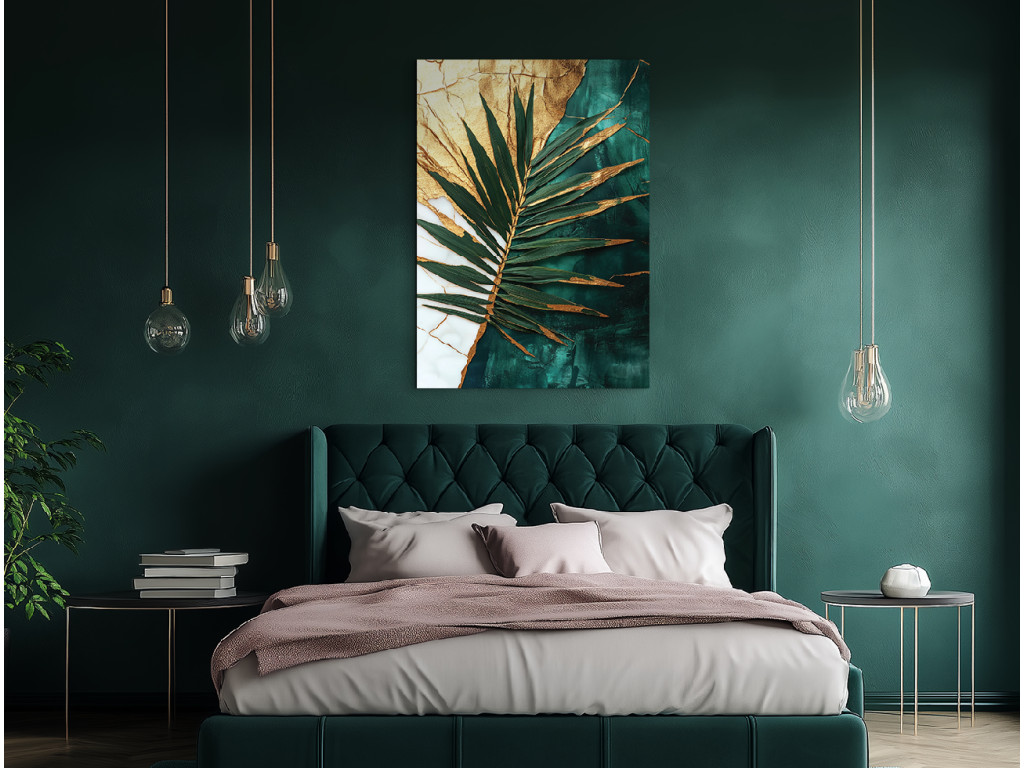 Golden Touch of Palm ist ein modernes Kunstwerk, das die Exotik der Natur mit der Eleganz von Gold verbindet. Das Detail des Palmblatts in Grün- und Türkistönen kontrastiert mit dem Hintergrund, der in eine goldene, rissige Textur und ein tiefes Marmorgrün unterteilt ist. Geeignet für stilvolle Innenräume, in denen sein raffinierter und zugleich ruhiger Charakter zur Geltung kommt.