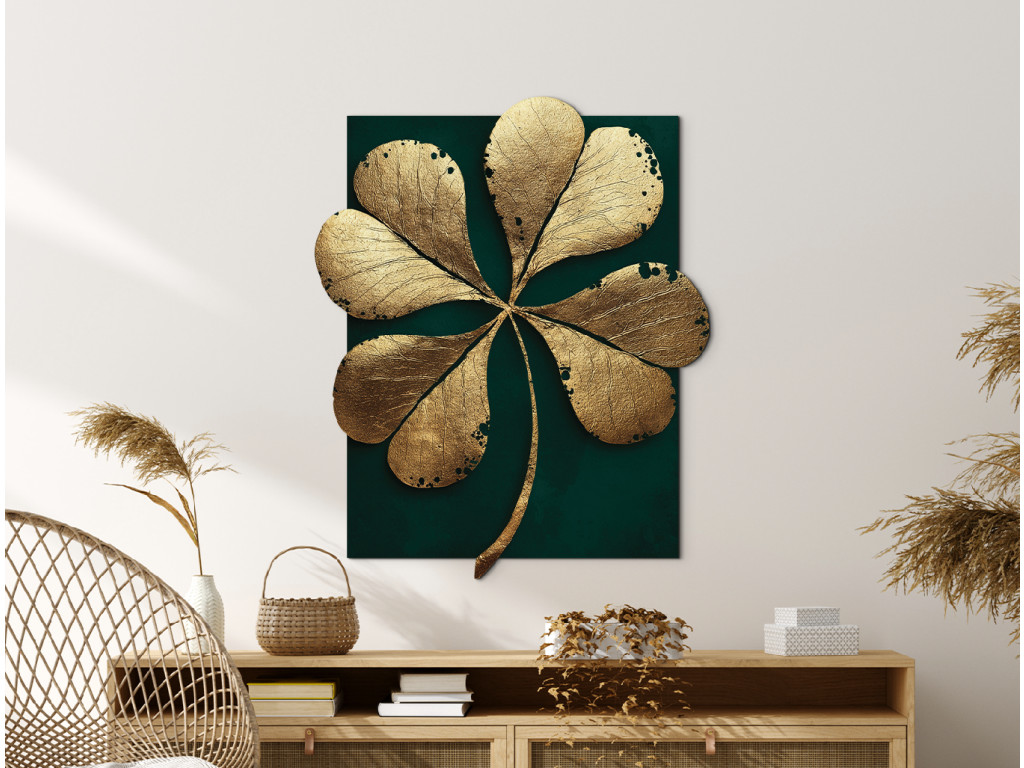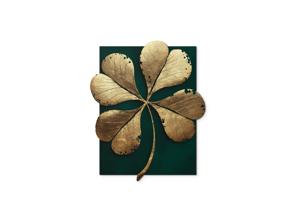 Das Bild Vierblättriges Kleeblatt zeigt das goldene Glückssymbol vor einem tiefschwarzen Hintergrund, der seine einzigartige, unregelmäßige Form hervorhebt. Die elegante Kombination aus Kontrast und Asymmetrie wirkt modern und verbirgt gleichzeitig einen Hauch von Mystik.