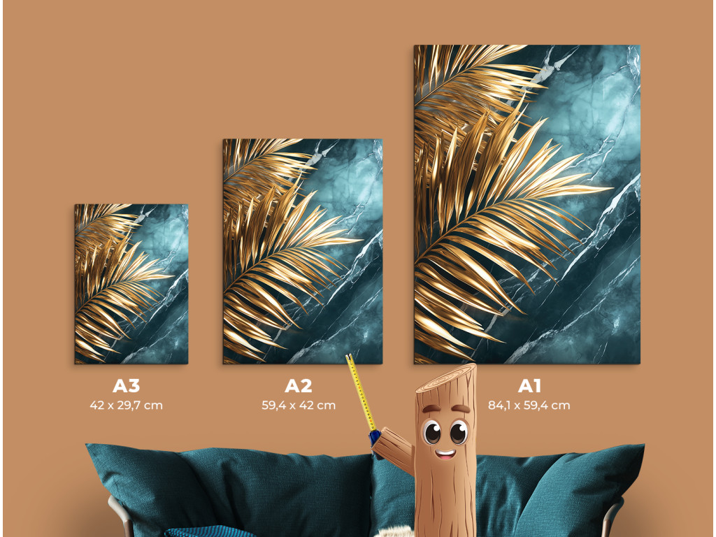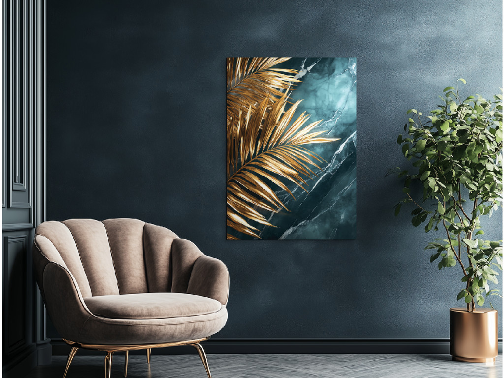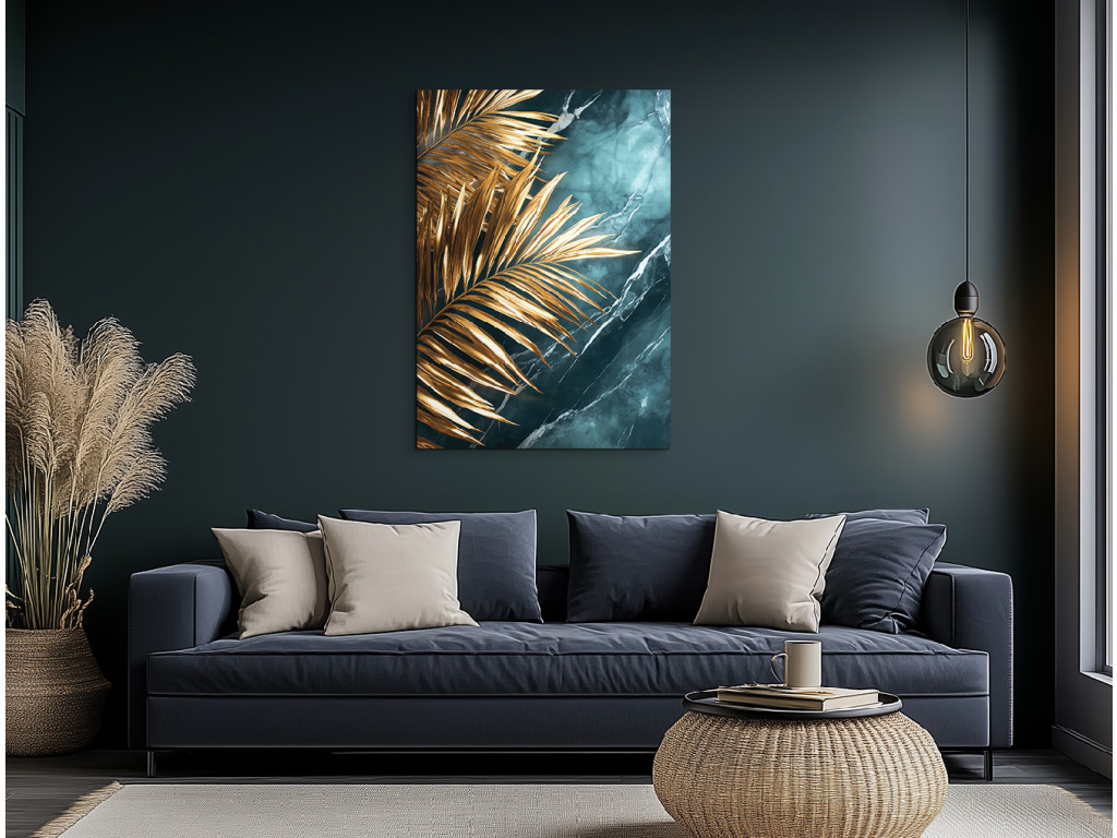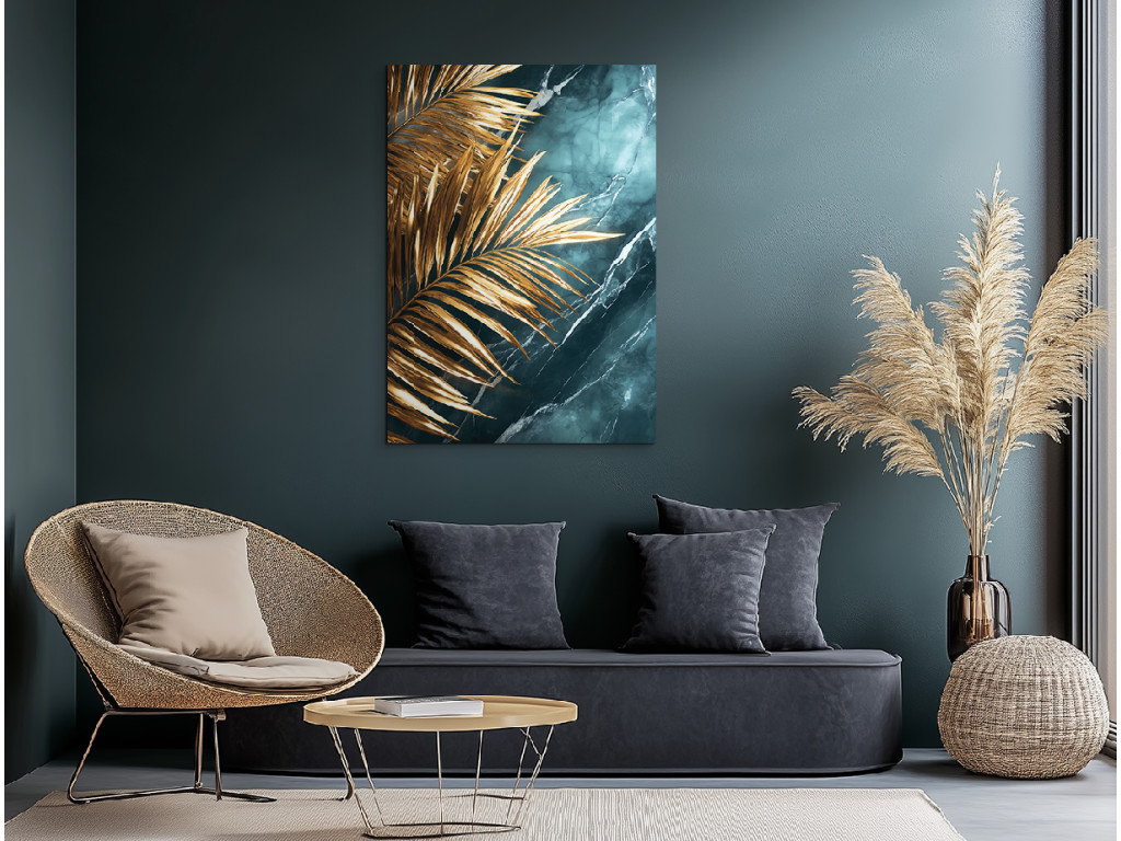 Das goldene Palmblatt wirkt dank des starken Kontrasts zwischen dem glänzenden Blatt und dem smaragdgrünen Marmorhintergrund luxuriös und zeitlos. Dieses elegante Bild verleiht dem Raum einen Hauch von Exotik und Raffinesse. Es kommt besonders gut an der Wand im Arbeitszimmer, im Flur oder in einem modern eingerichteten Wohnzimmer zur Geltung.