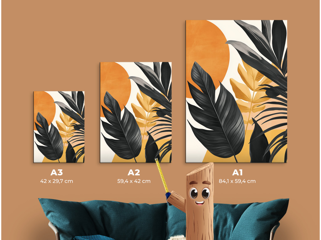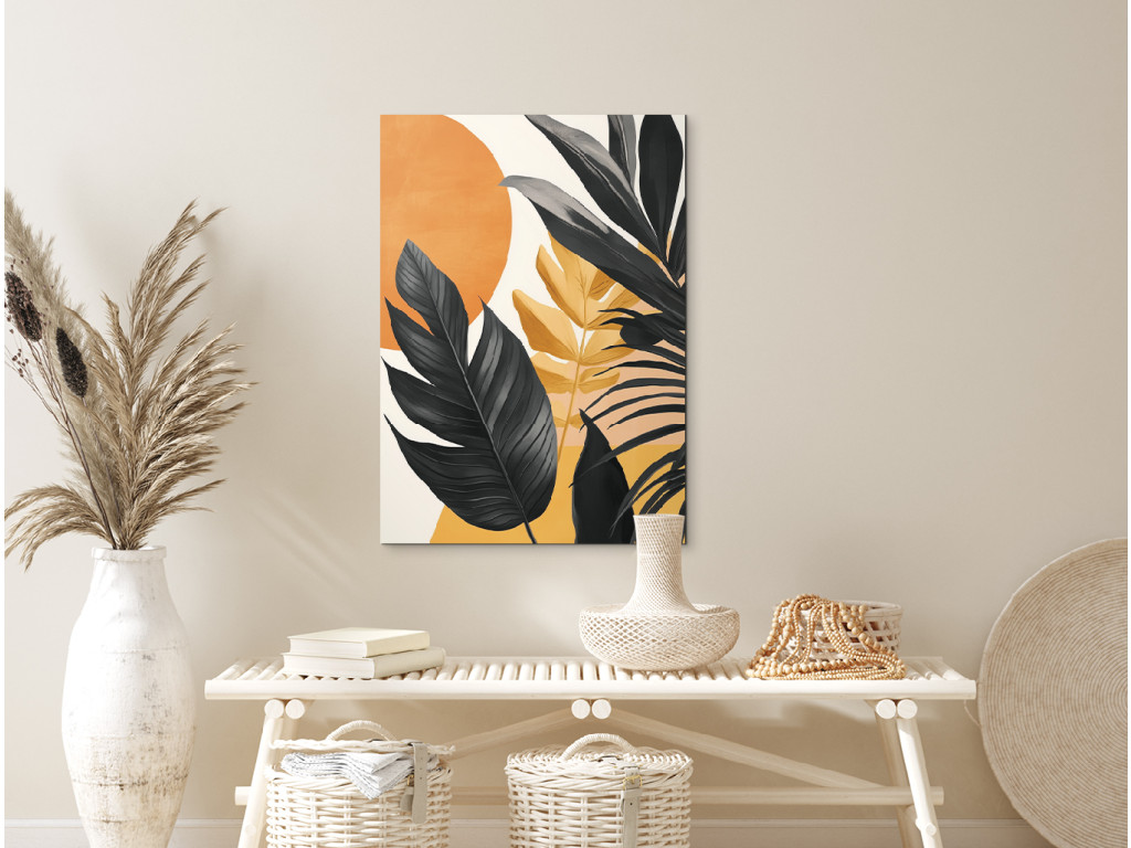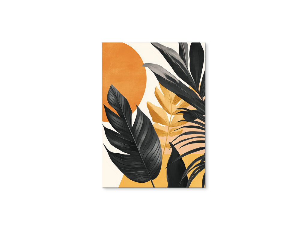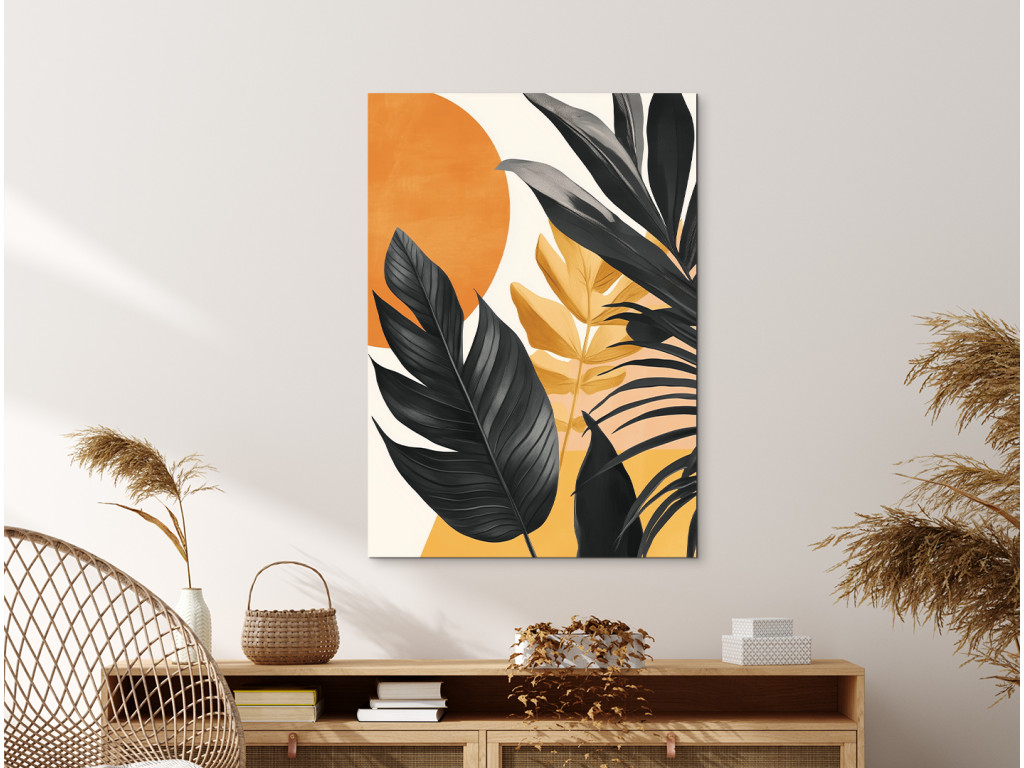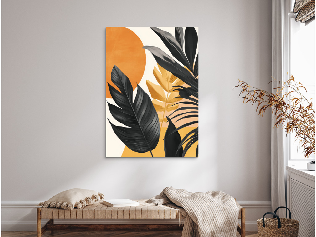 Tropische Blätter in modernem Design fangen die Silhouetten exotischer Blätter ein, die vom warmen Licht der untergehenden Sonne angestrahlt werden. Die Kombination aus Orange und Schwarz schafft einen starken Kontrast, der dem Raum gleichzeitig Energie und Ruhe verleiht.