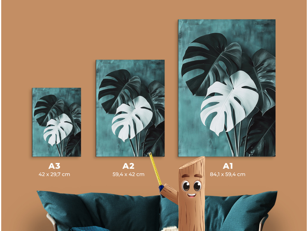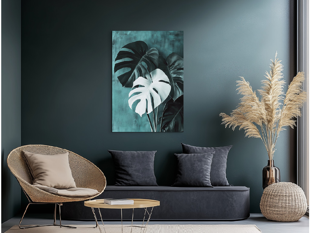 Die Dominante Monstera ist ein Designbild mit sanften Farbtönen, die zusammen eine harmonische und natürlich wirkende Komposition bilden. Gedämpfte, erdige Farben verleihen dem Bild Ruhe und Eleganz ohne störende Elemente. Eine ideale Ergänzung für das Schlafzimmer, die Leseecke oder ein Interieur im skandinavischen Stil.