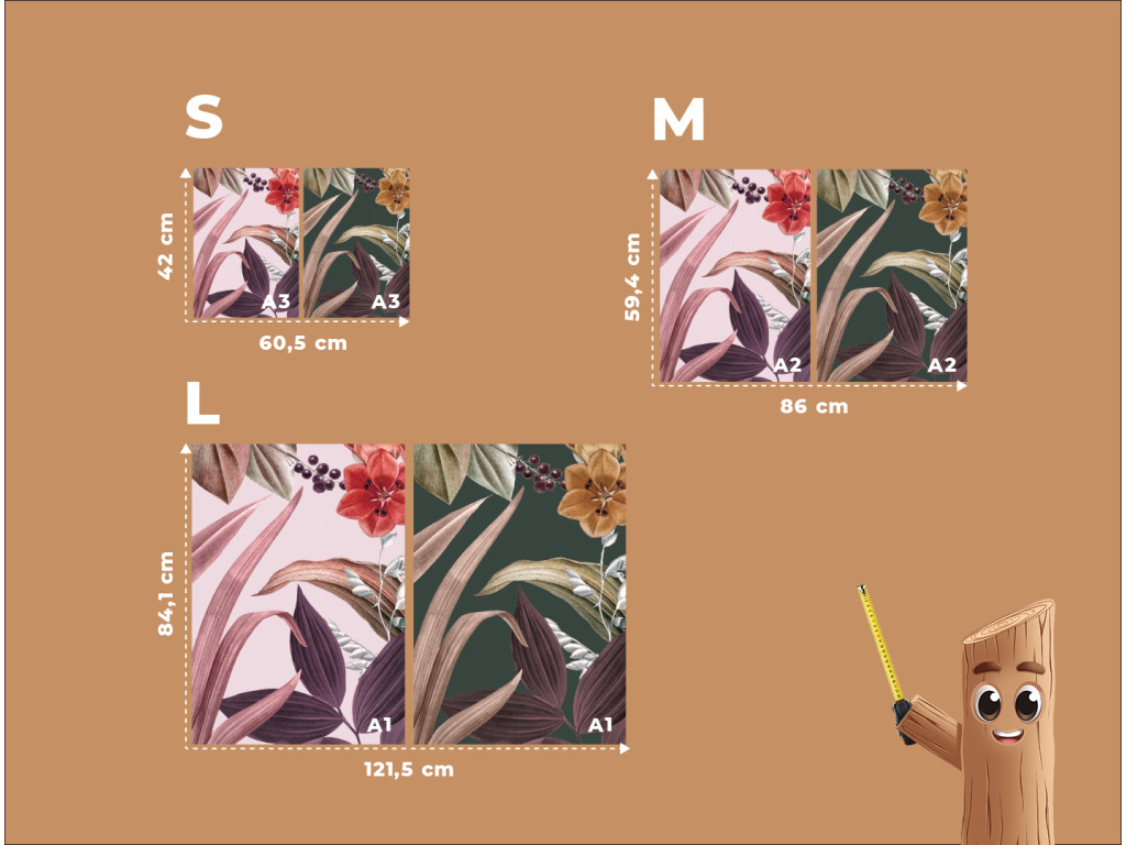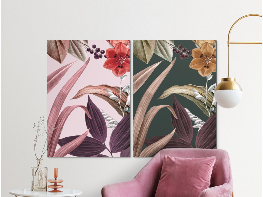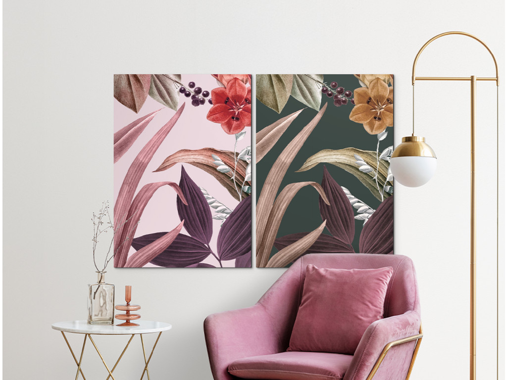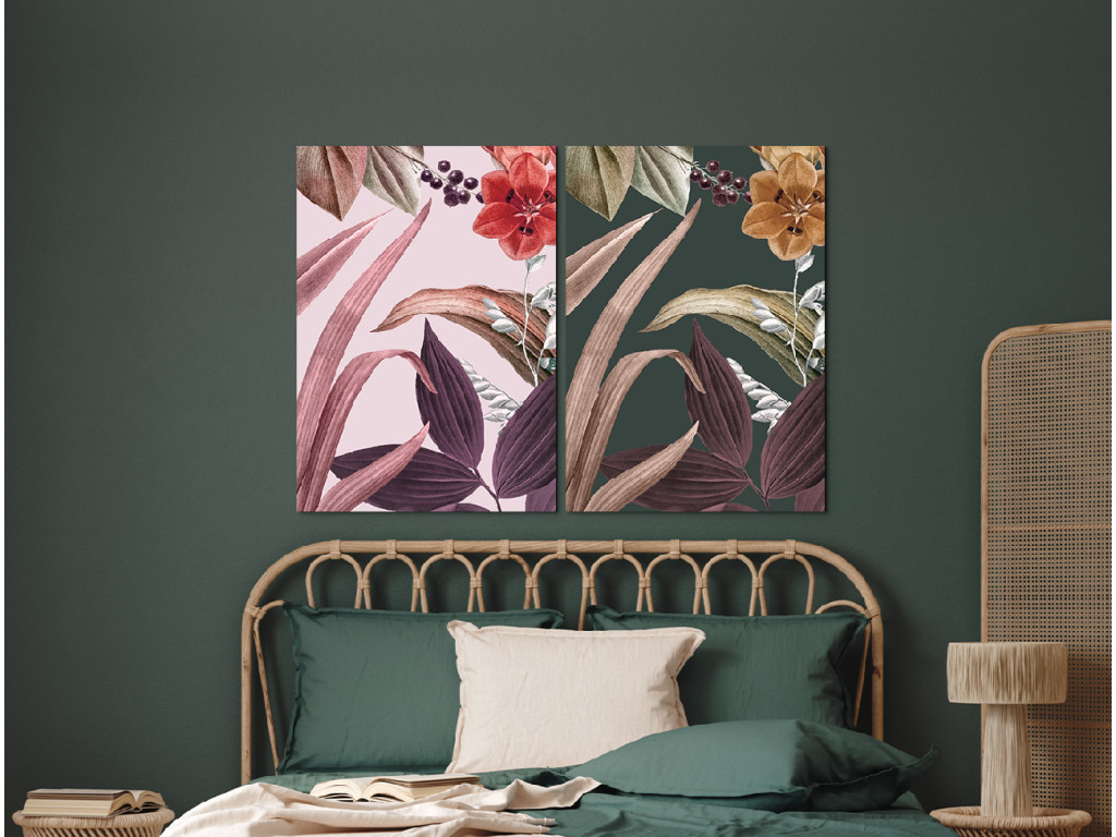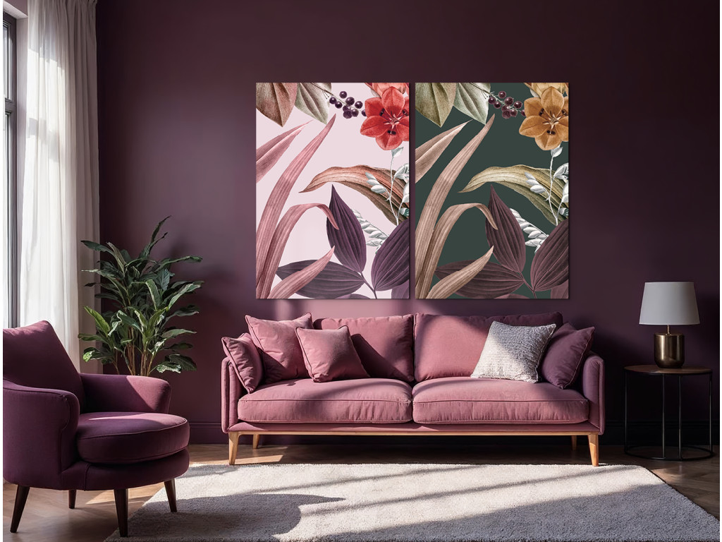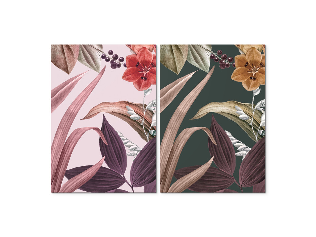 Blätter in Blüte ist ein zweiteiliges Bild, das die Zartheit der Blüten und die Eleganz der Blätter in einer doppelten Komposition mit verschiedenen Farbtönen vereint. Dank der Farbvariation wirkt das Bild lebendig, aber gleichzeitig ausgewogen und ästhetisch.