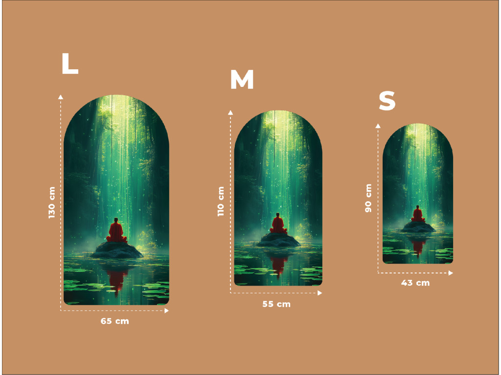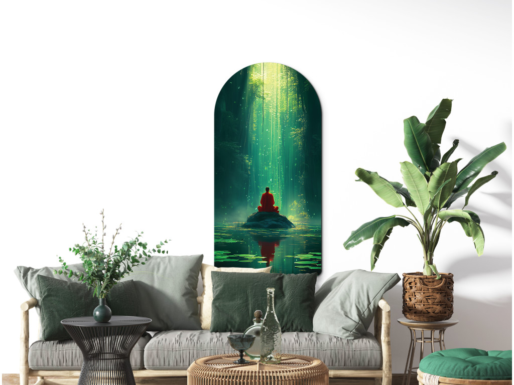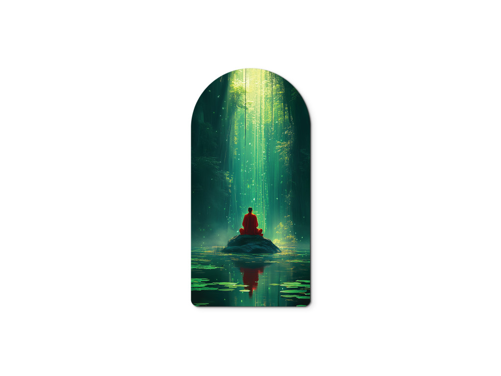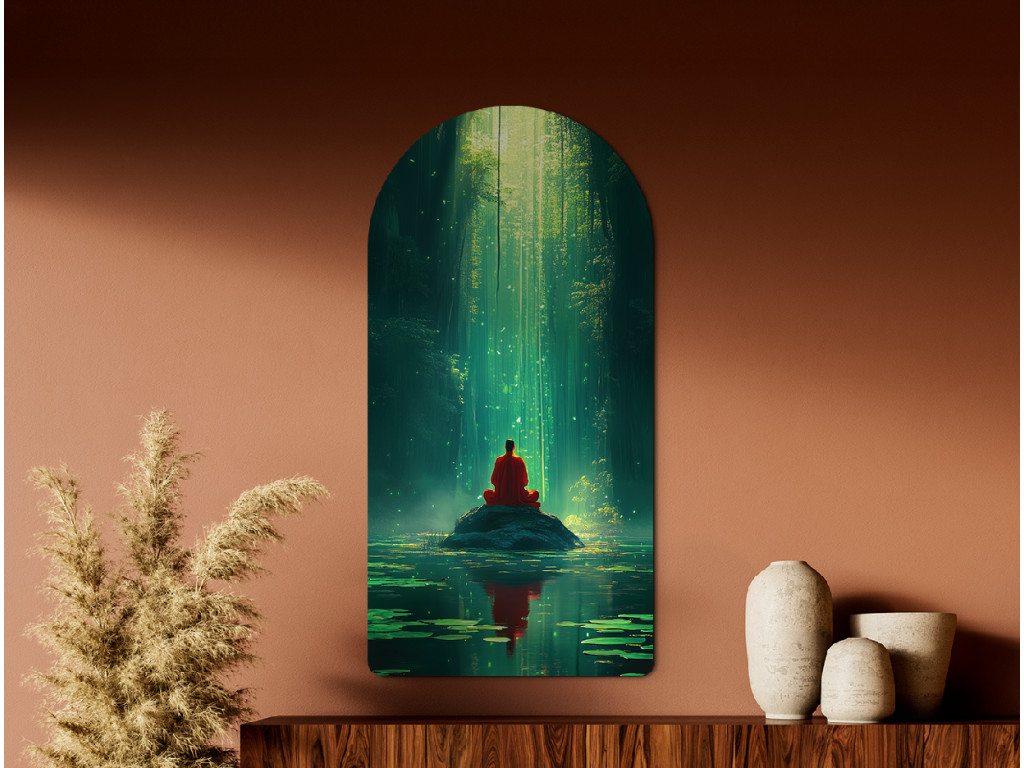 Das interessante Bild zeigt eine Figur in einem roten Gewand, die in Meditationshaltung auf einem Felsen inmitten eines Sees sitzt, umgeben von dichtem Wald und durchdringendem Licht. Die Szene wirkt ruhig und spirituell, mit einem Hauch von Mystik.