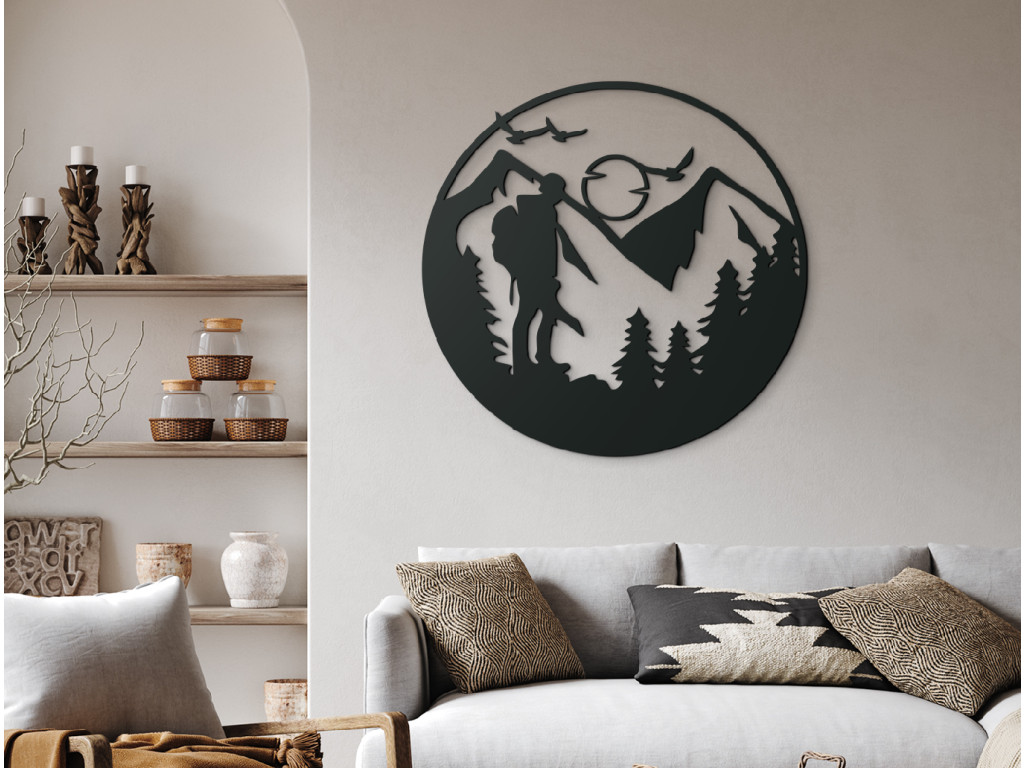 Die Dekoration zeigt eine Figur auf einem Wanderausflug, die das Panorama der Berge und der Natur genießt . Es ist eine Einladung, in die Wildnis zu entkommen und die Schönheit zu entdecken, die uns umgibt.