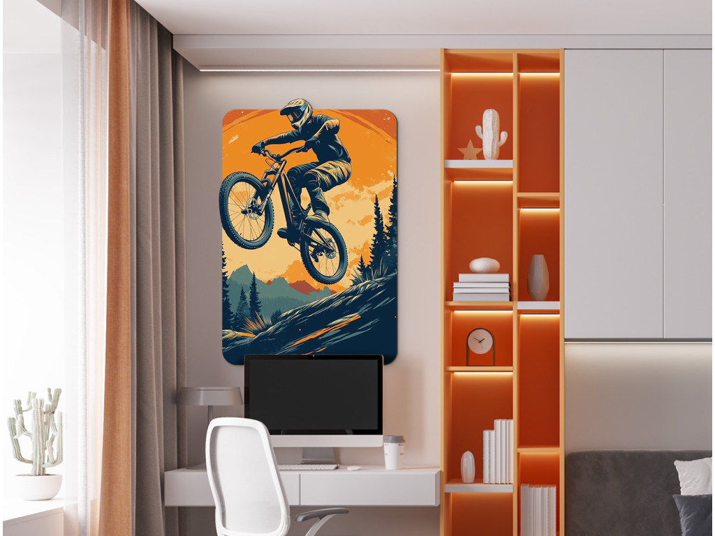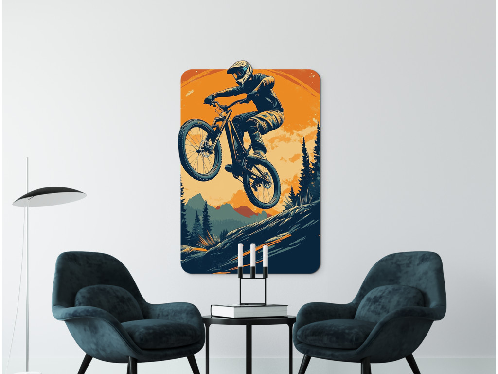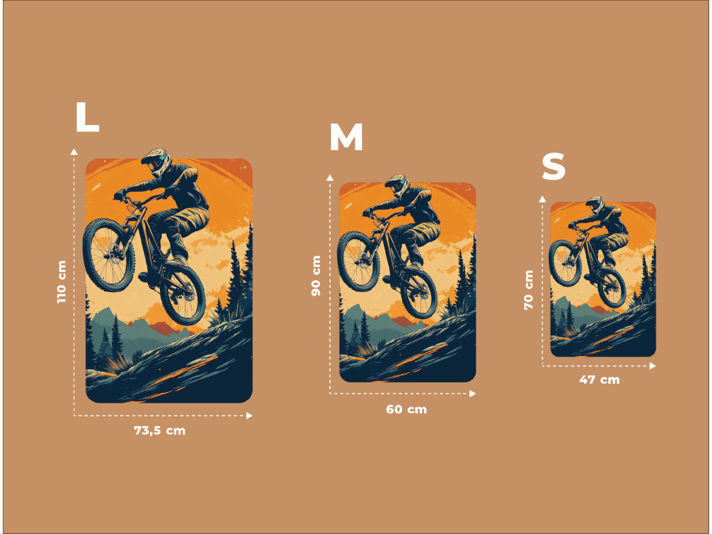 Das Bild zeigt einen Mountainbiker in rauer Naturlandschaft – über Hänge, Wurzeln und Steine. Die dynamische Szene unterstreicht die Kraft, das Gleichgewicht und den Abenteuergeist dieses Sports. Geeignet für alle Natur- und Adrenalinliebhaber.