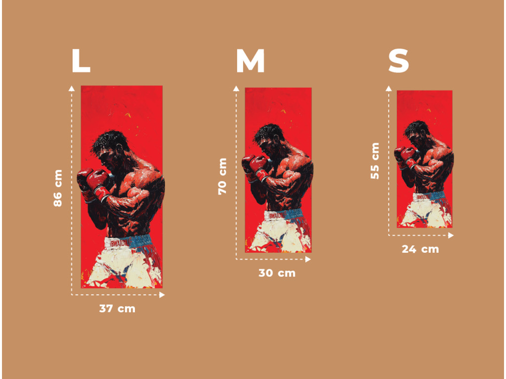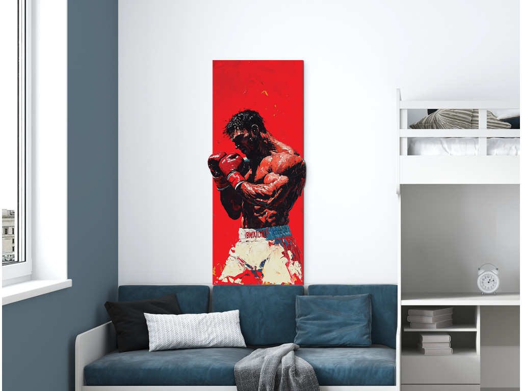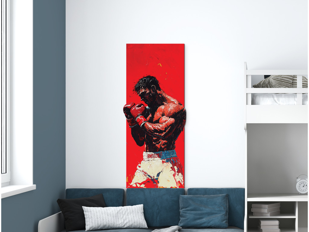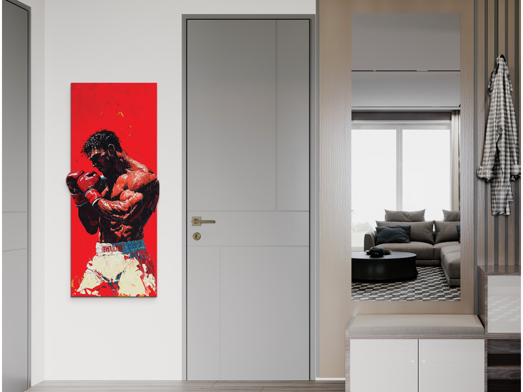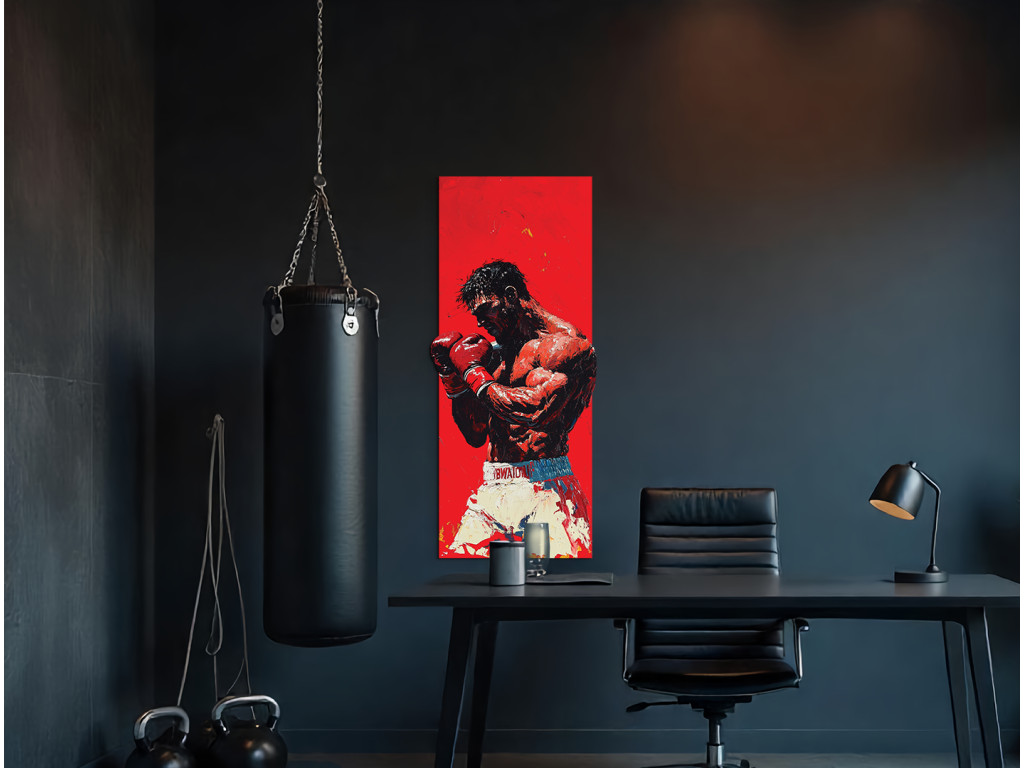 Das Bild zeigt eine Boxerfigur in dynamischer Kampfhaltung mit roten Handschuhen und weißen Shorts. Der intensive rote Hintergrund verstärkt das Gefühl von Kraft, Spannung und Konzentration.