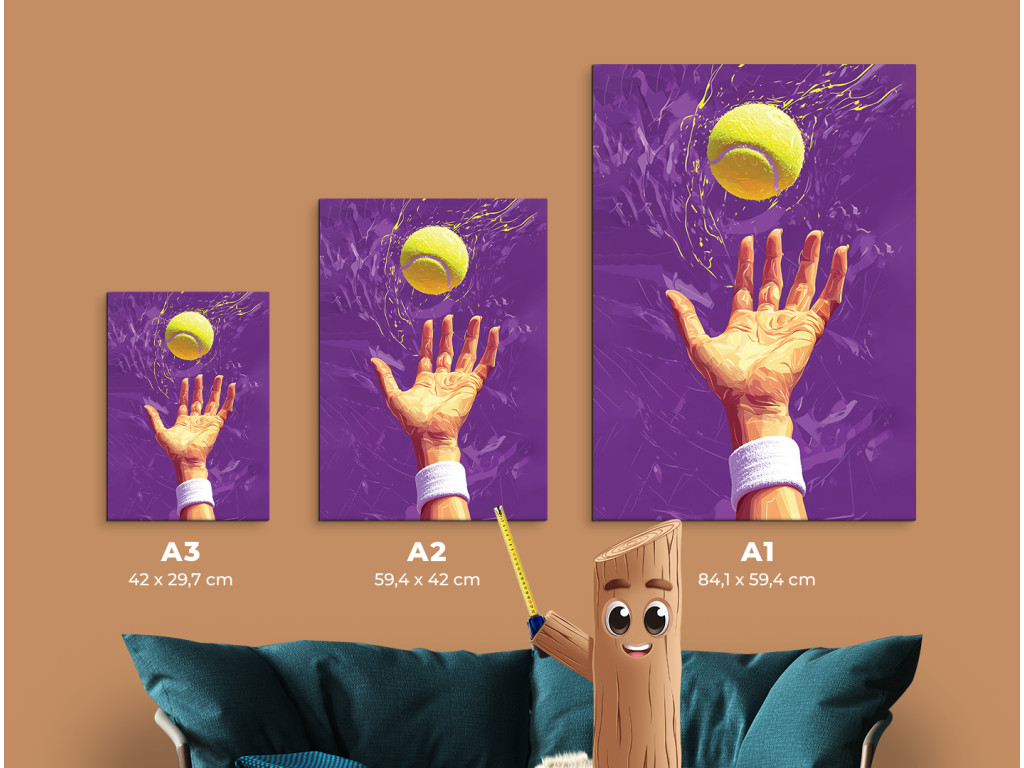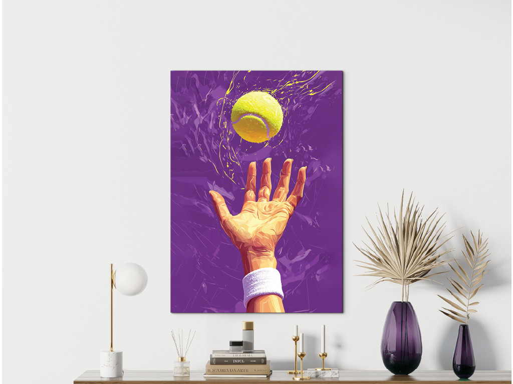 Künstlerische Darstellung eines Tennisaufschlags mit Fokus auf den Moment des Ballabwurfs. Der gelbe Ball kontrastiert mit dem violetten Hintergrund und fängt so die Dynamik und Spannung dieses sportlichen Moments ein.