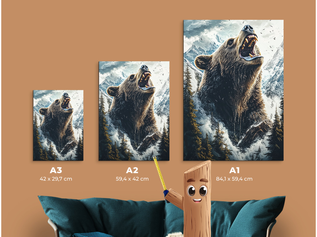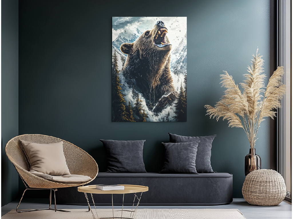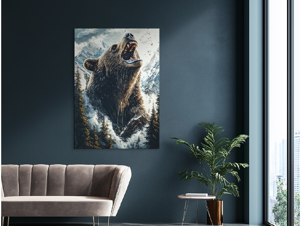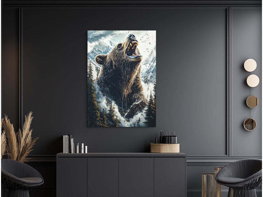 Der Bär des Nordens ist ein außergewöhnliches Bild, das einen Bären in voller Kraft inmitten einer wilden Winterlandschaft zeigt. Er steht umgeben von hohen Nadelbäumen, den Kopf zum Himmel erhoben und das Maul geöffnet – als würde sein Brüllen durch die Berge hallen. Im Hintergrund zeichnen sich majestätische, schneebedeckte Gipfel ab, und der dramatische Himmel mit Wolken unterstreicht die Atmosphäre der ungezähmten Natur. Diese Szene verkörpert Kraft, Respekt und pure Wildnis.