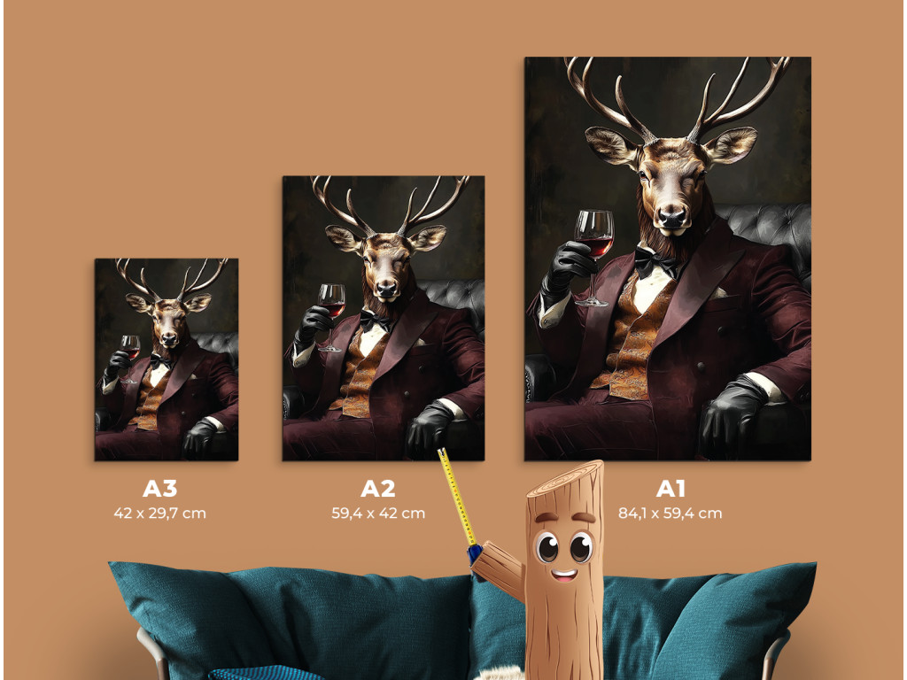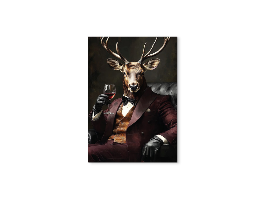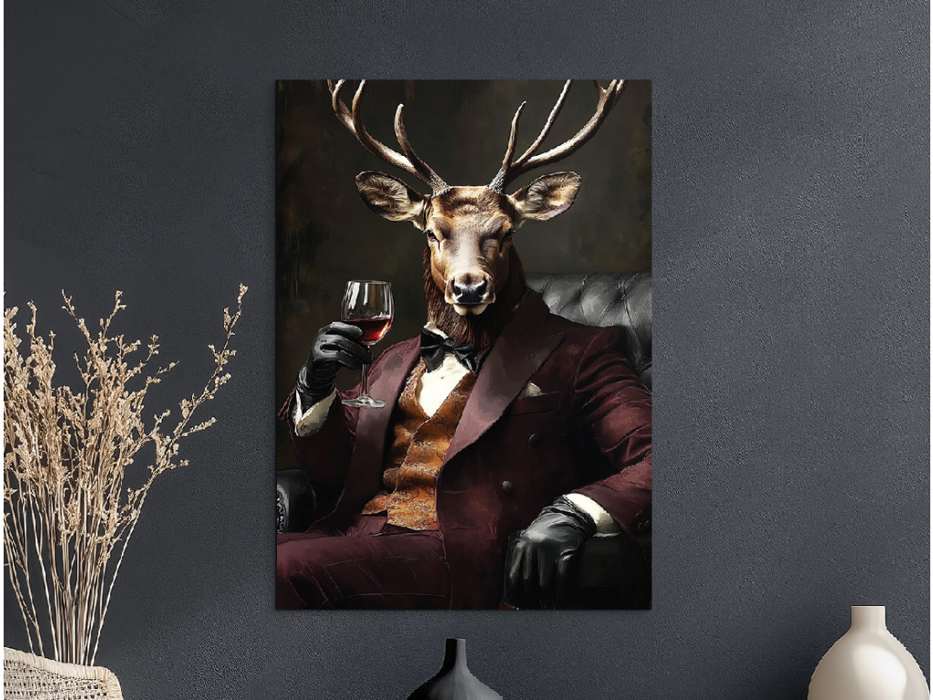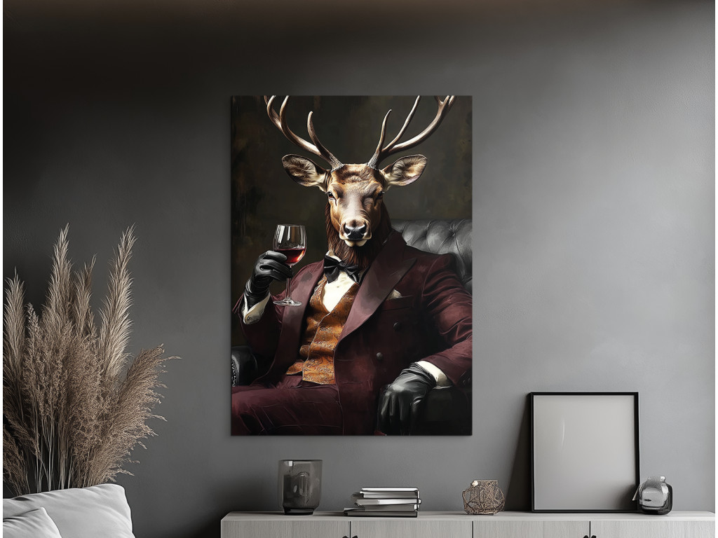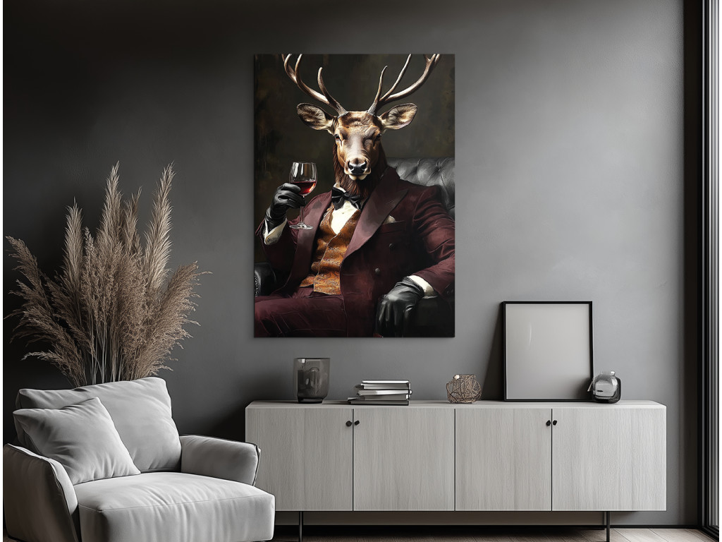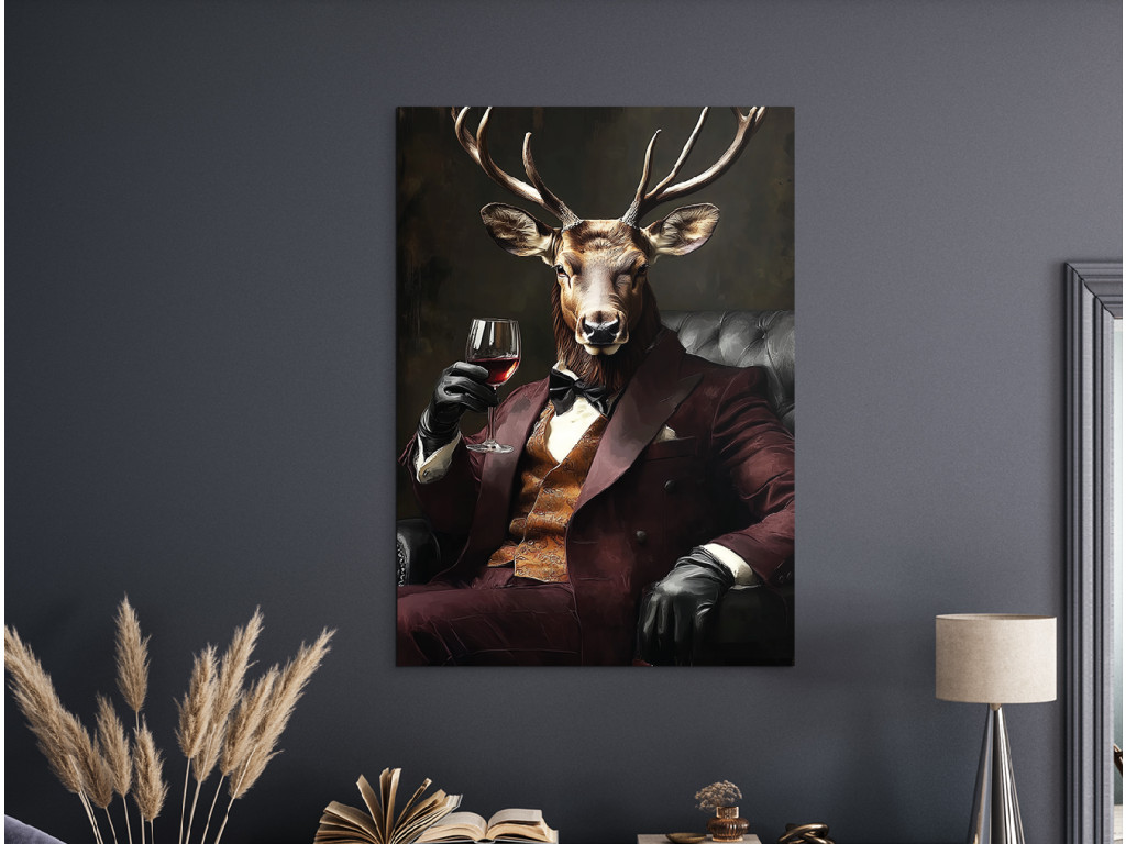 Der Gentleman-Hirsch ist ein witziges und zugleich stilvolles Kunstwerk, das einen Hirsch mit imposantem Geweih zeigt, der in einem eleganten Anzug mit Fliege gekleidet ist und in einem bequemen Sessel ein Glas Rotwein genießt. Dieses Bild ist ideal als markantes und unterhaltsames Element für ein modernes Ambiente, ein Büro oder einen stilvollen Salon – für alle, die Kunst mit Humor mögen.