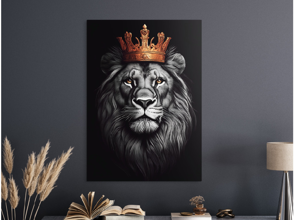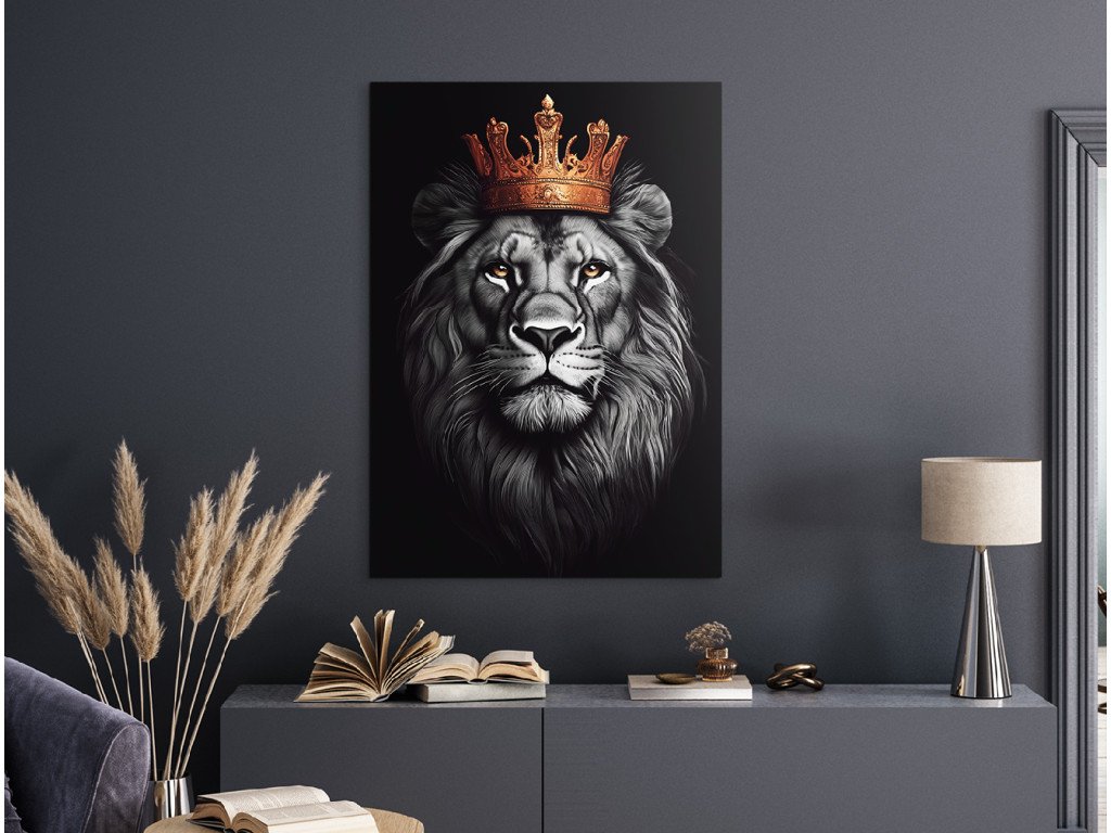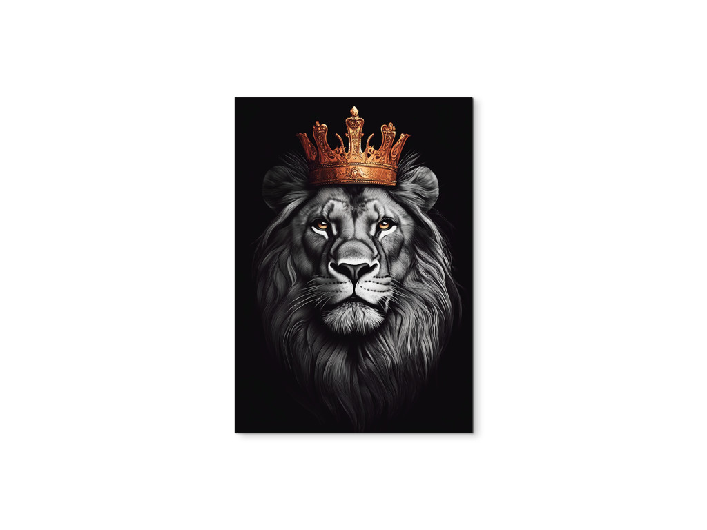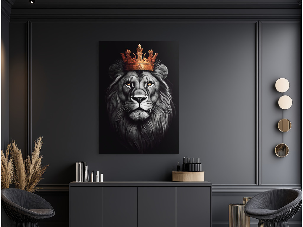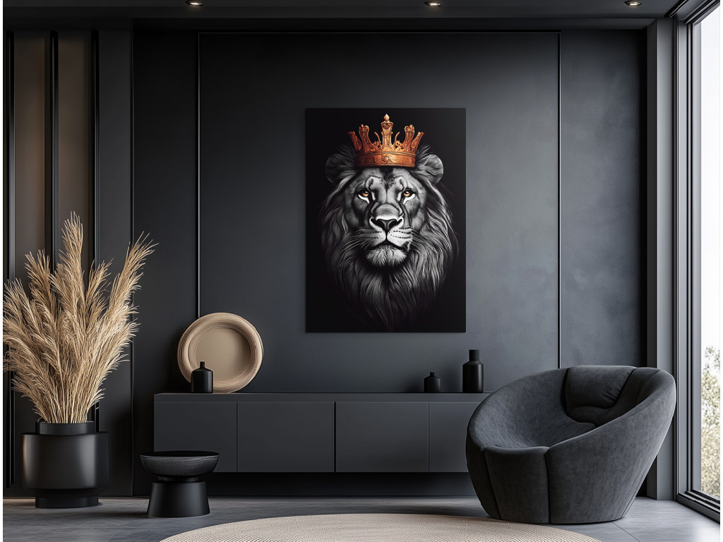Der gekrönte König ist ein beeindruckendes Porträt eines Löwen mit einer majestätischen goldenen Krone, das Würde, Kraft und Ruhe verkörpert. Der stolze Blick des Löwen und der Kontrast zwischen den Grau- und Schwarztönen seiner Mähne und der leuchtenden goldenen Krone schaffen ein dramatisches und zugleich elegantes Bild. Der dunkle Hintergrund verstärkt die Intensität des Ausdrucks und macht das Bild zu einem außergewöhnlichen Blickfang in jedem Raum. Ideal für Innenräume, die ein Gleichgewicht zwischen Kraft und Eleganz suchen.