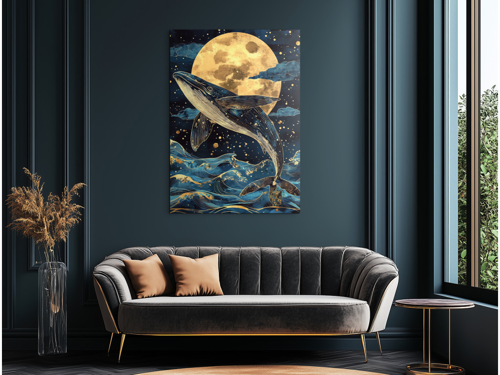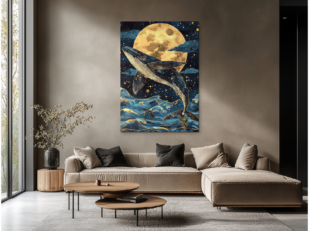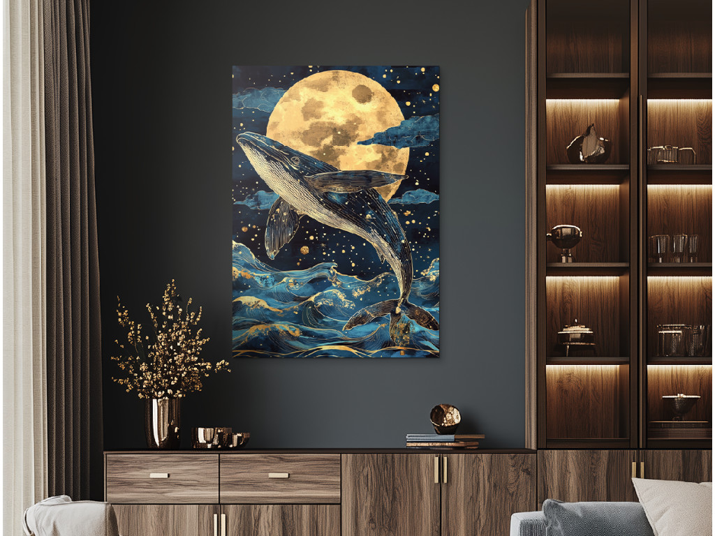 Der Mondgesang des Walfischs fängt einen Buckelwal in dem Moment ein, in dem er aus der Dunkelheit des Ozeans in den sanften Schein des Mondes auftaucht. Die goldenen Reflexe des Mondlichts brechen sich auf den dunkelblauen Wellen, während die stille Spannung von Wasser und Licht eine fast traumhafte Atmosphäre schafft. Der verlangsamte Moment, in dem der riesige Körper das Licht berührt, wirkt überirdisch – wie ein uraltes Ritual zwischen Himmel und Tiefe. Das Bild ist kraftvoll, poetisch und strahlt Ehrfurcht vor der Natur und der Stille der Nacht aus.