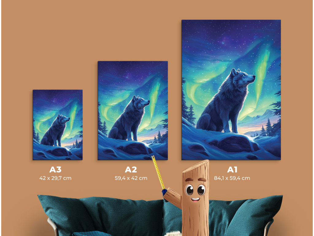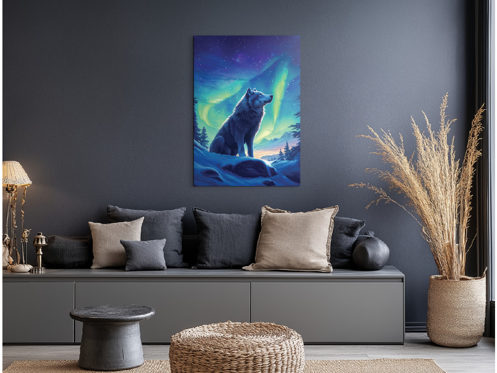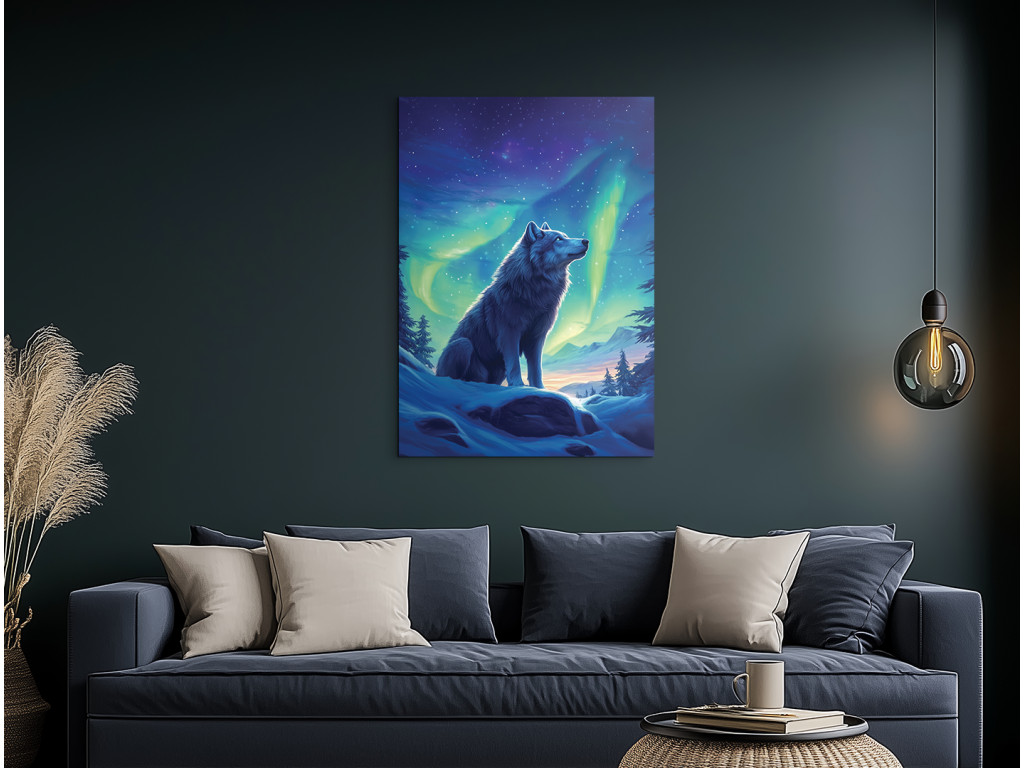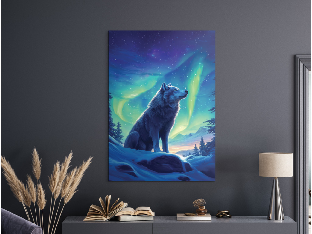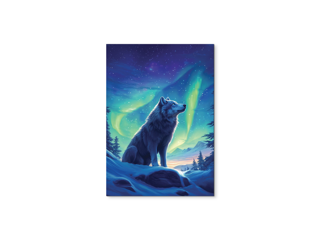 Der nächtliche Beobachter fängt einen einsamen Wolf ein, der in der tiefen Stille der verschneiten Landschaft sitzt, während sein Blick auf den vom Polarlicht erhellten Himmel gerichtet ist. Die kühlen Grau- und Weißtöne seines Fells kontrastieren mit dem Tanz der grünen und blauen Lichter, die den Nachthimmel mit geheimnisvoller Schönheit erfüllen. Verschneite Bäume säumen die Szene und verleihen dem Bild Tiefe und ein Gefühl nordischer Einsamkeit. Diese Szene verkörpert Ruhe, Kraft und Respekt vor der Natur.