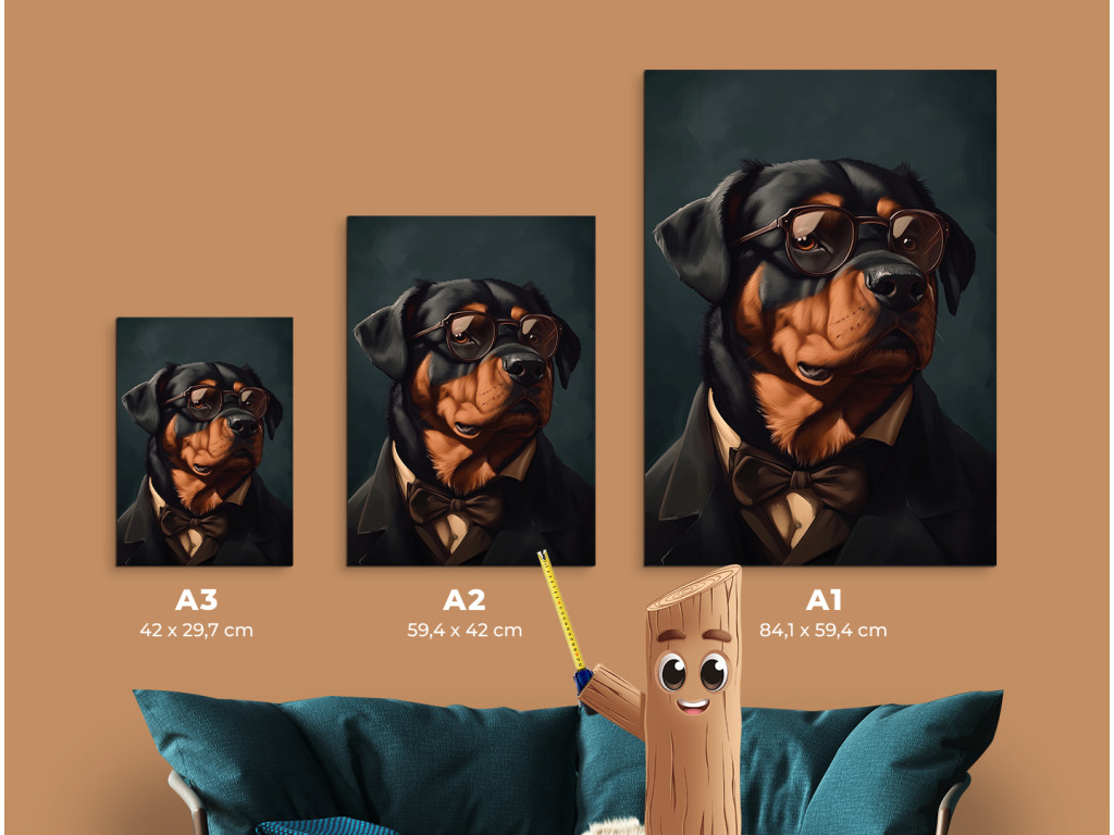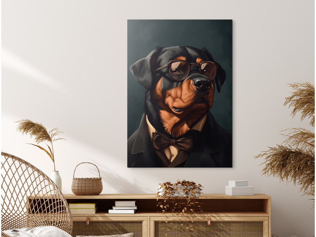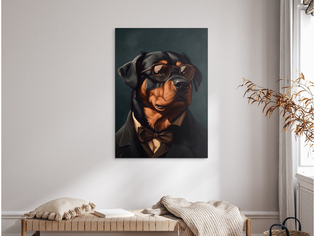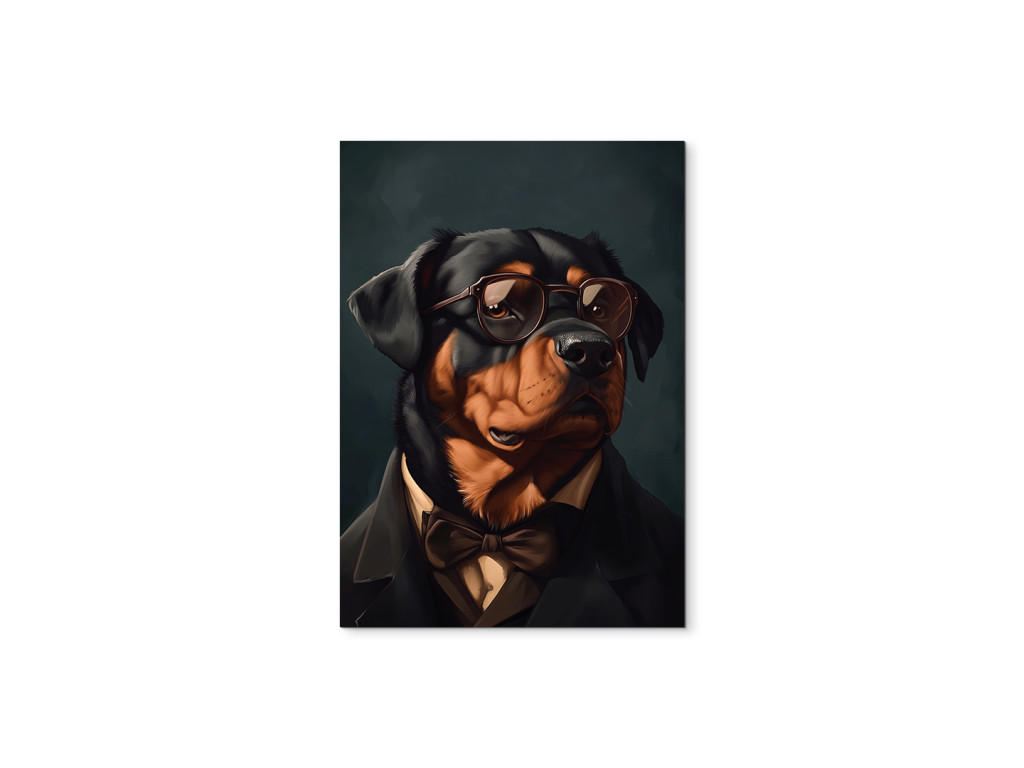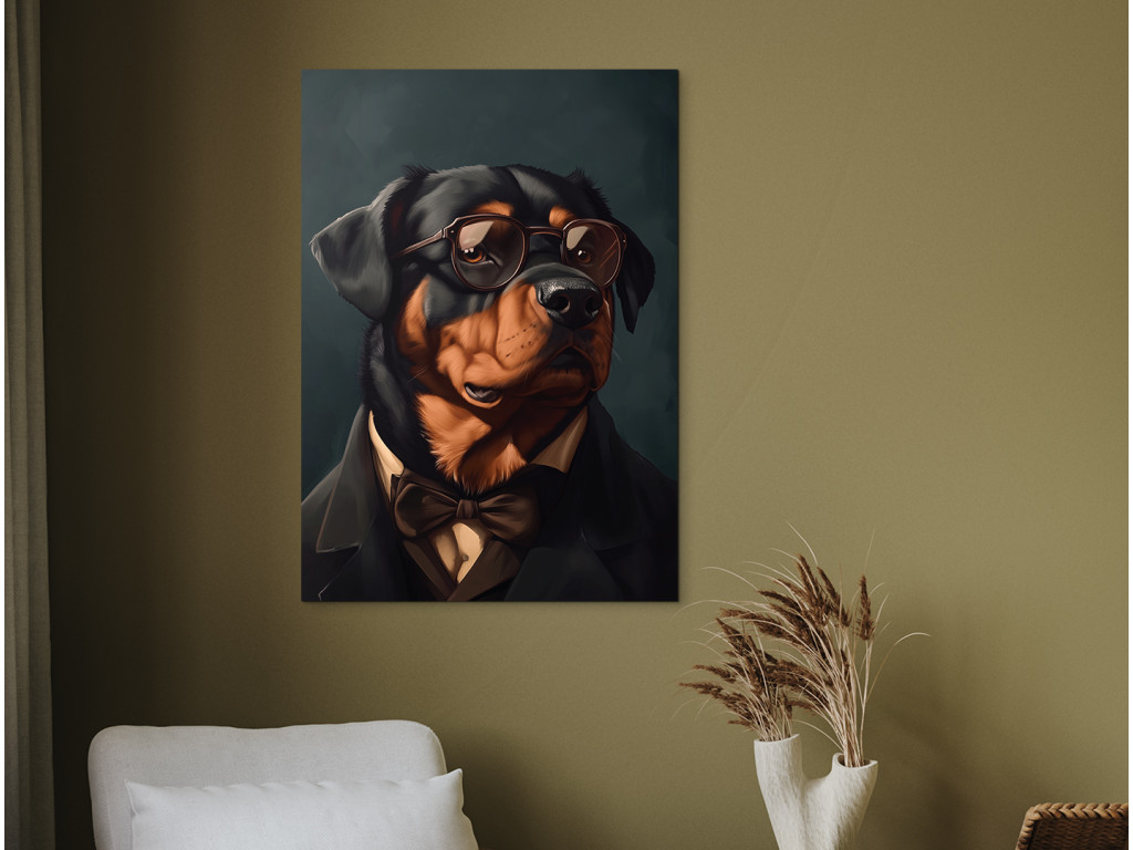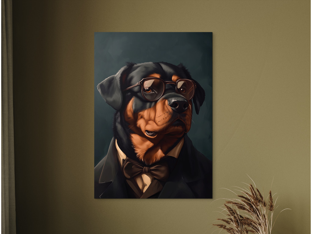 Rottweiler mit Haltung ist ein ausdrucksstarkes Porträt einer starken Rasse in einer ungewöhnlichen, eleganten Form. Gekleidet in einen schwarzen Anzug, ein weißes Hemd und eine braune Fliege, mit Sonnenbrille auf den Augen, wirkt er wie ein charismatischer Herr mit Stil und Autorität. Der dunkle Hintergrund hebt seine Figur und seinen Ausdruck hervor und schafft so ein Bild voller Kontraste zwischen Rauheit und Noblesse. Ideal für diejenigen, die Hunde mit Persönlichkeit lieben und etwas Ausgefallenes und Originelles für ihre Einrichtung suchen.