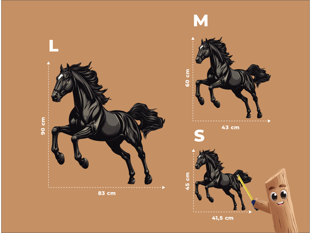 Die dynamische Wanddekoration zeigt die Silhouette eines schwarzen Hengstes in vollem Galopp. Sein kräftiger Körper und seine wehende Mähne verkörpern Freiheit, Kraft und unbändige Energie – ein perfektes Symbol für Ungebundenheit und Eleganz in Bewegung.